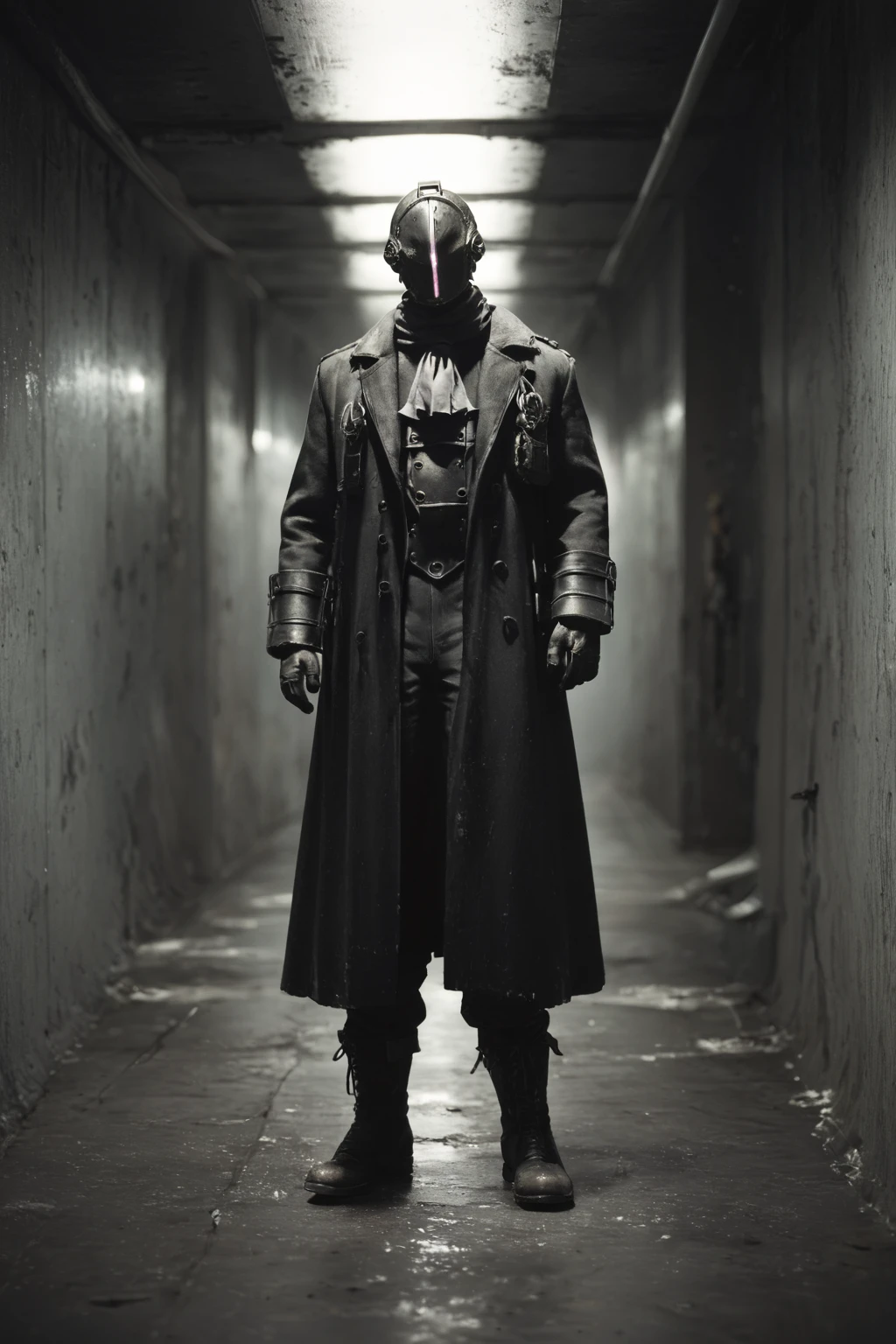 Bondrewd, male, black coat, overcoat, ascot, black gloves, helmet, masked, long sleeves, black boots, black pants