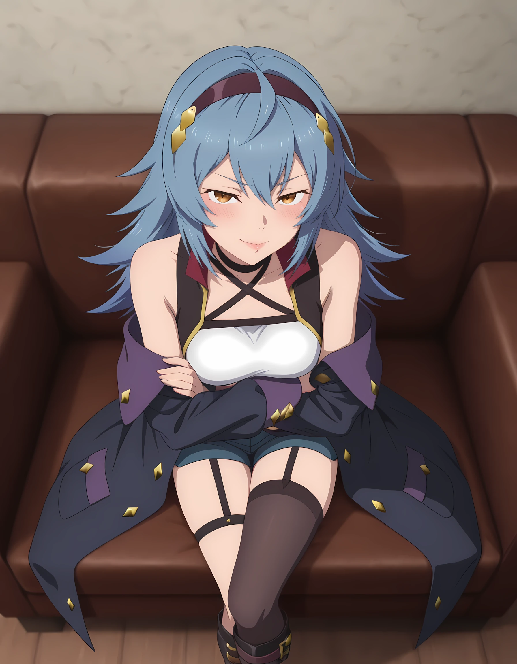 Default: knee boots,shorts,garter straps,sleeveless shirt,hair ornament,coat,asymmetrical legwear,single thighhigh,choker,white shirt,blue shorts,hairband,black boots