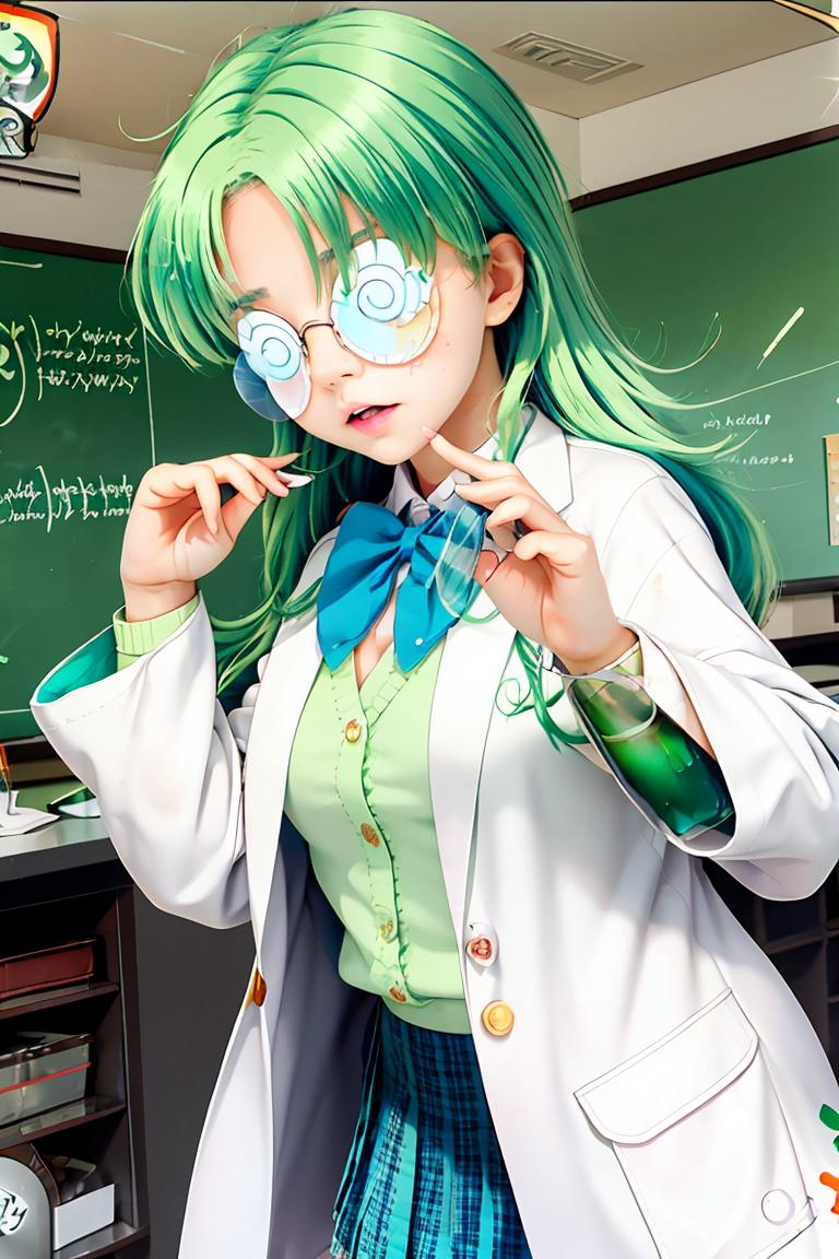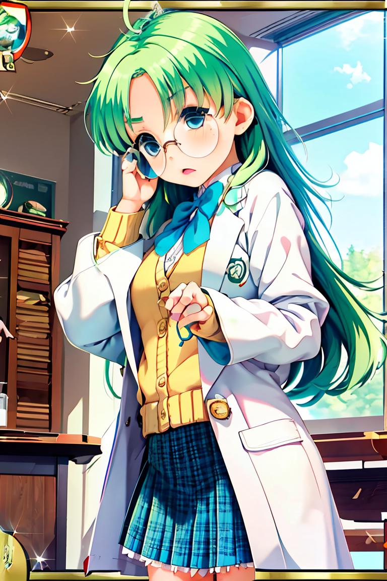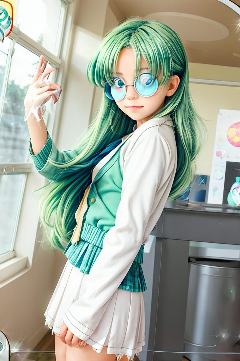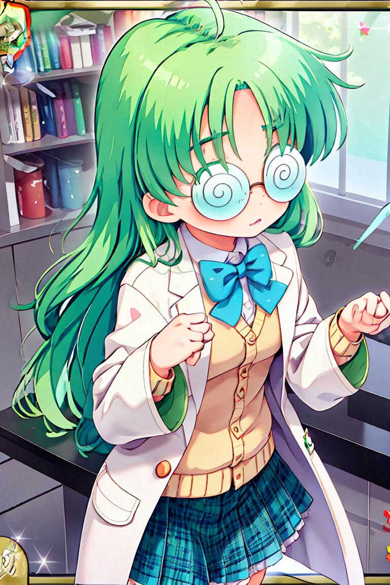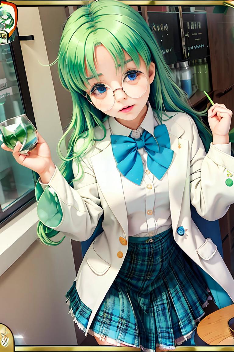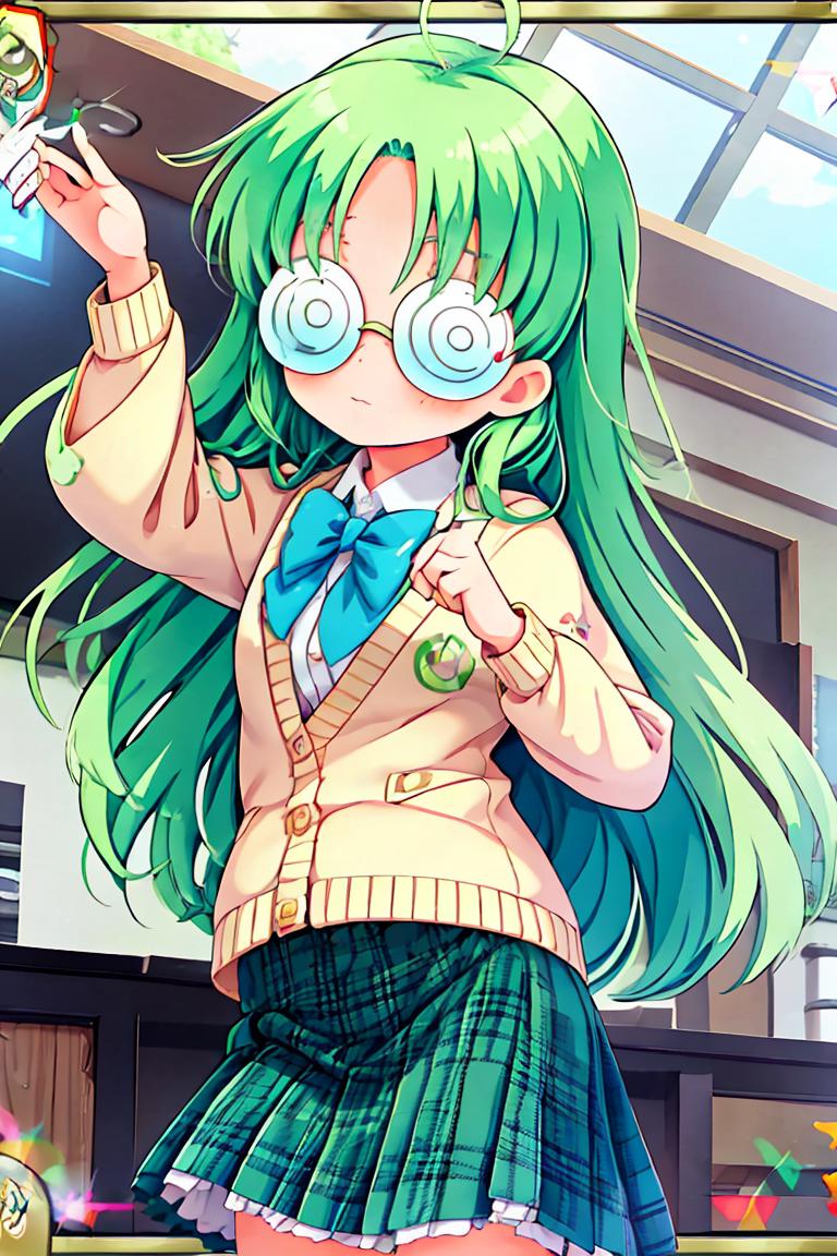 green hair, ahoge, long hair, glasses, coke-bottle glasses, opaque glasses, round eyewear, blue eyes, green eyes