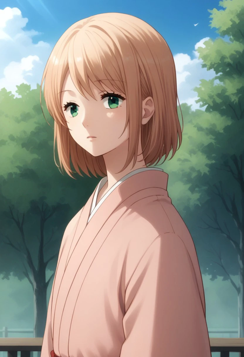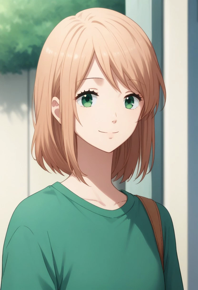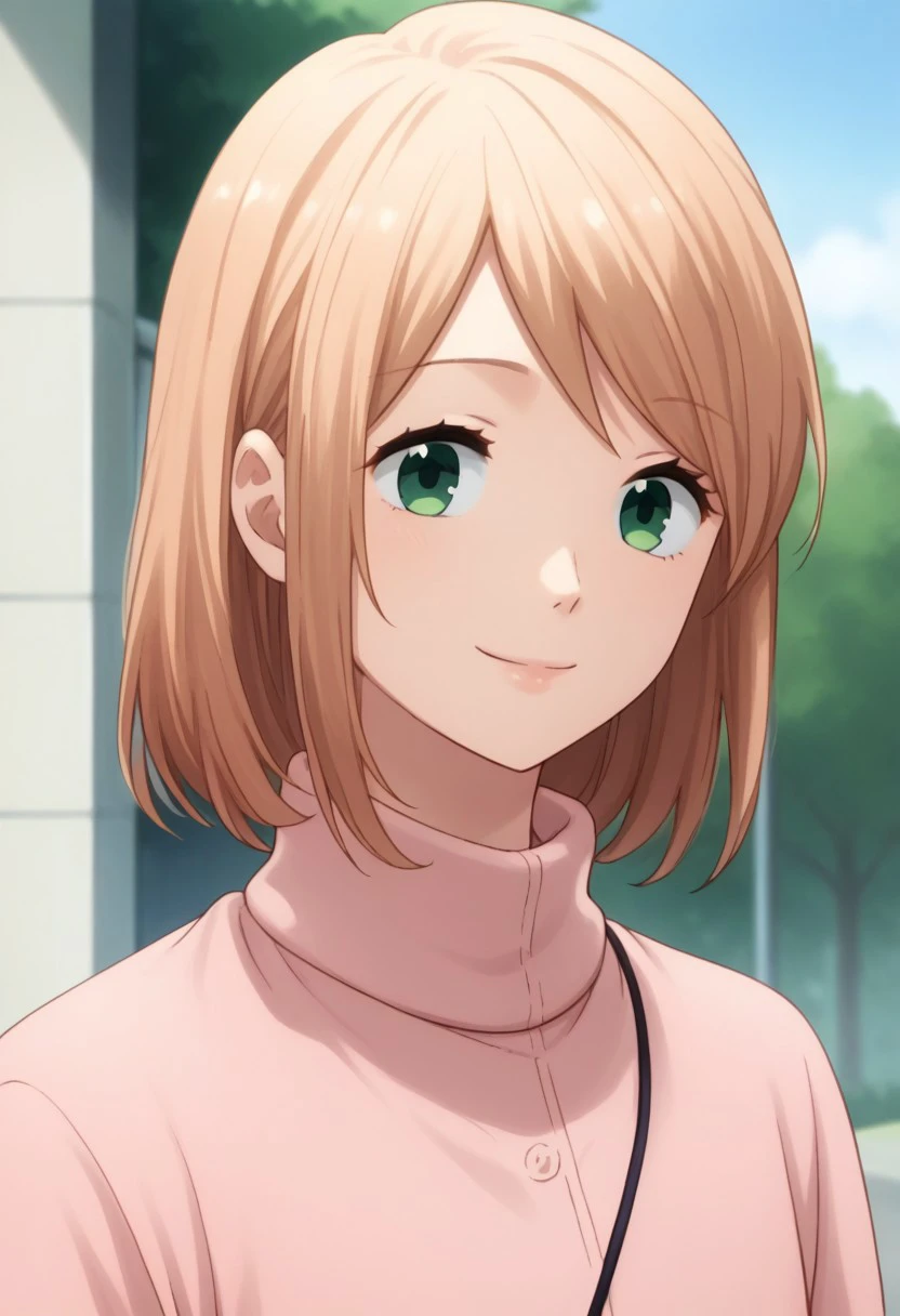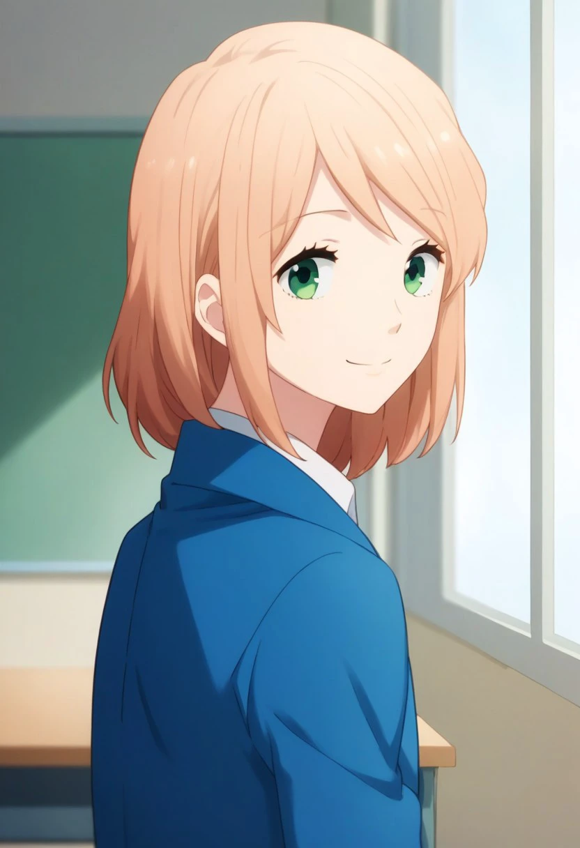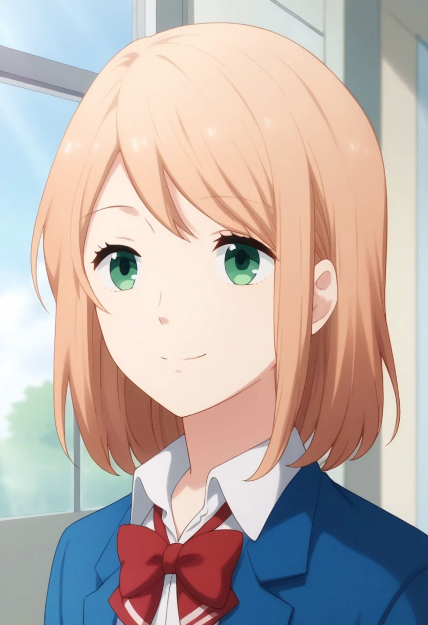 anna, 1girl, school uniform, green eyes, jacket, shirt, bow, white shirt, blue jacket, collared shirt, blazer, red bow, medium hair, bowtie, bangs, peach blonde hair,