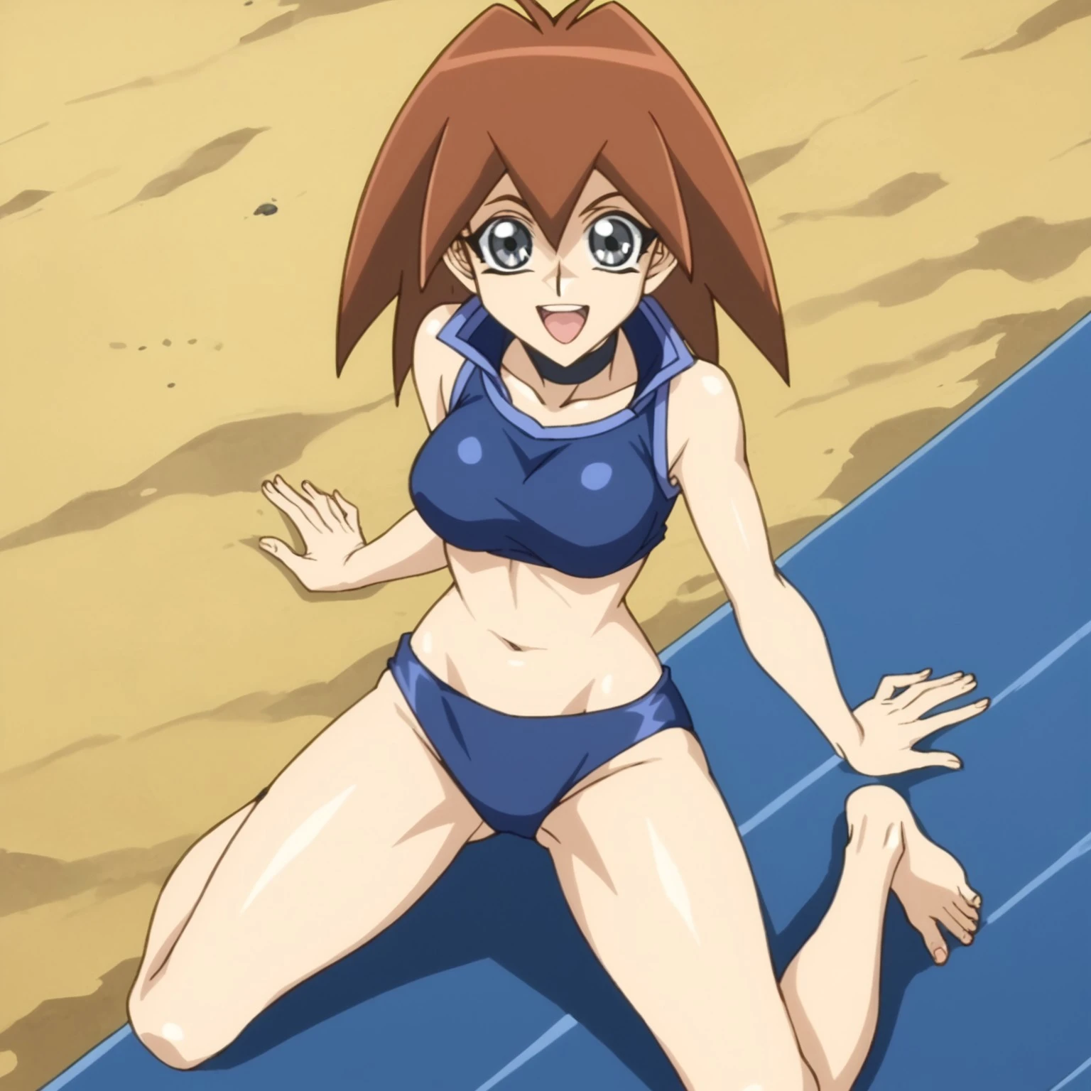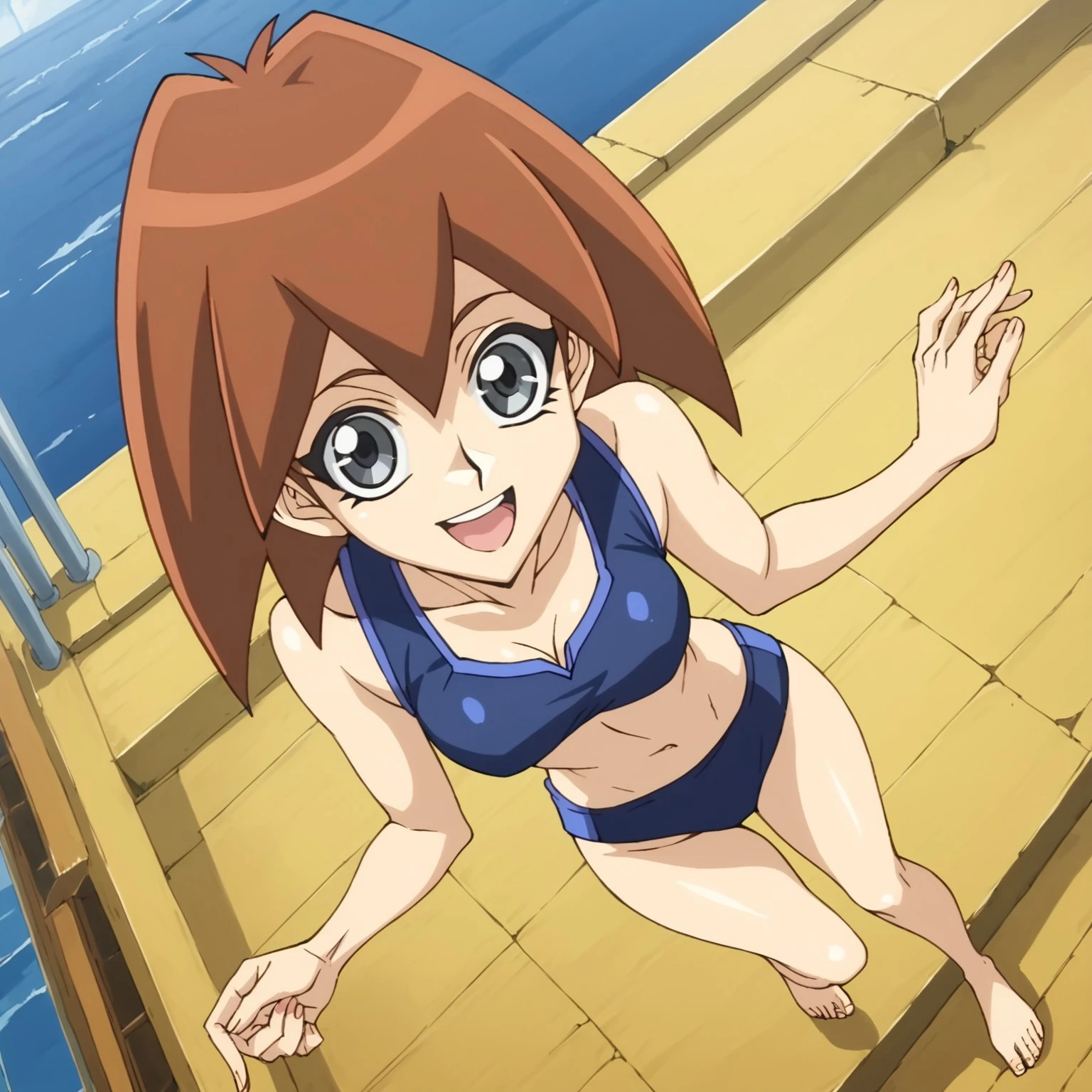 this is a model of jasmine/junko from yugioh. use tags like "yu-gi-oh!, jasmine (yu-gi-oh gx), grey eyes, orange hair, duel academy uniform" for best results