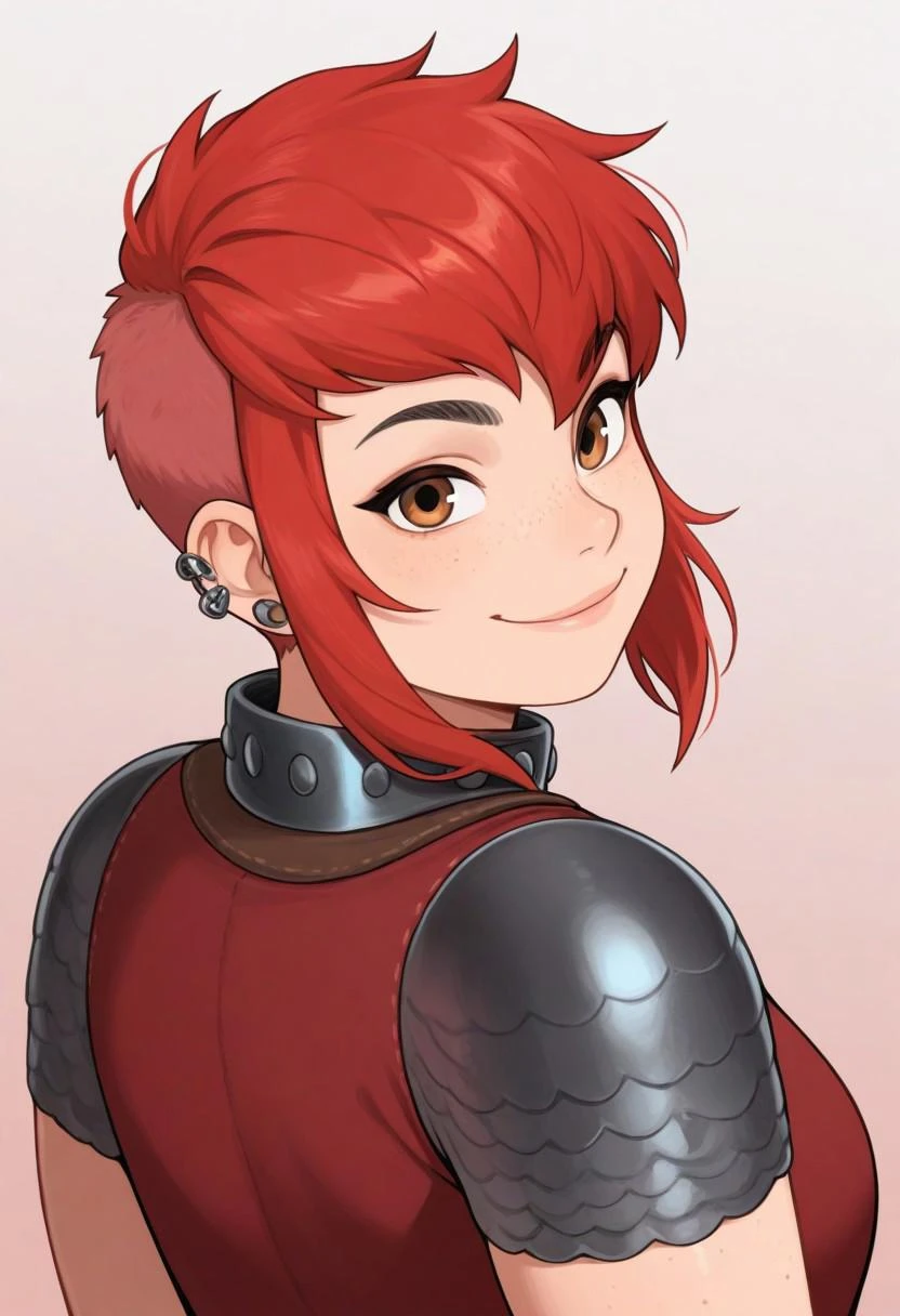 Nmnaanf, brown eyes, red hair, short hair with long locks, short hair, sidelocks, undercut, bangs, ear piercing,