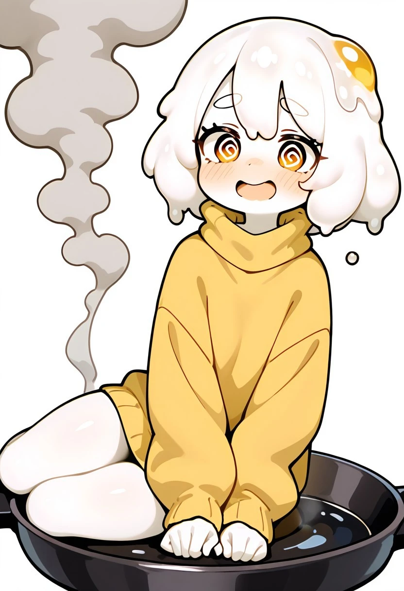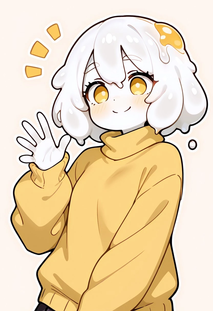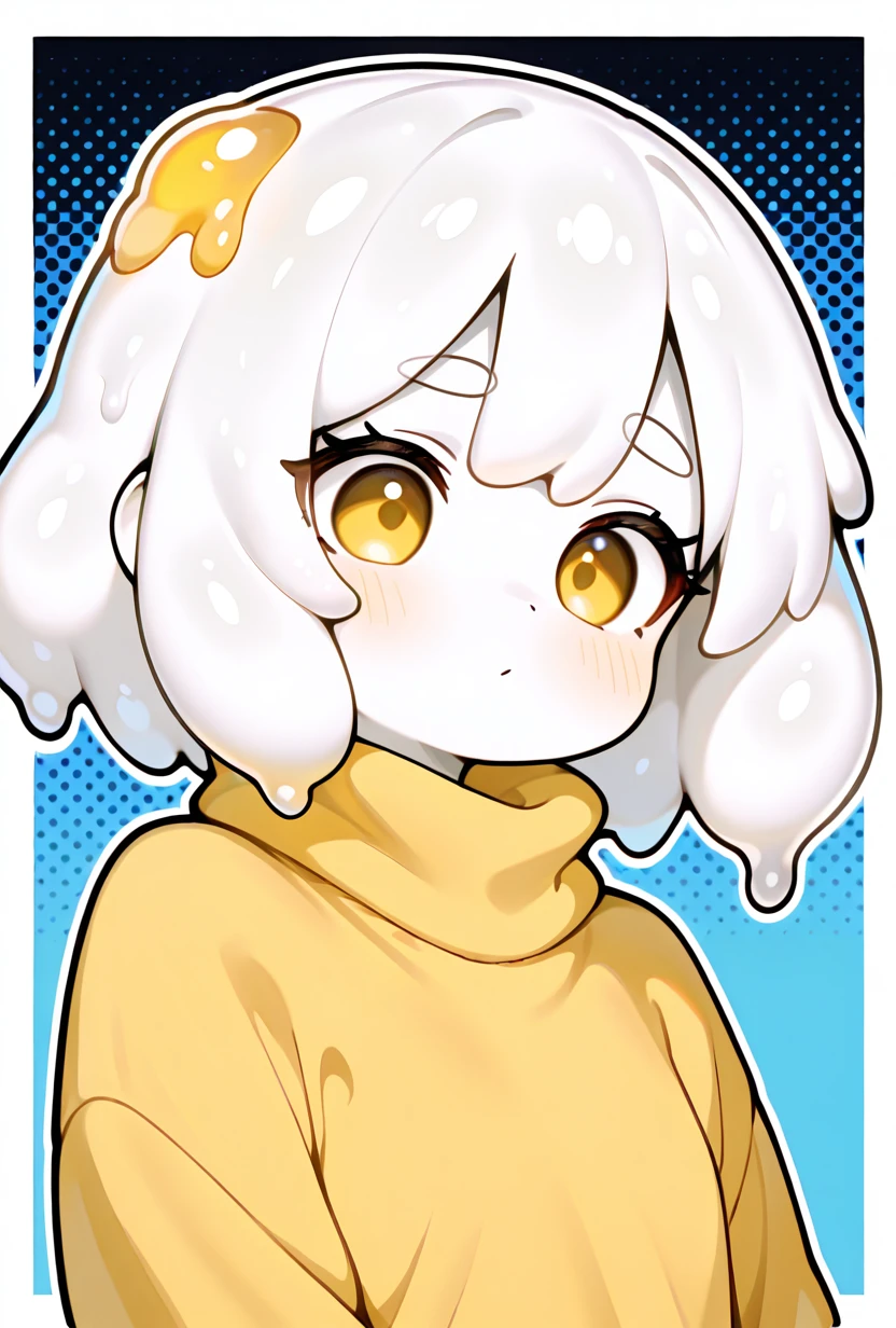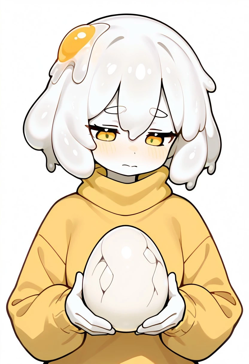 egggirl, 1girl, white hair, monster girl, medium hair, white skin, turtleneck, yellow sweater, slime girl