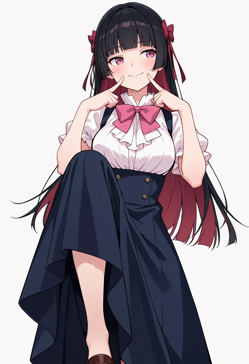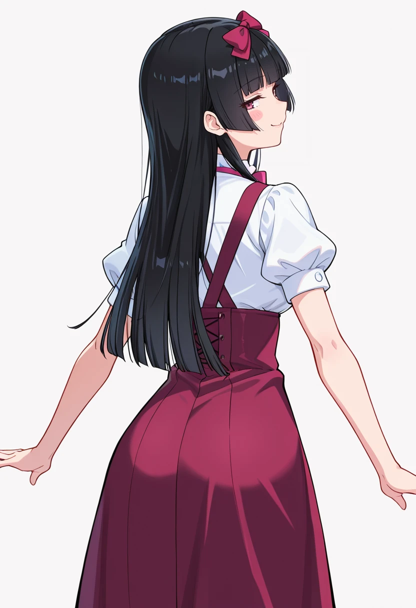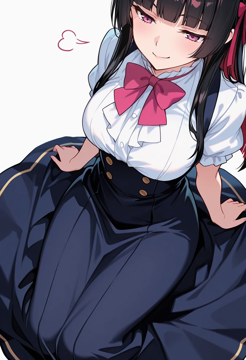 underbust, pink bowtie, red hair bow,white shirt,puffy short sleeves,high-waist skirt, long skirt, suspender skirt,Explanation and notes below👇