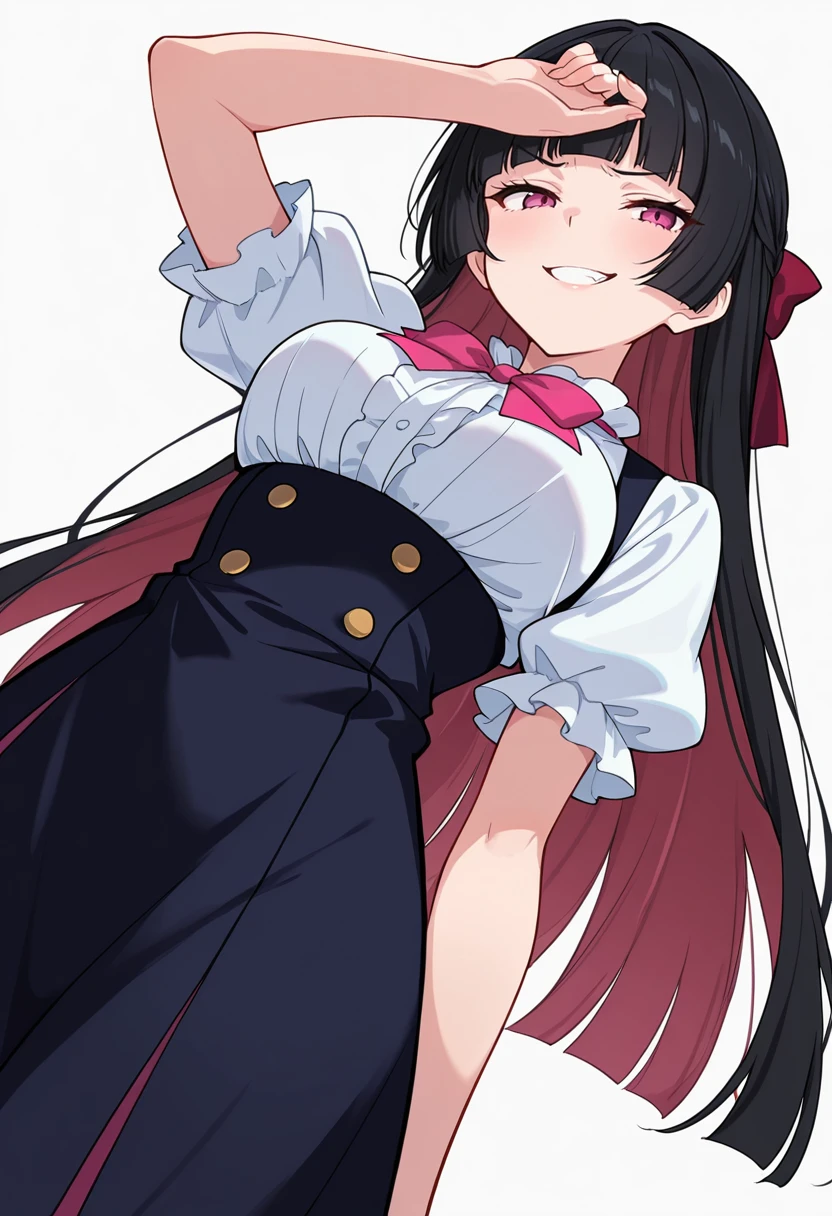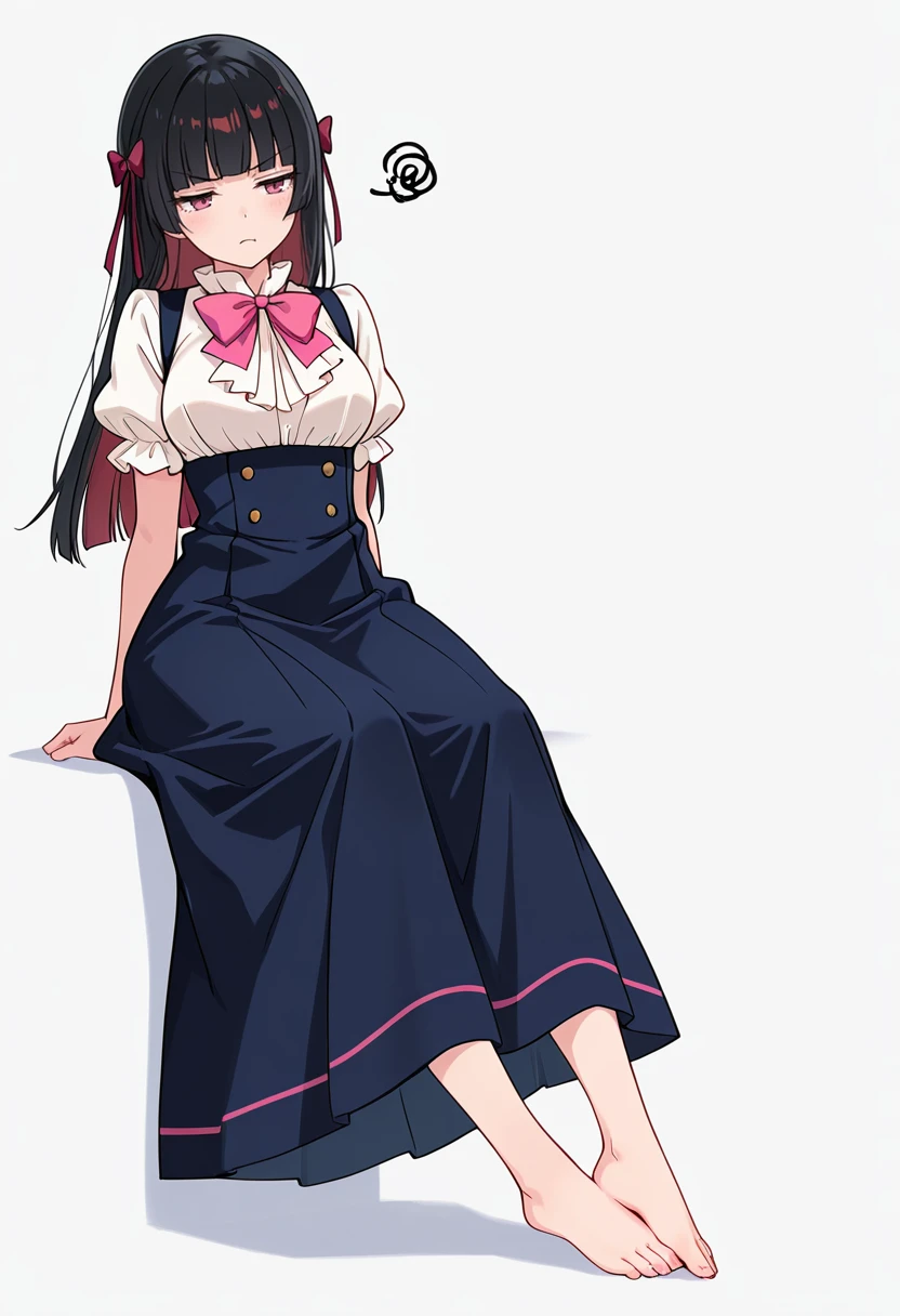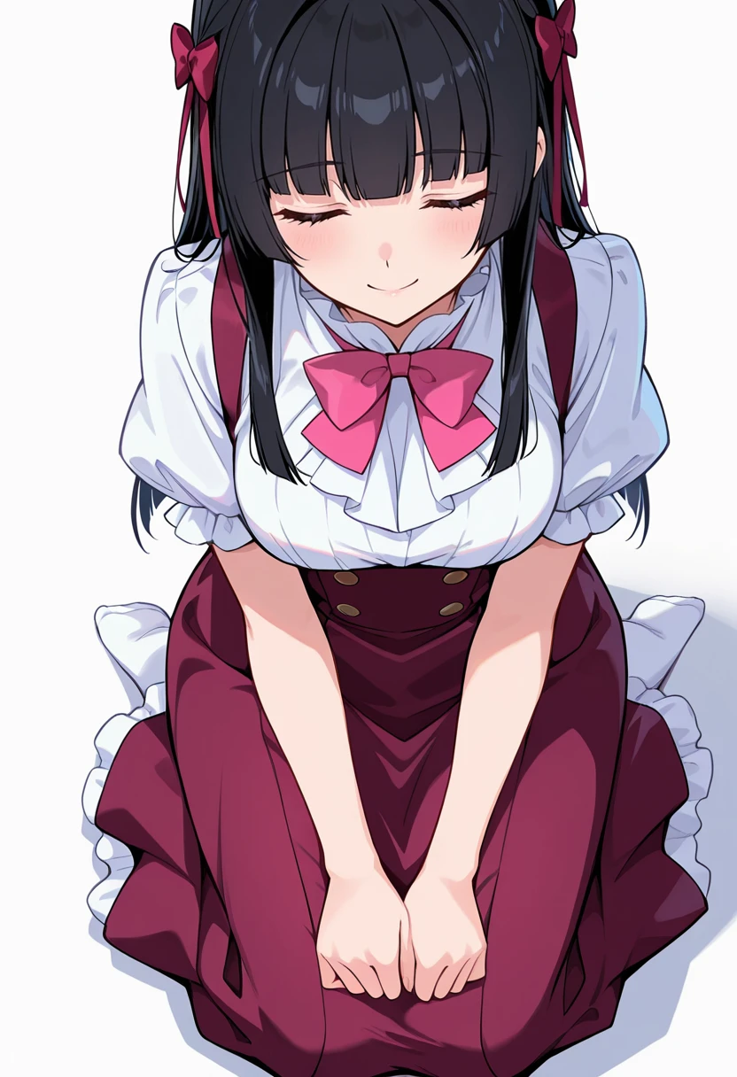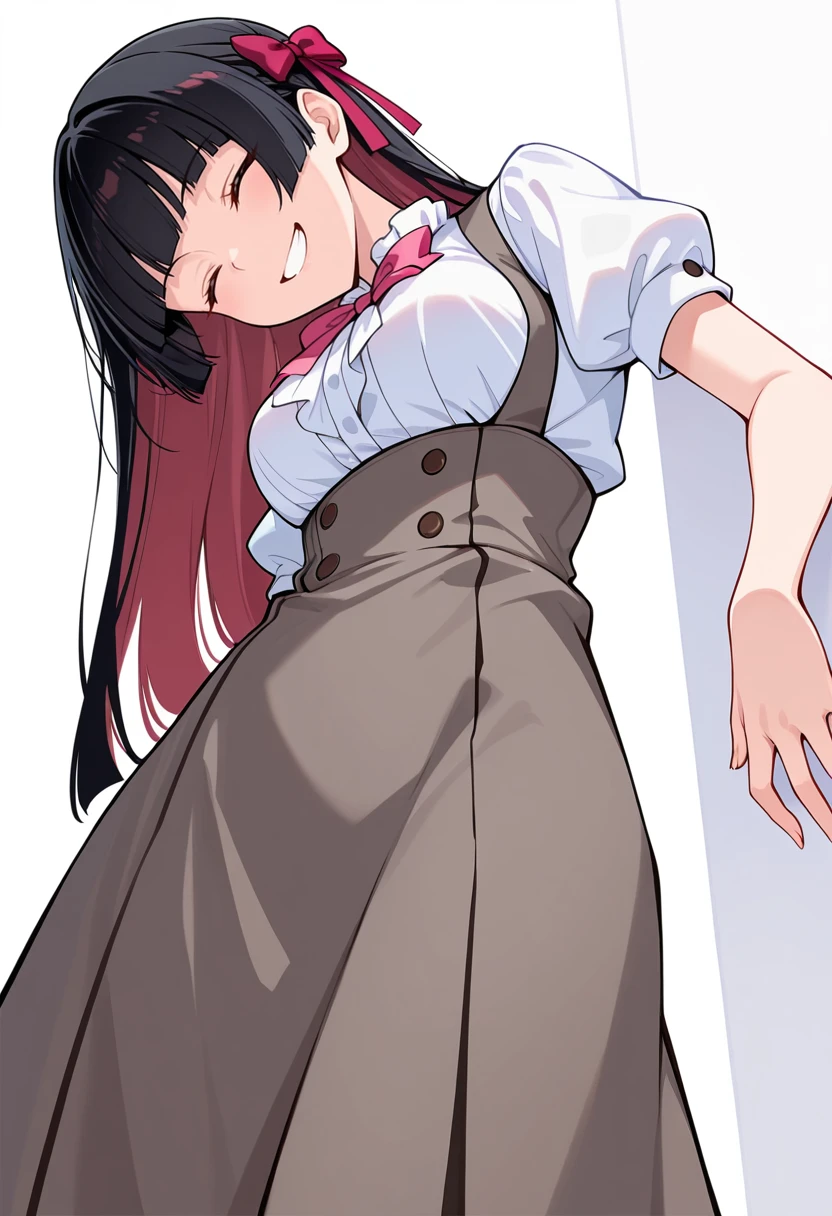 underbust, pink bowtie, red hair bow,white shirt,puffy short sleeves,high-waist skirt, long skirt, suspender skirt,Explanation and notes below👇