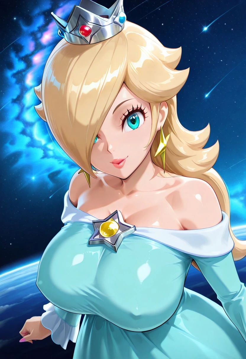 Rosalina,blonde hair,long hair,hair over one eye,wavy hair,aqua eyes,lipstick,huge breasts,crown,earrings,