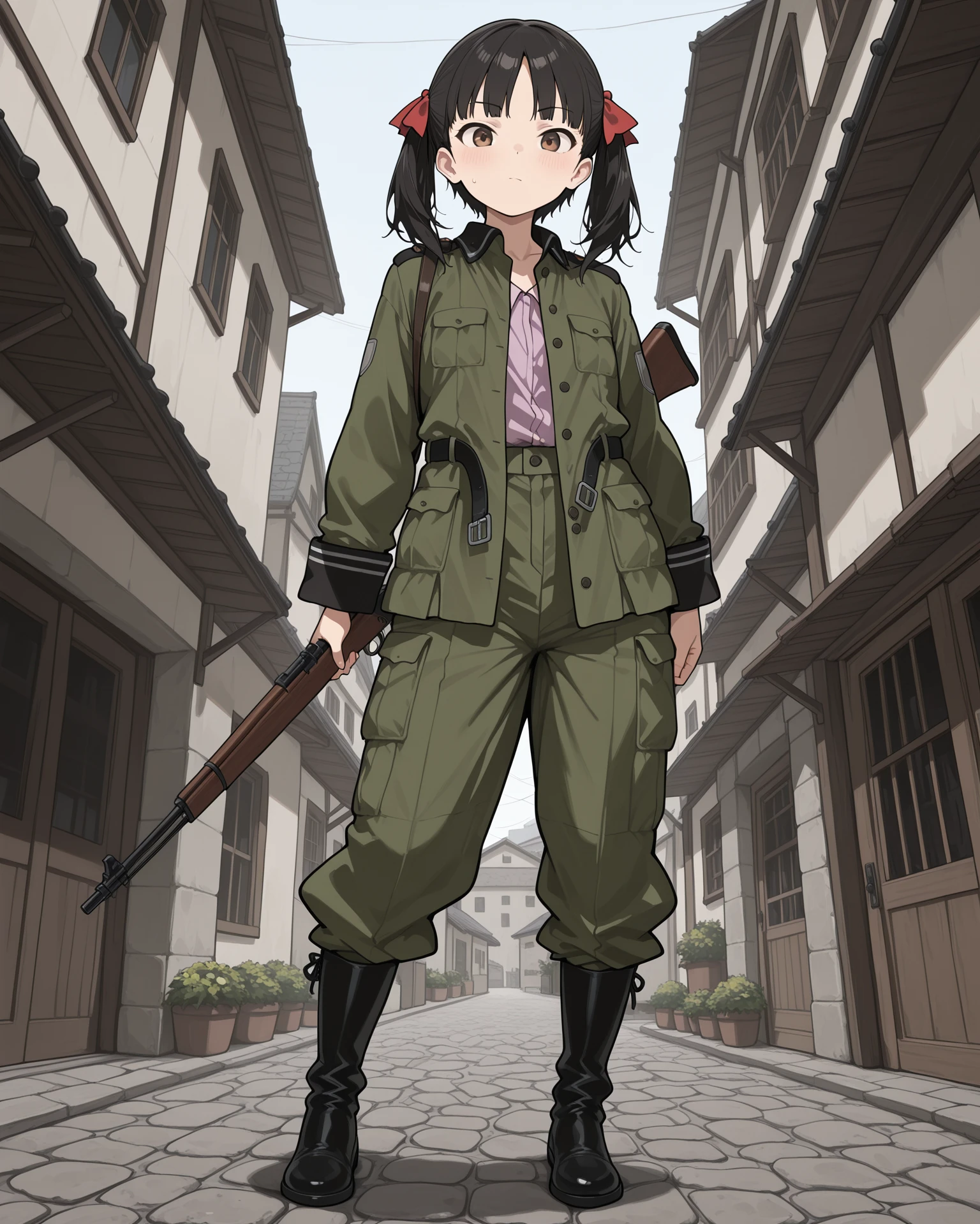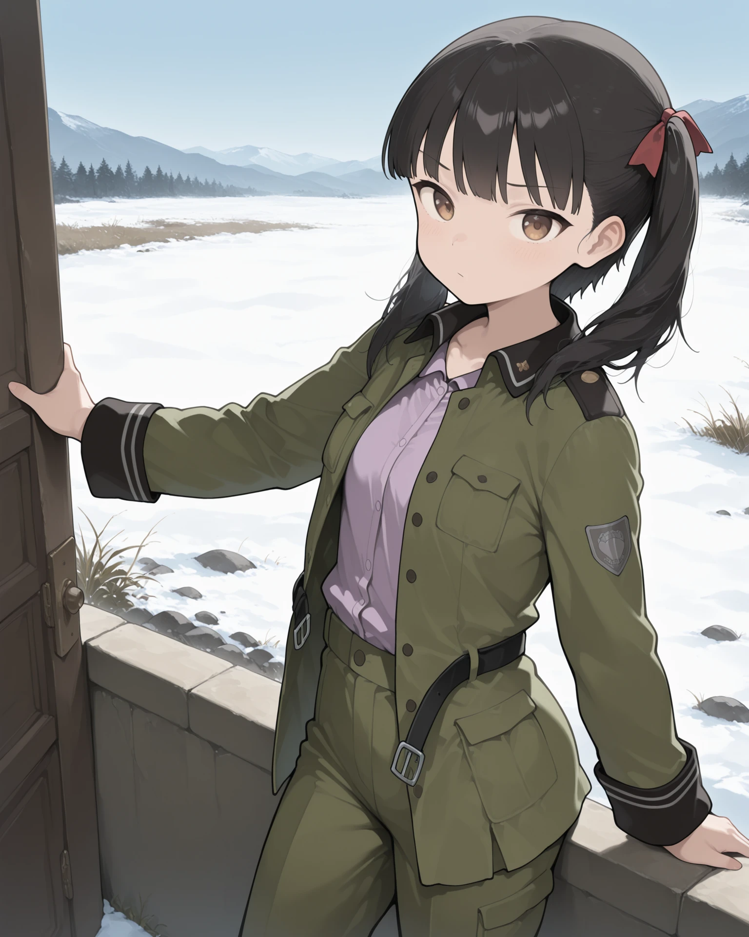 kureha, brown eyes, black hair, twintails, red hair ribbon, helvetian military uniform, olive green, military uniform, black collar, oversized clothes, collared shirt, pink shirt, open belt, long sleeves, black cuffs, pants, black boots,