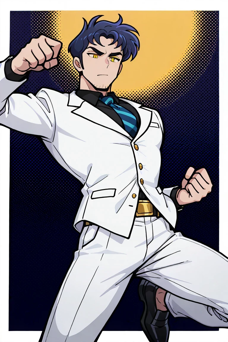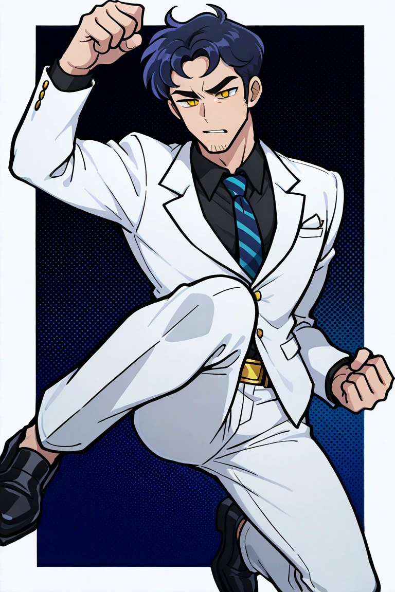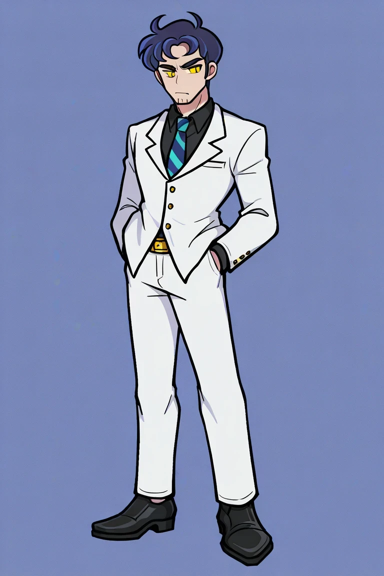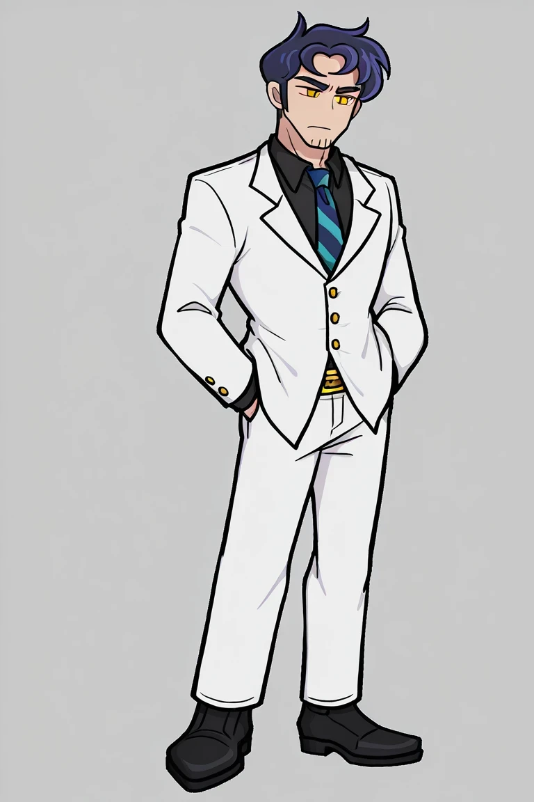 OliverFNF, 1boy, very tall man, sparkling yellow eyes, no sclera, desaturated indigo hair, light black stubble, dark grey shirt, white tuxedo with golden buttons, white pants, gold belt, dark grey sleek shoes, blue-turquoise striped necktie,