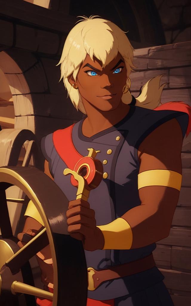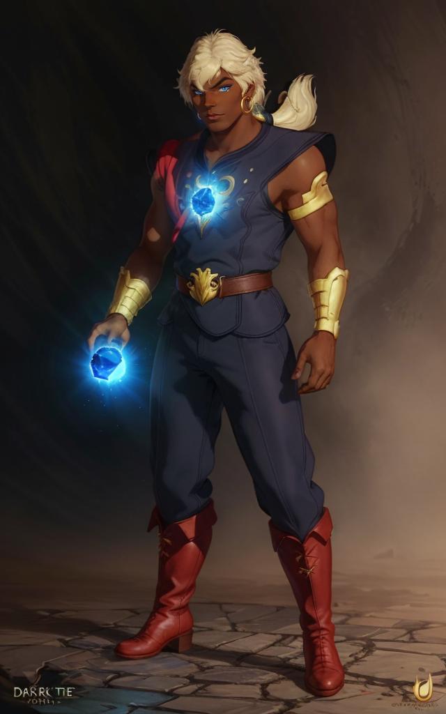 man, a cartoon character with blonde low ponytail hair and purple outfit, blue eyes, golden armlets, golden earring, red boots,