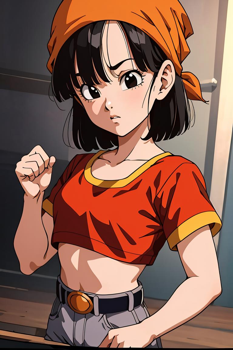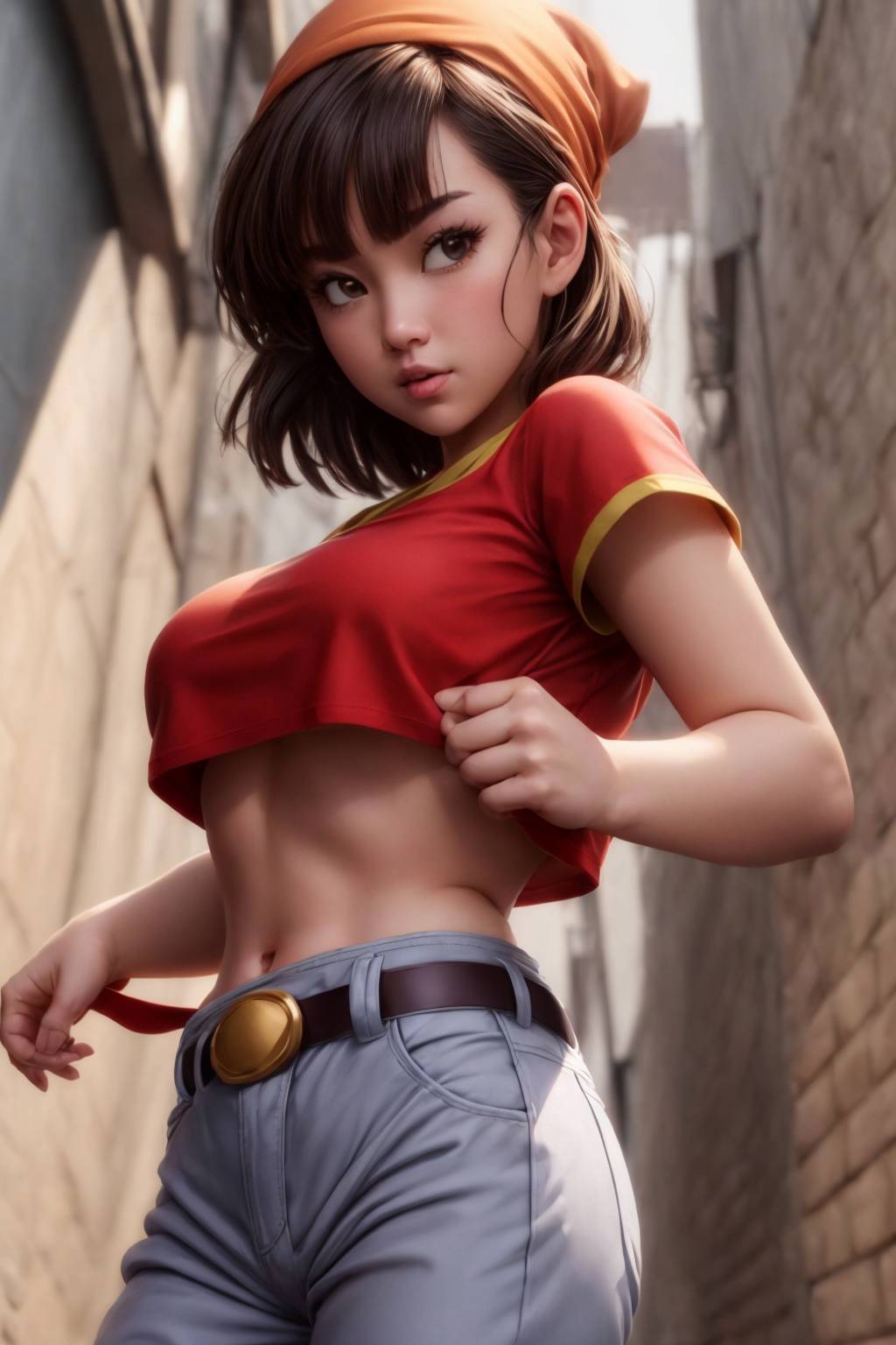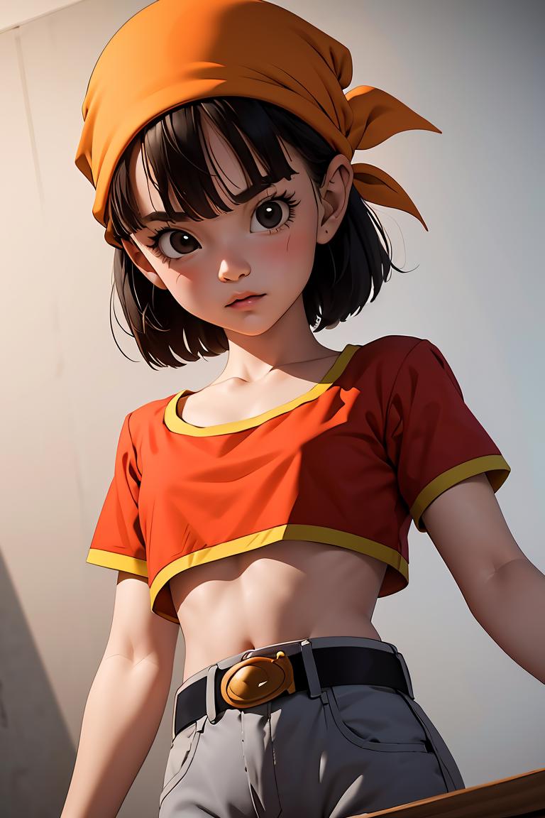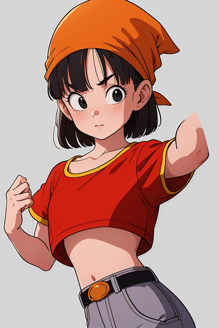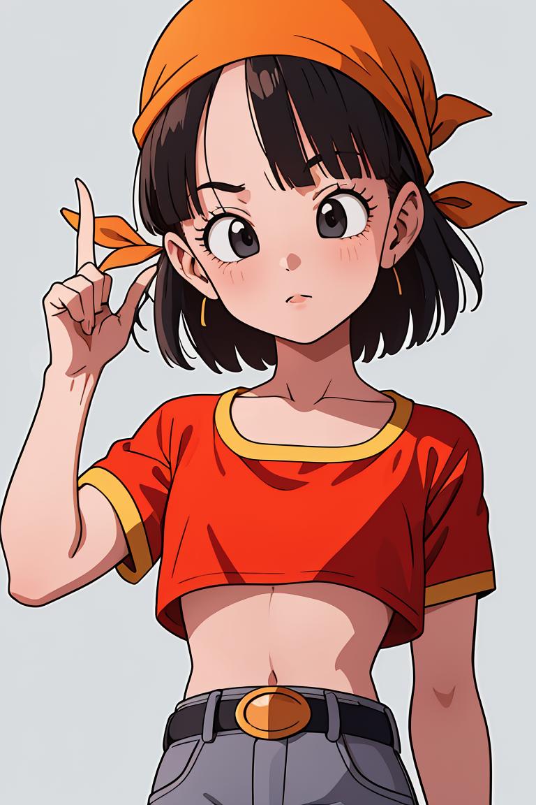 pan,1girl,solo,black eyes,bangs,black hair,short hair,bandana,red shirt,red crop top,midriff,belt,gray pants,