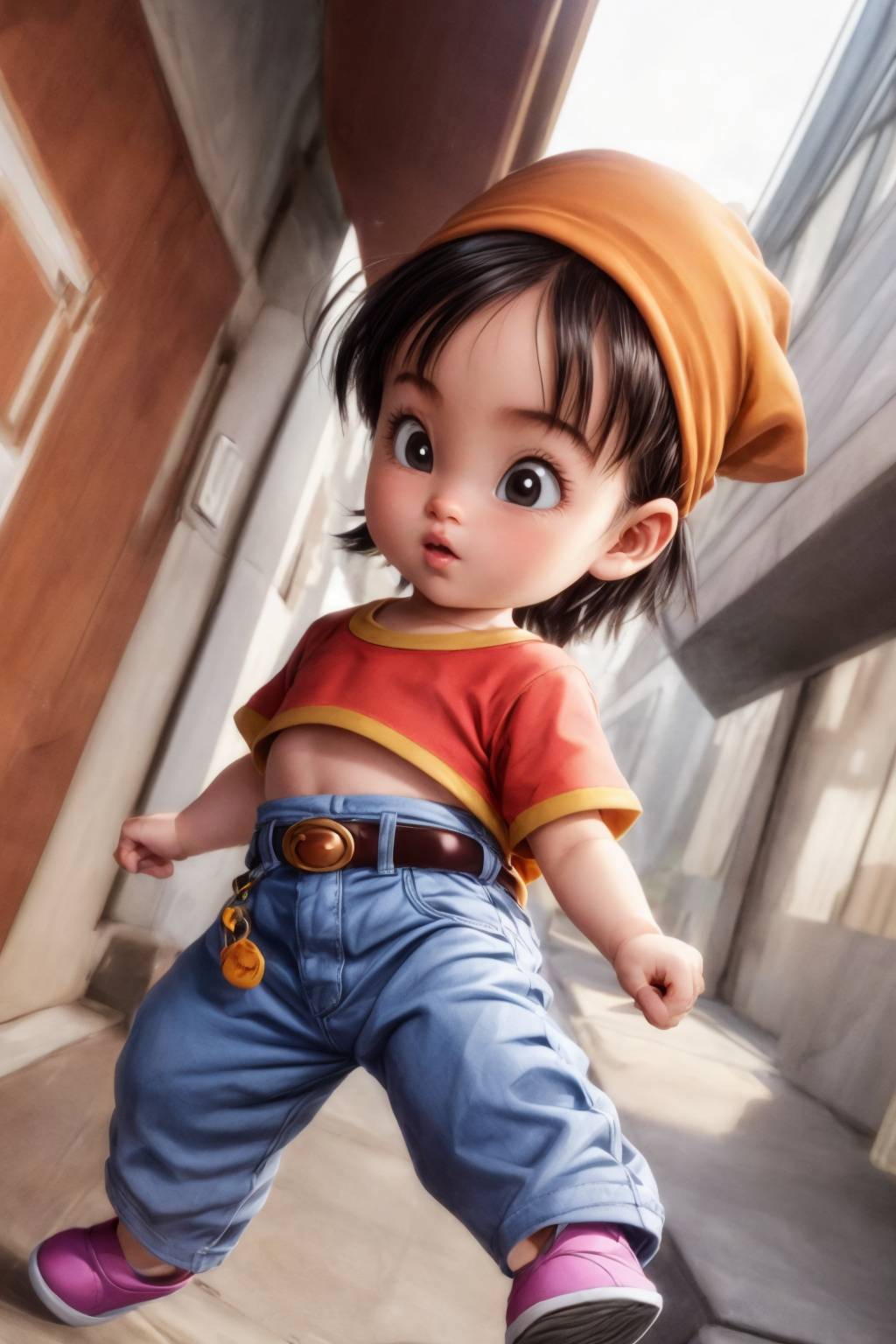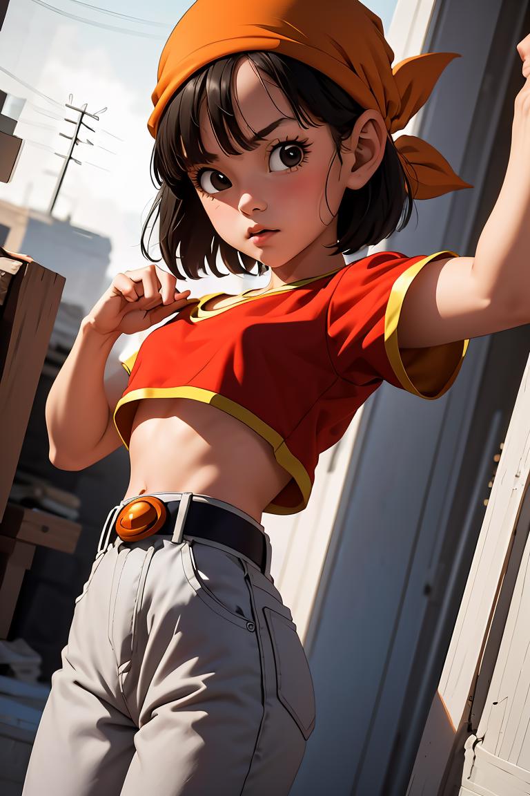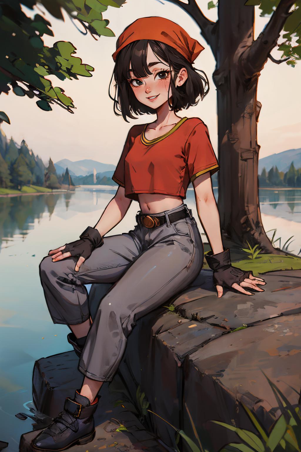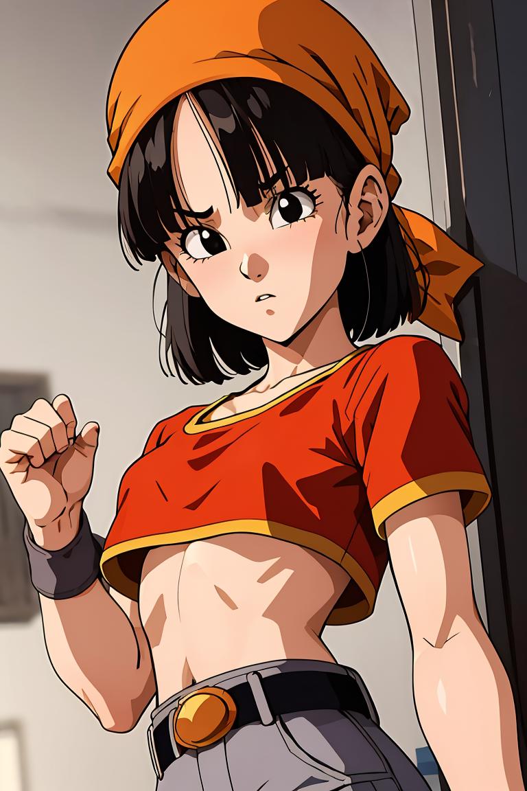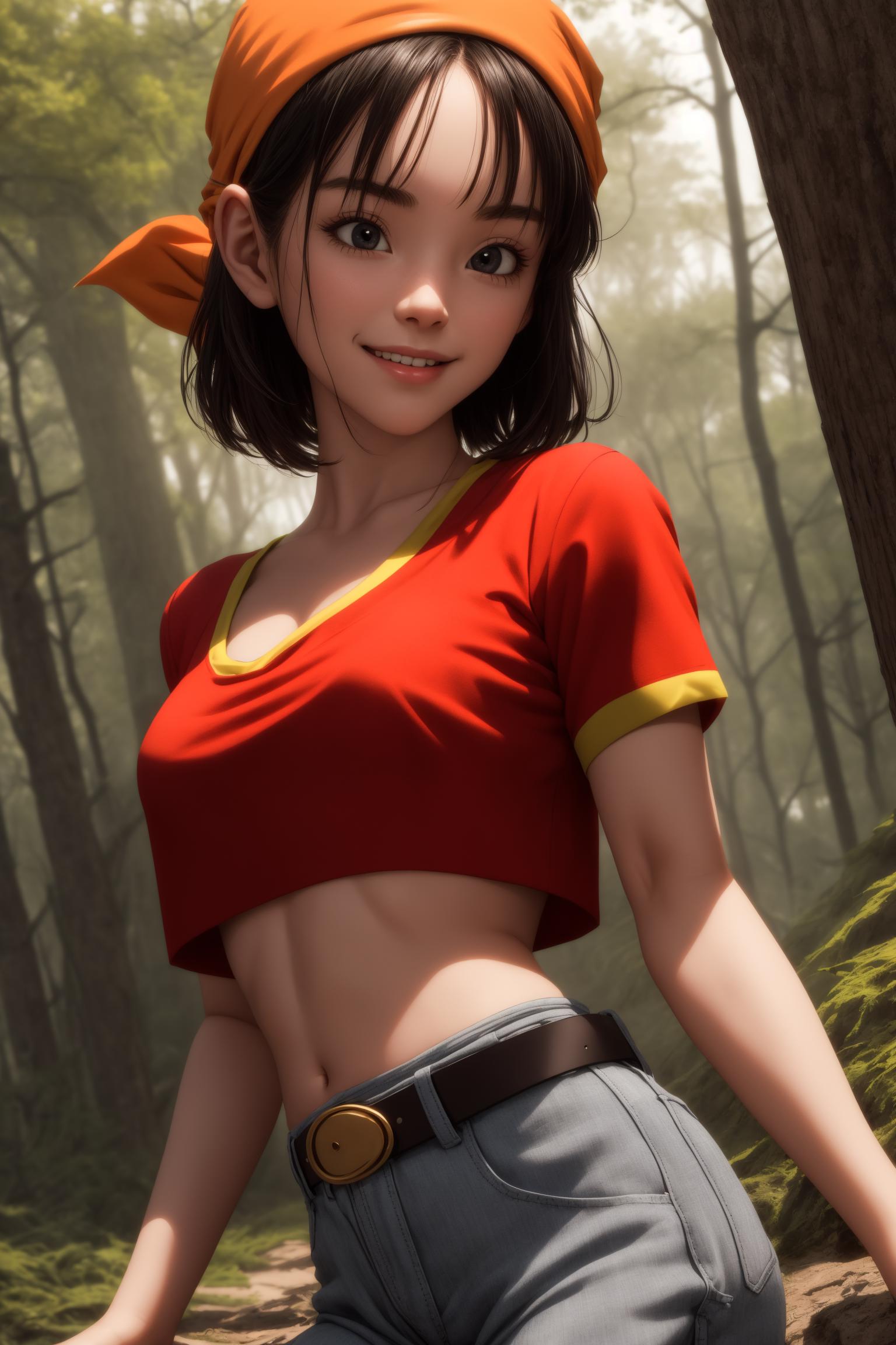 pan,1girl,solo,black eyes,bangs,black hair,short hair,bandana,red shirt,red crop top,midriff,belt,gray pants,