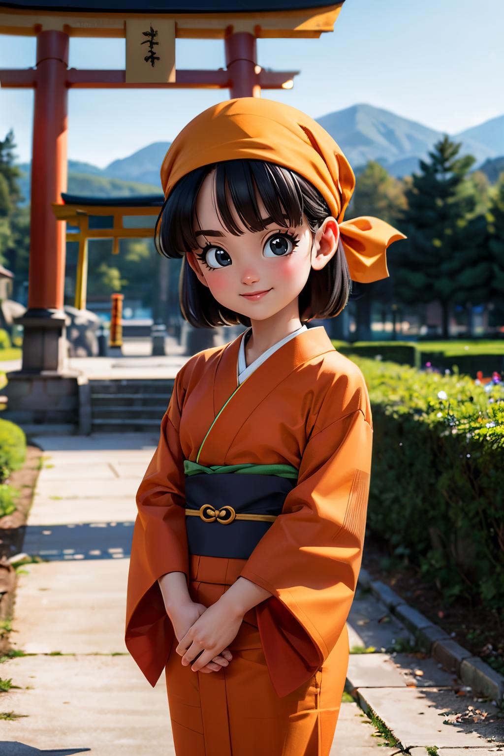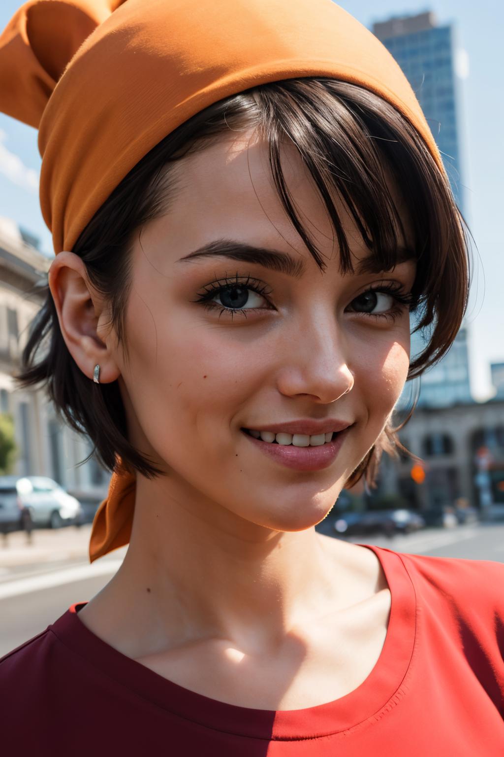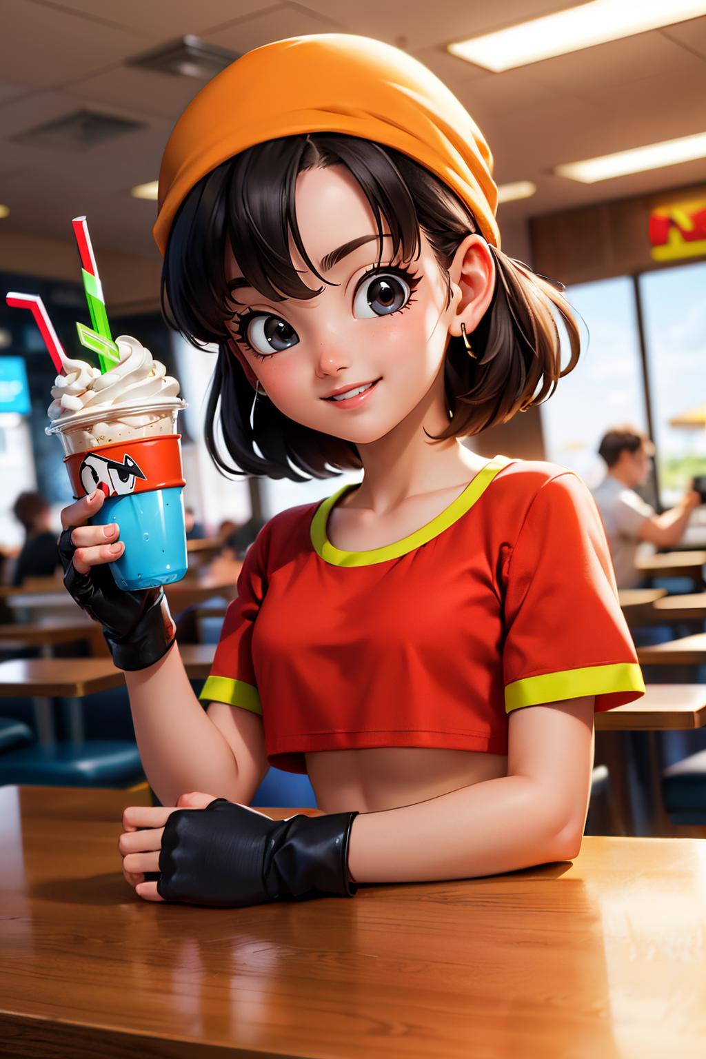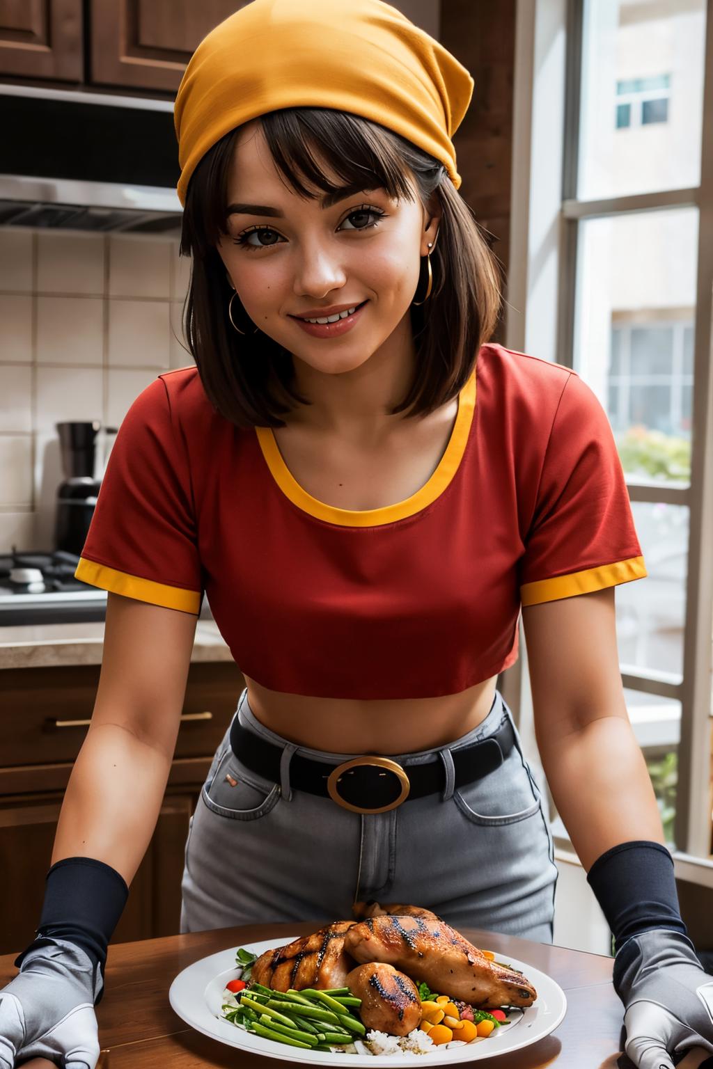 pan,1girl,solo,black eyes,bangs,black hair,short hair,bandana,red shirt,red crop top,midriff,belt,gray pants,