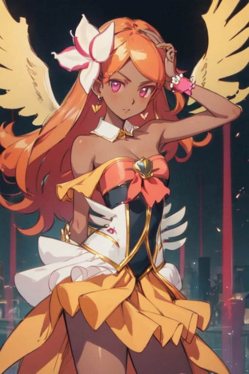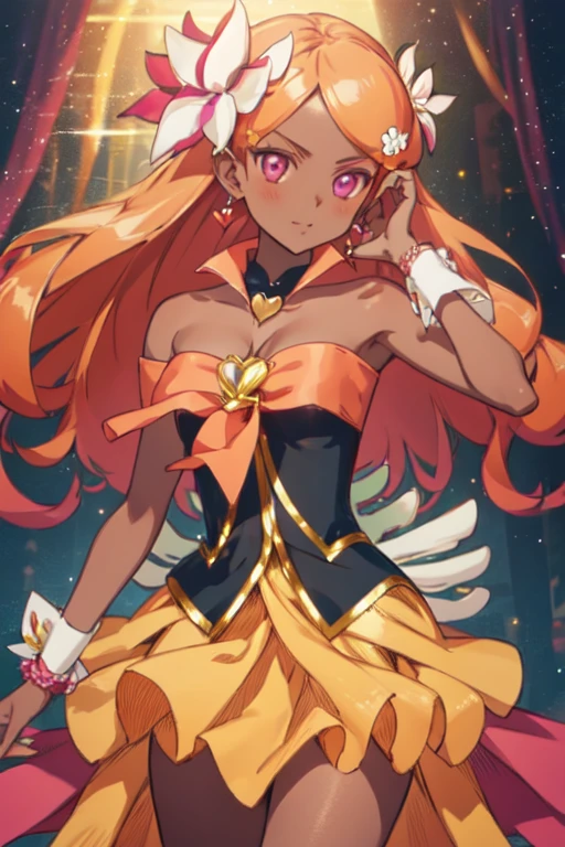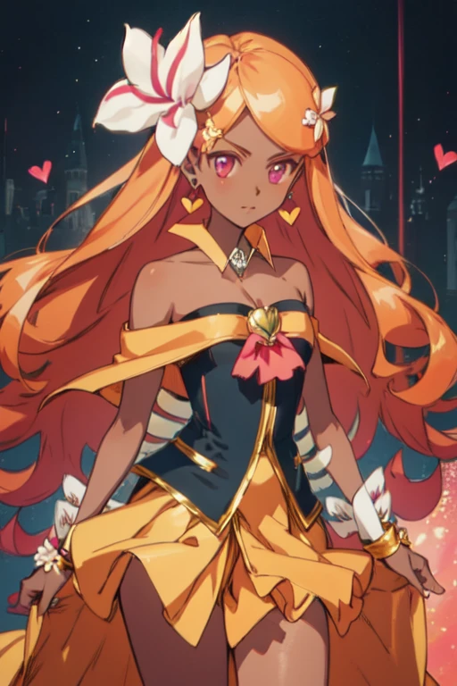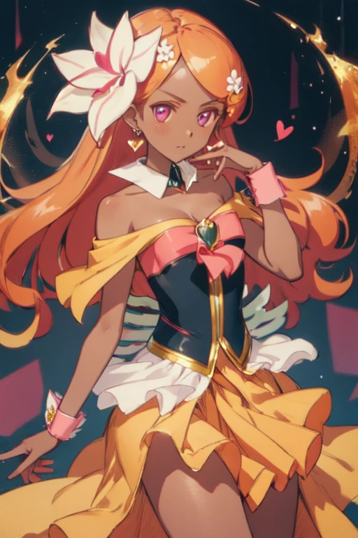 CureSunset, 1girl, solo, long hair, orange hair, hair ornament, jewelry, earrings, hair flower, dark skin, pink eyes, dark-skinned female, wrist cuffs, magical girl, heart brooch, yellow skirt, bare shoulders, detached collar