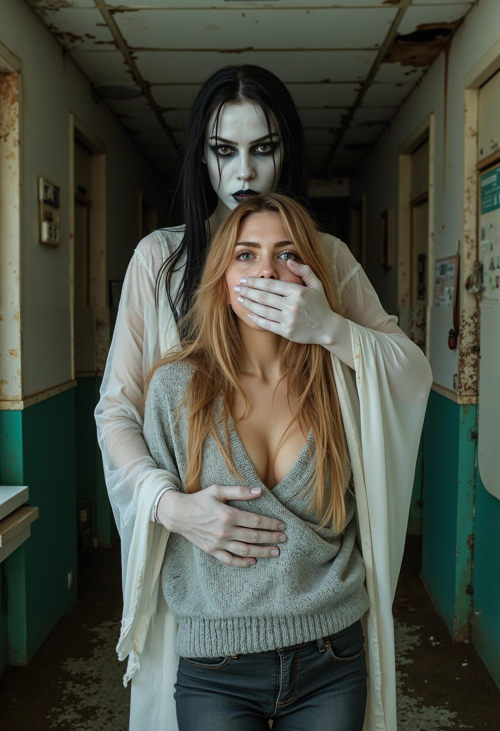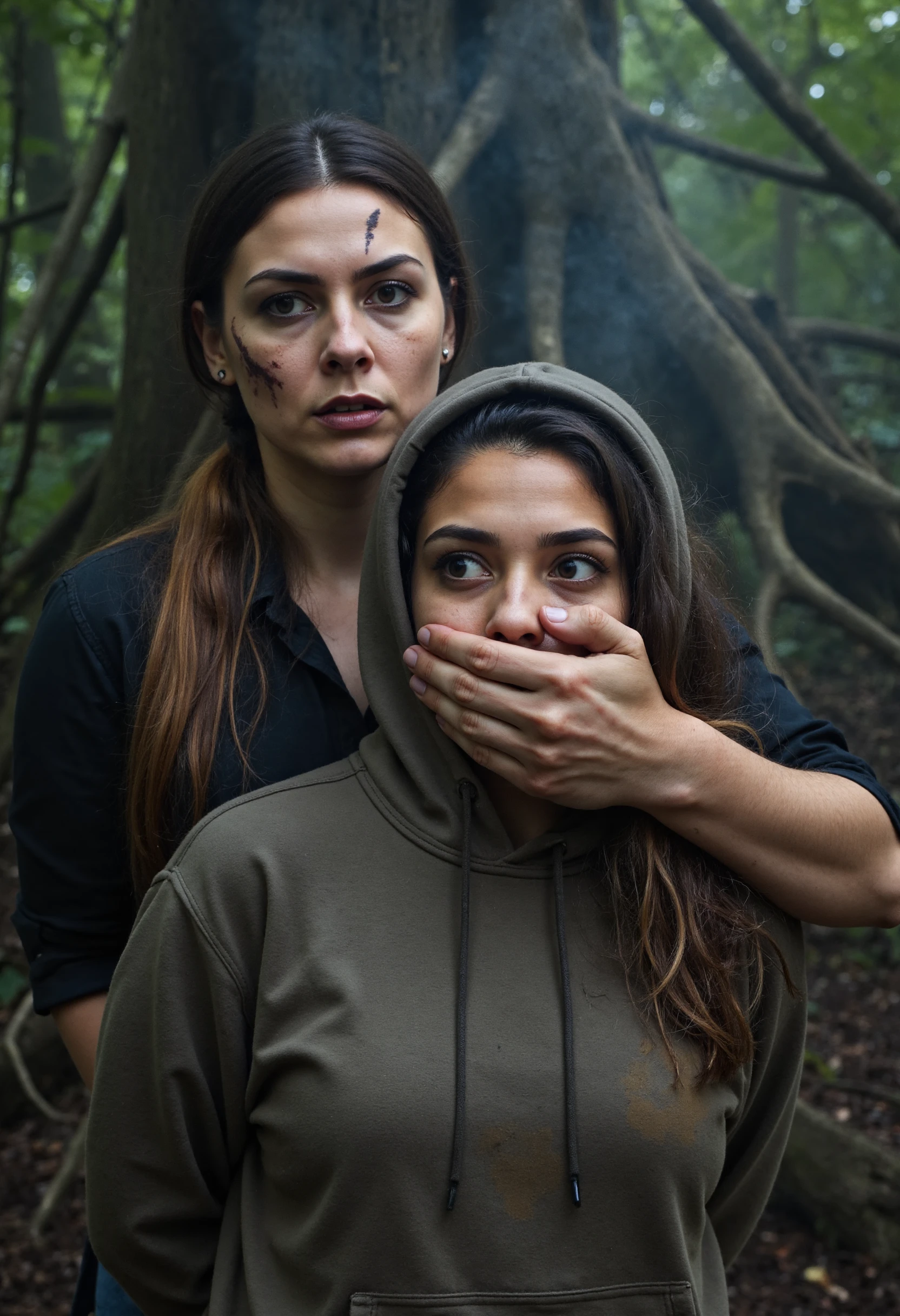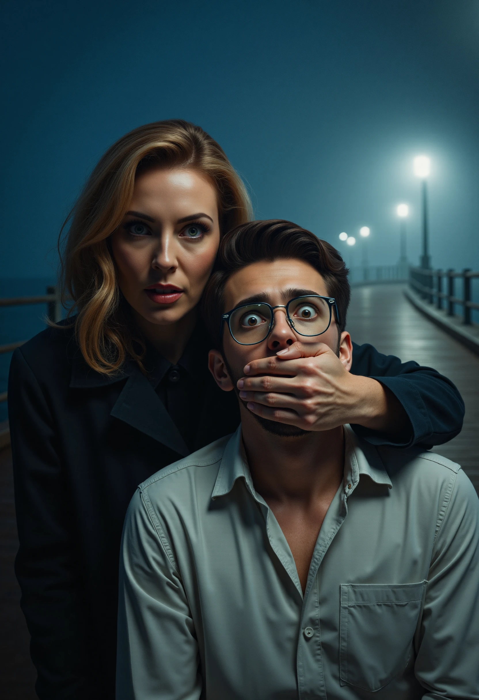 [An amateur/A professional] [close-up/wide-shot] [photograph] featuring a [victim's gender] and a [assaulter's gender] behind [him/her]. A [description of the assailant] covers the [victim's gender]'s mouth with [his/her] hand. [His/Her][description of the hand] hand [other description if needed] [tightly/gently] covers the mouth of a [brief victim description] [victim's gender]. [Describe here what the assaulter is doing with his free arm]. The victim has [victim's detailed description]. [Describe here where the assailant and victim are looking]. [Environment and setting description].