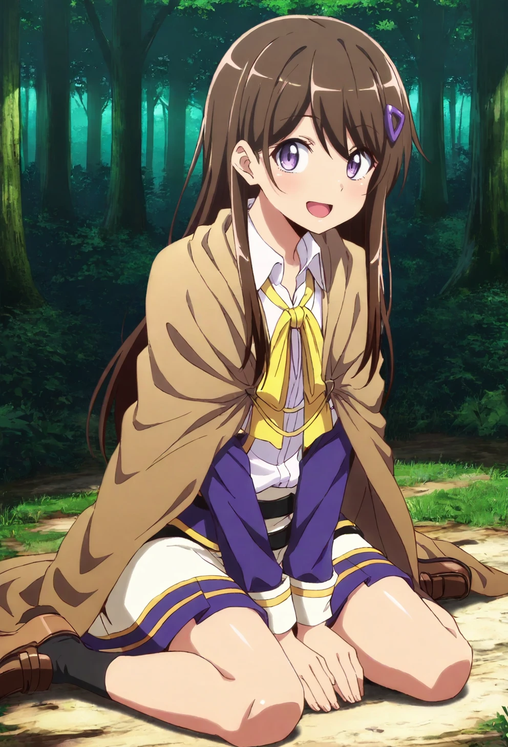 iinchou-default,purple eyes,brown hair,long hair,hair ornament, school uniform, brown cape,(black belt:0.7),white skirt,black socks,loafers