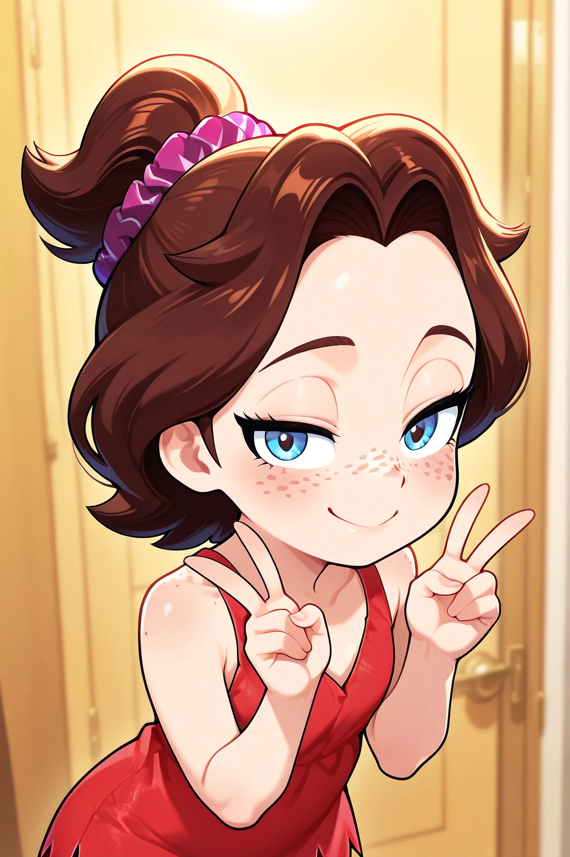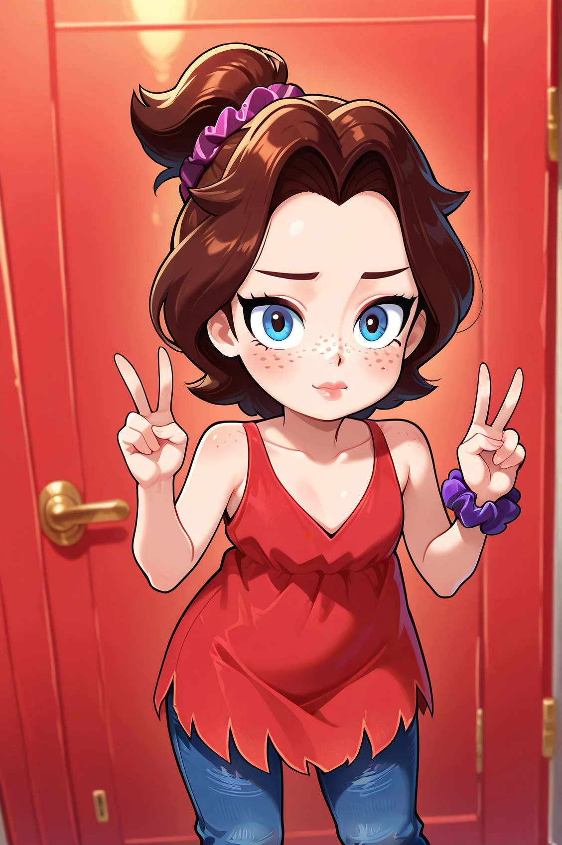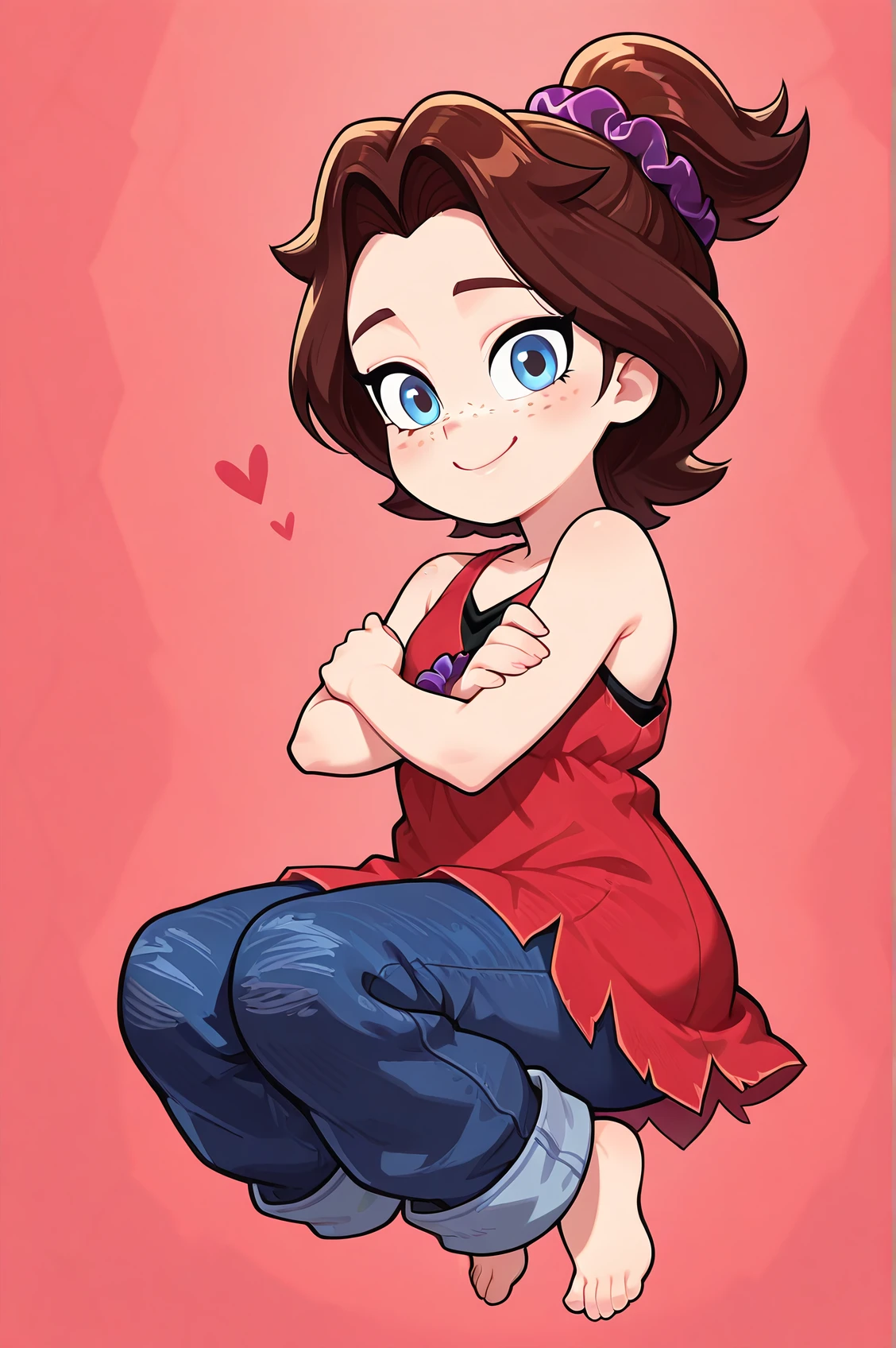 pauline_dk, brown hair, blue eyes, freckles, scrunchie, ponytail, red dress, baggy jeans, barefoot,