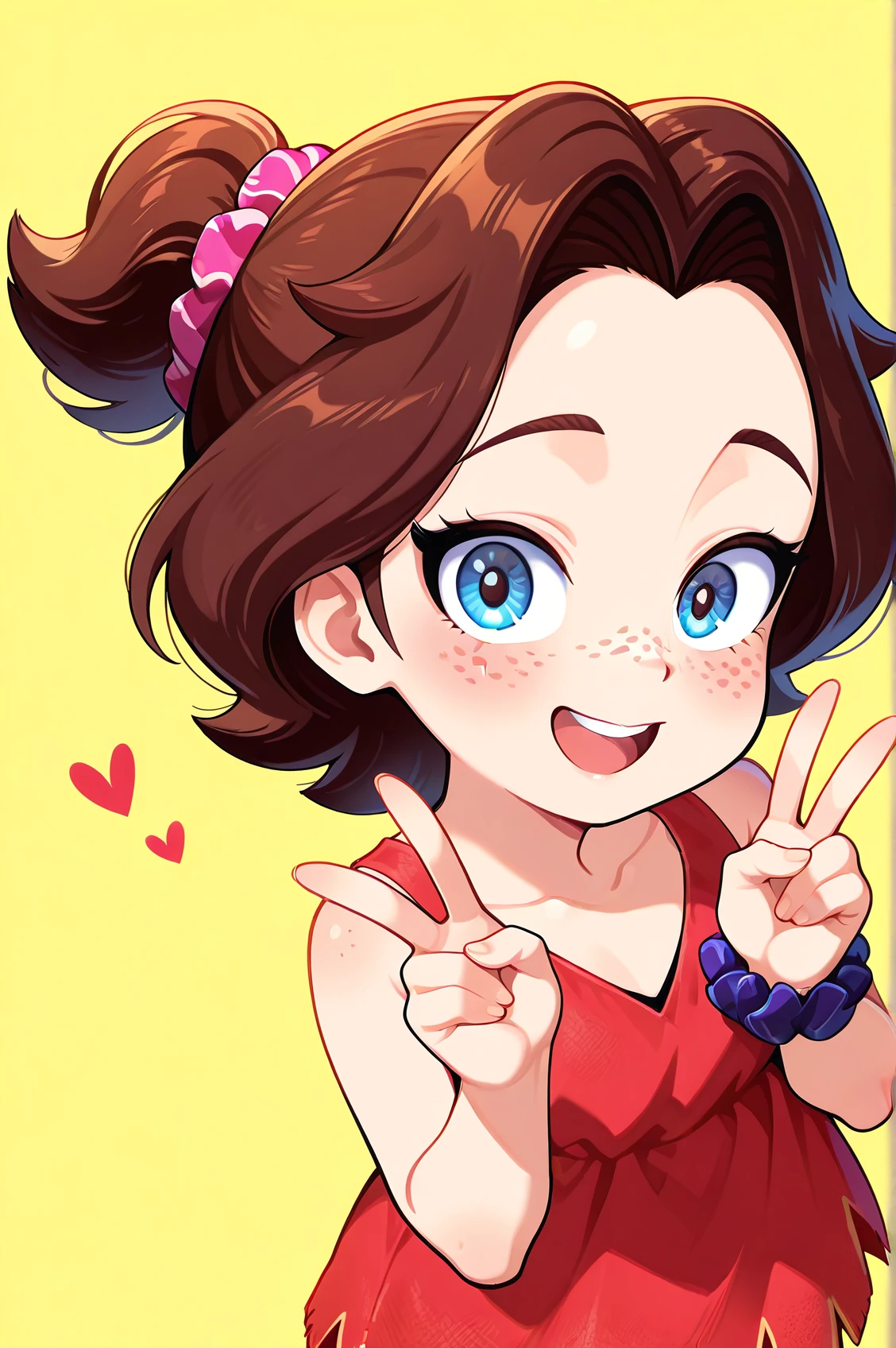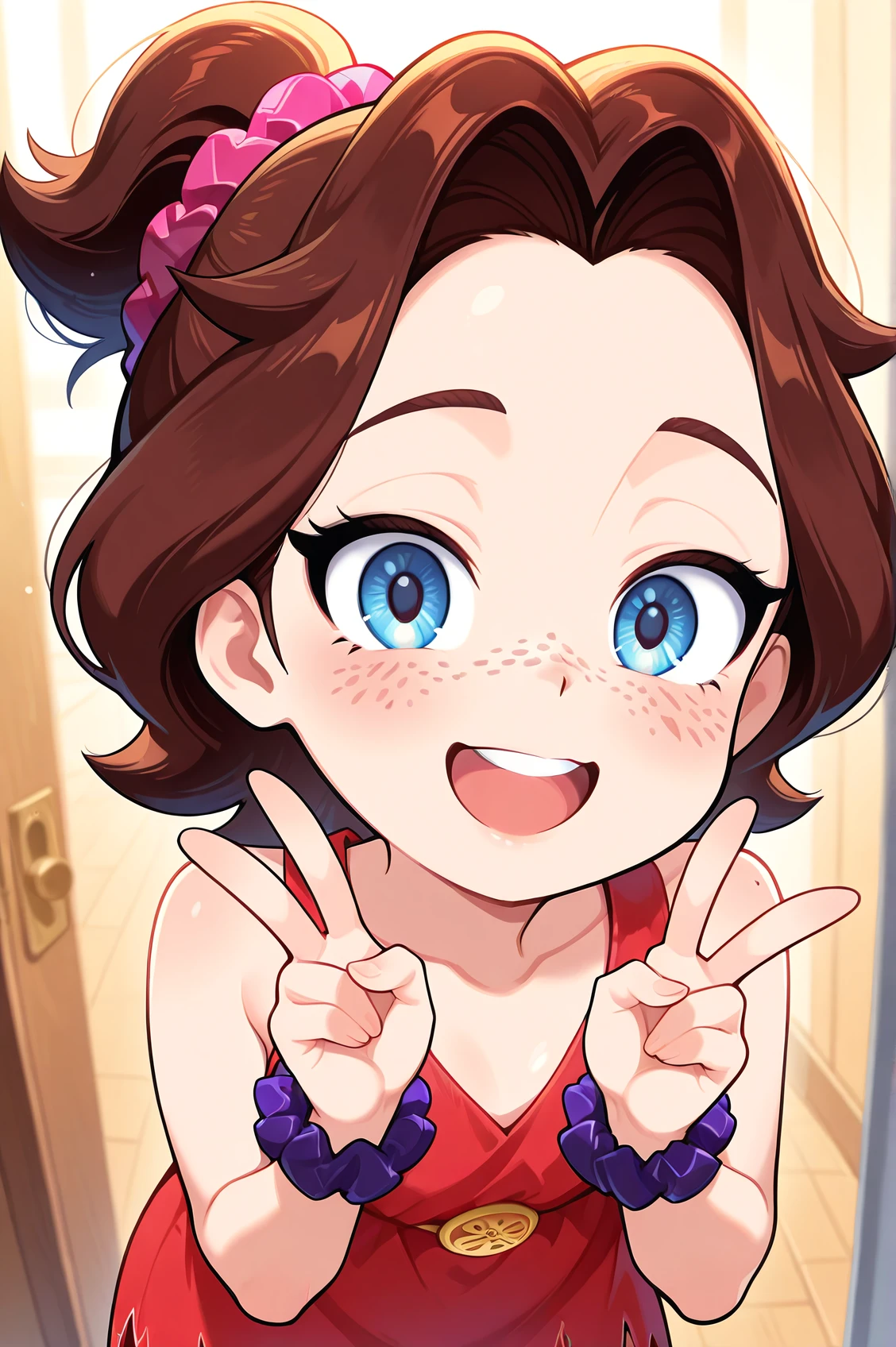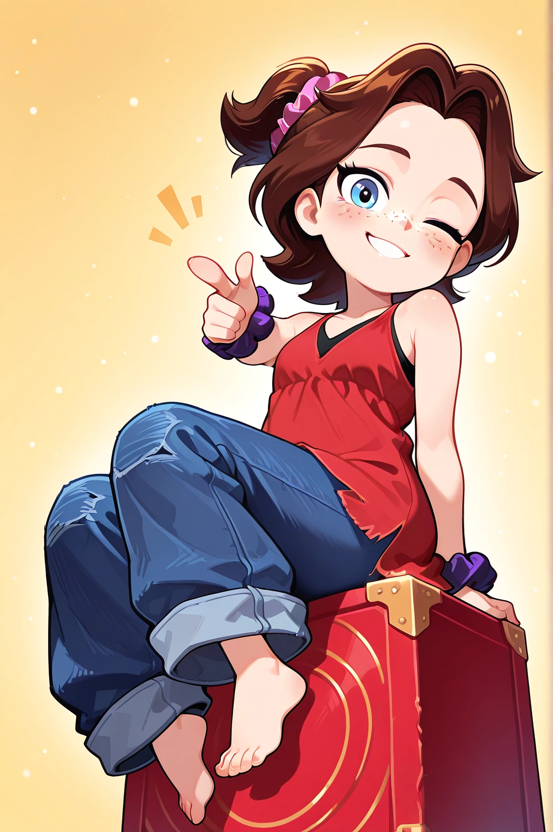 pauline_dk, brown hair, blue eyes, freckles, scrunchie, ponytail, red dress, baggy jeans, barefoot,