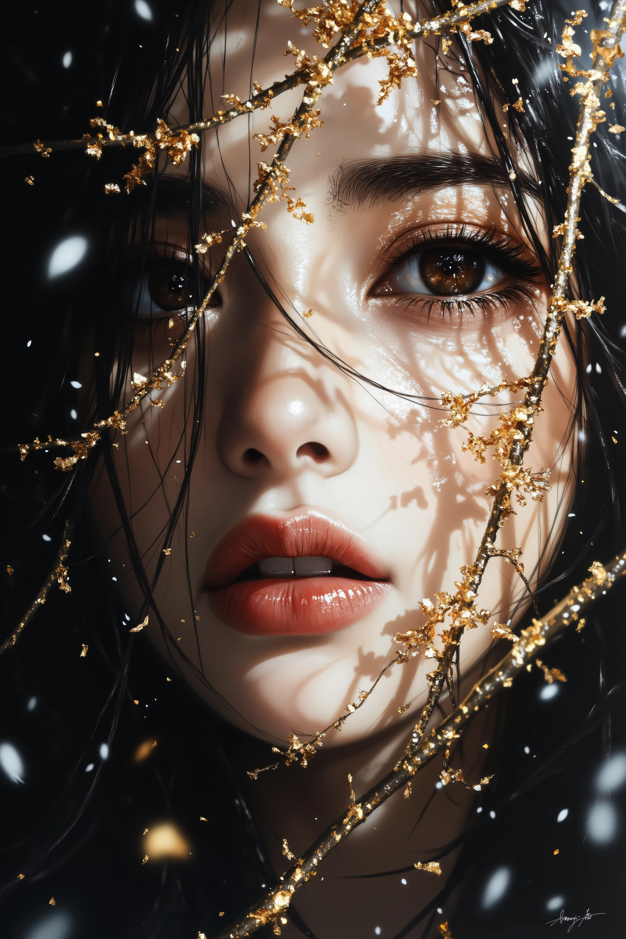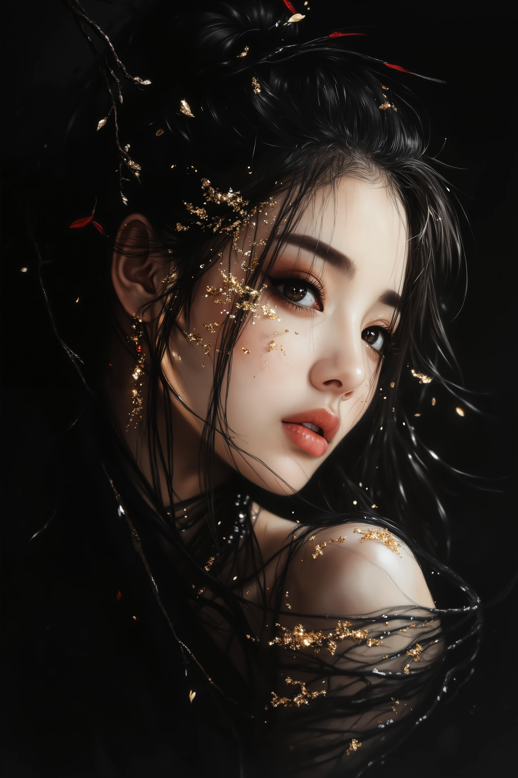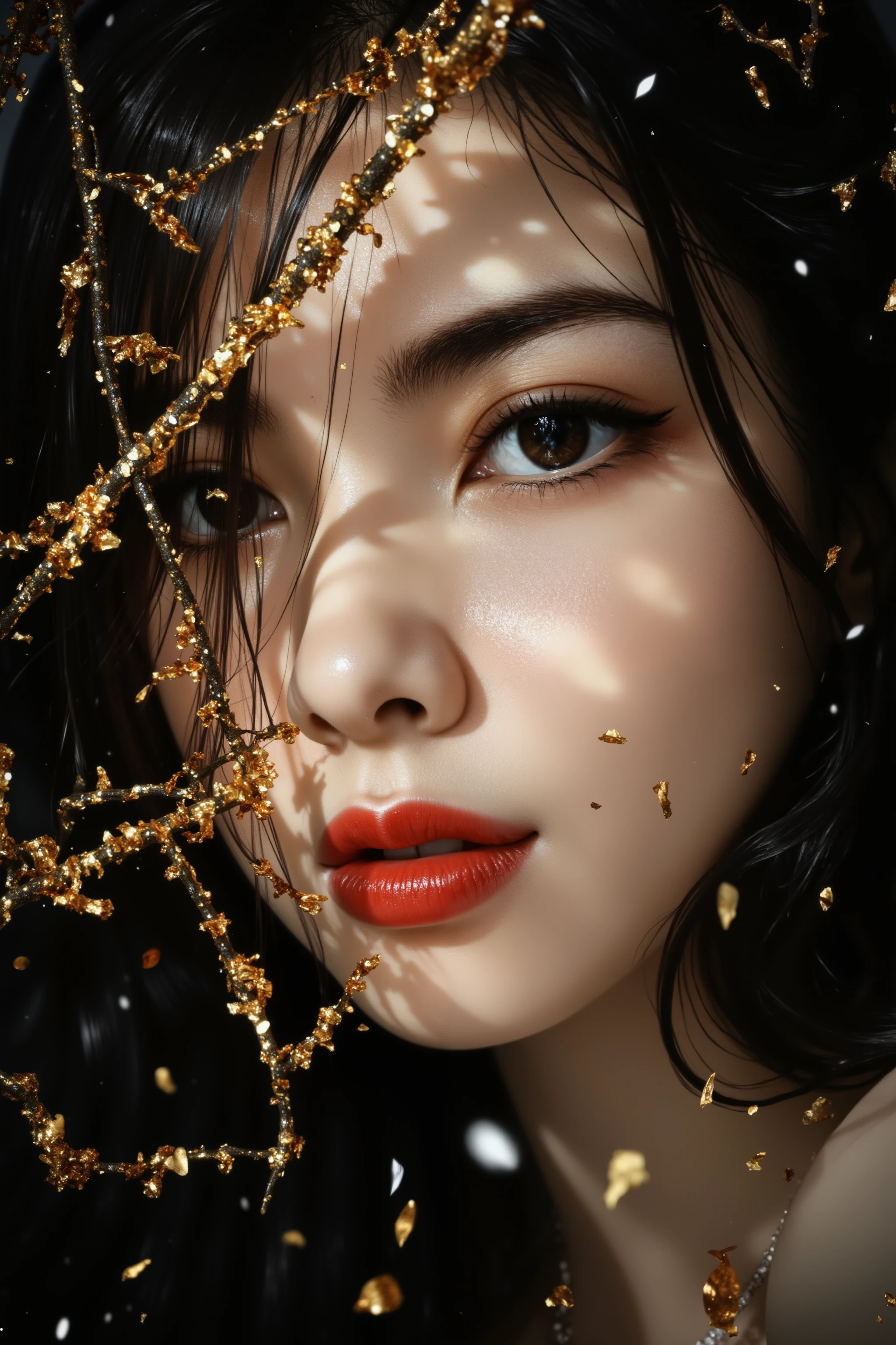 Golden art face, Golden art face, a woman with long black hair and gold glitter on her face, set against a dark background. Her hair is adorned with delicate gold glitter, giving her a regal and majestic look.