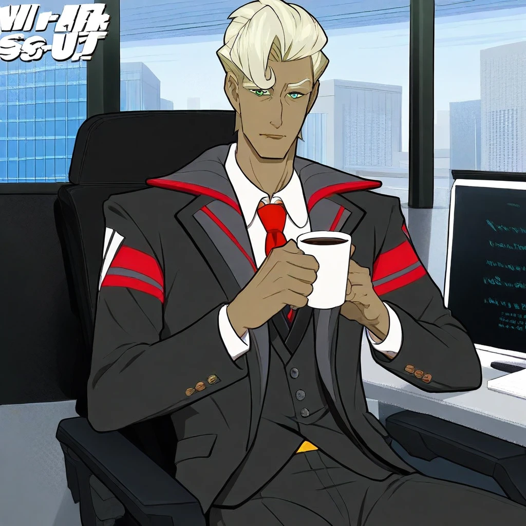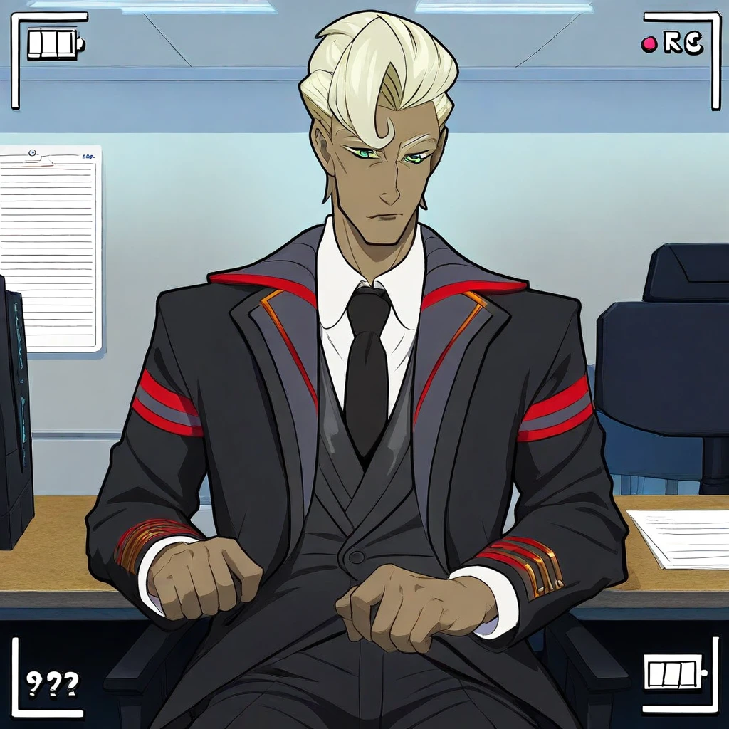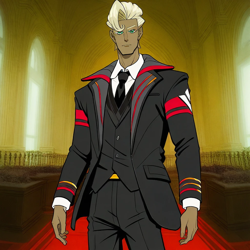 Blonde hair, short hair, green eyes, dark skin, dark-skinned male