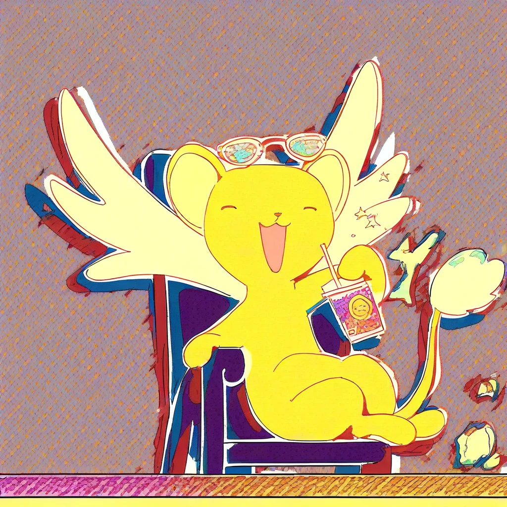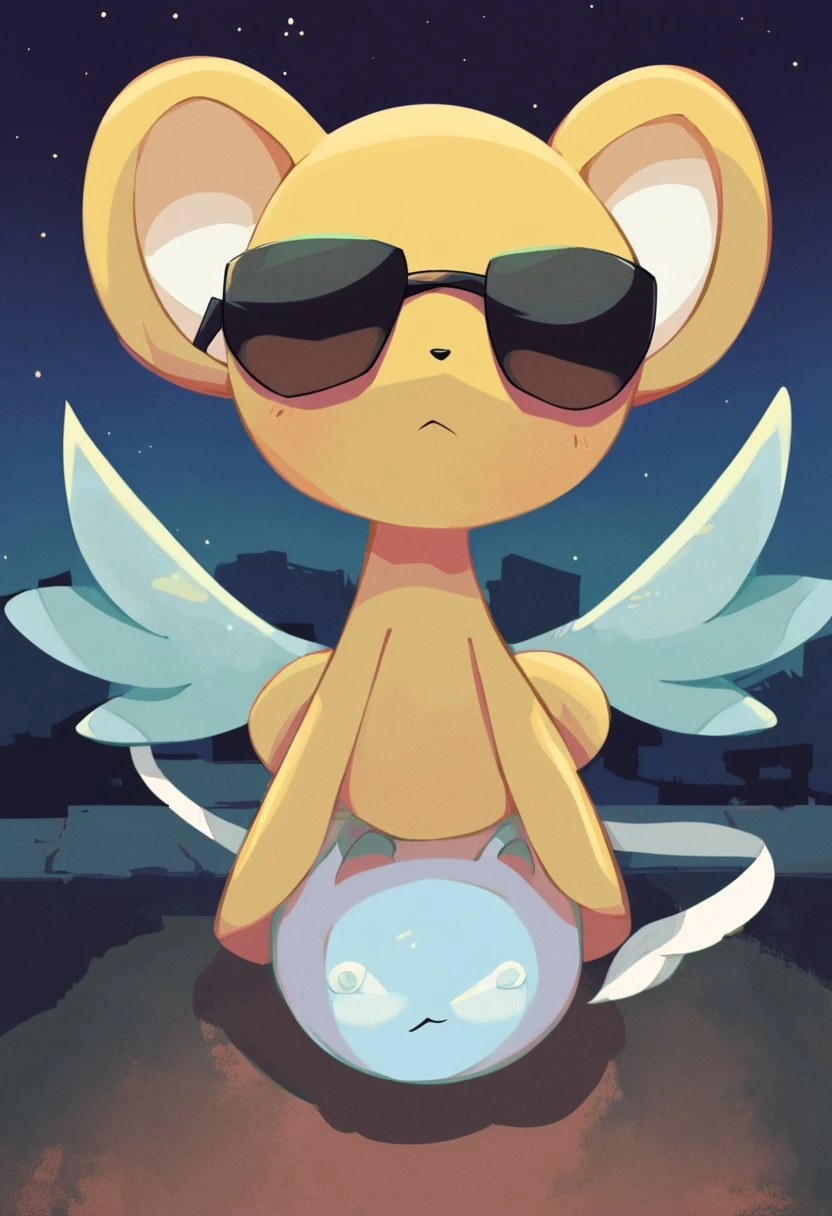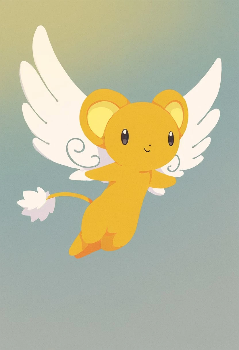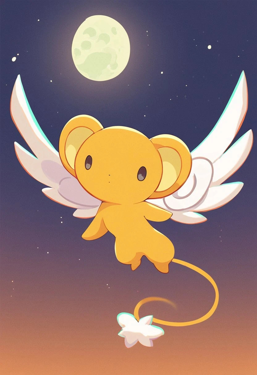 tags recommended: Kero, yellow fur, small dot eyes, small black pupils, flying, tail, angel wings, round ears, round head, fingerless hands,, dot nose, small mouth, pokemon creature