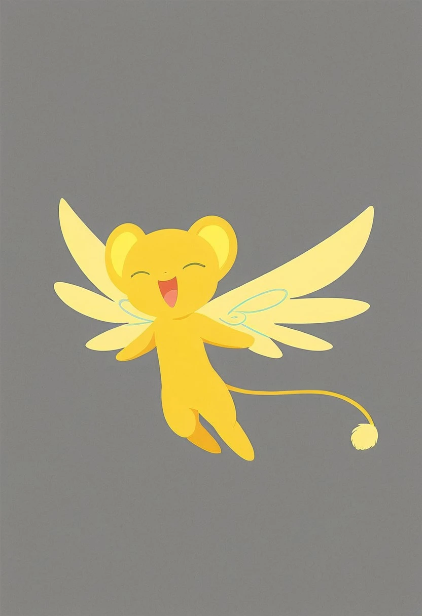 Kero, yellow fur, small dot eyes, small black pupils, flying, tail, angel wings, round ears, round head, fingerless hands, happy, dot nose,, small mouth, pokemon creature