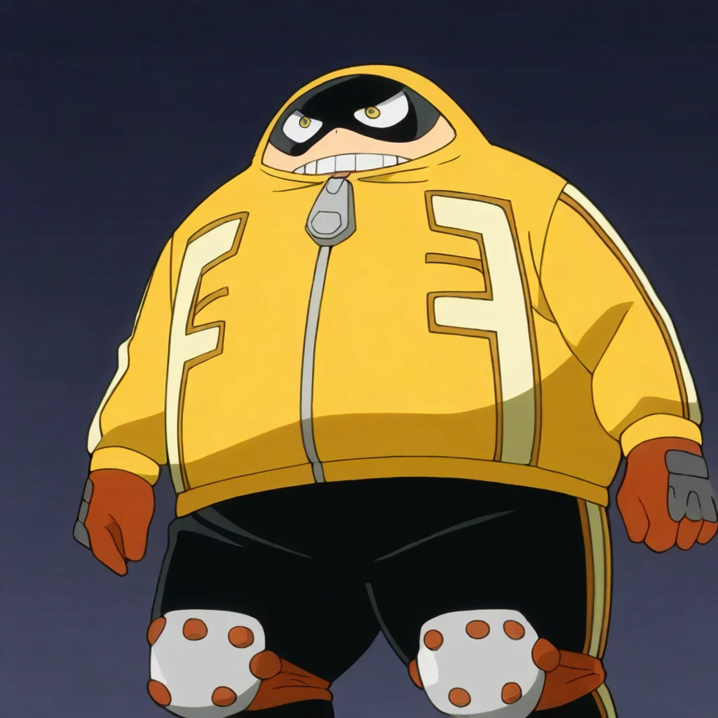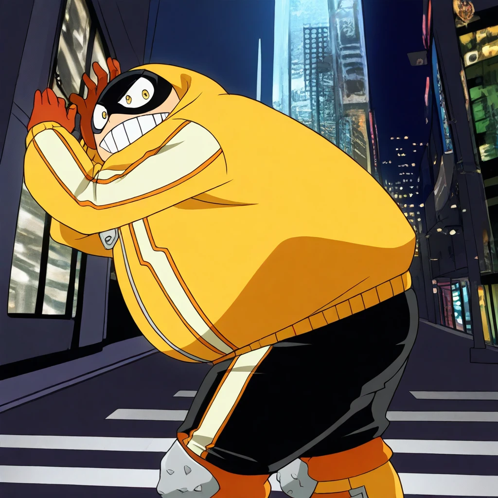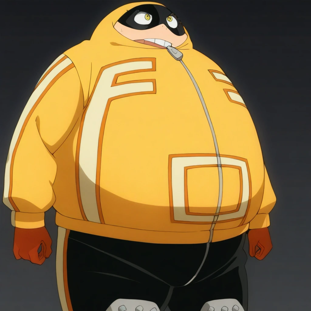 fatgum, male, overweight, black mask, yellow jacket, black track pants, boots, knee pads, gloves, hood up, yellow eyes, zipper pull tab,
