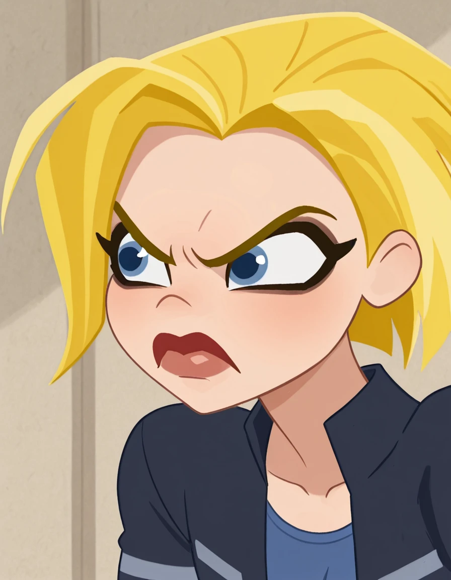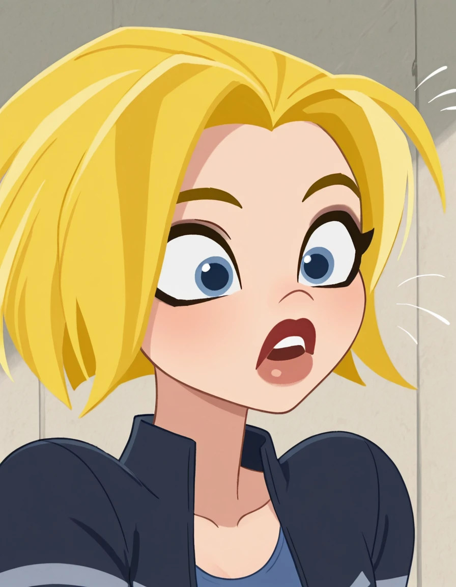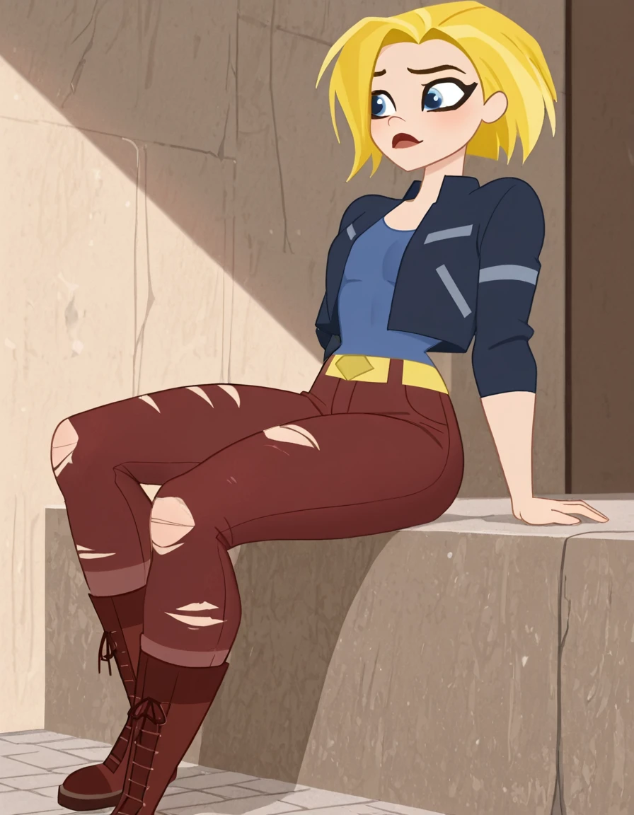 dcshgsupergirl, blonde hair, short hair, blue eyes, red lips, blue top, blue short jacket, belt, dark red jeans, torn jeans, red calf length boots