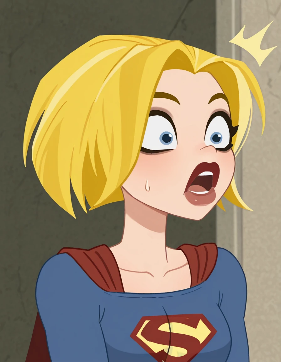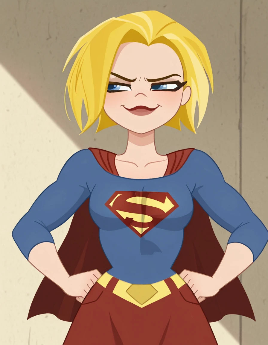 dcshgsupergirl, blonde hair, short hair, blue eyes, red lips, blue top, red cape, red short skirt, v shaped belt, red kneehigh boots