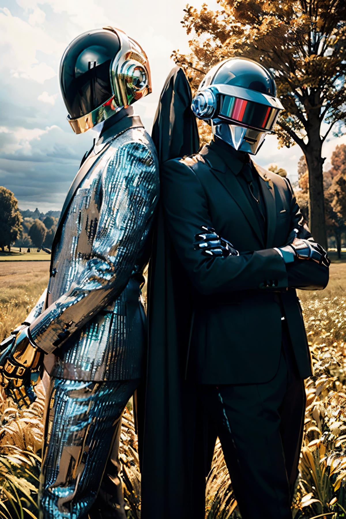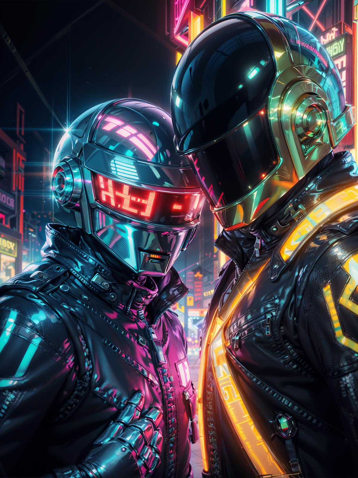Unfortunately, while SDXL understands their helmets closer, SD1.5 struggles to separate them. This was an effort to try to teach SD that they are two separate people, and it kinda worked. It might take quite a few generations, but you can pull them out individually. I think it could be better, so I'll probably train it again in the future on SDXL. Most all of the data is from the RAM era, but you can get their typical outfits with "leather jackets" for Discovery/HAA and "suits"/"shiny suit" for RAM. I did not include the Tron or white variants of their outfits.