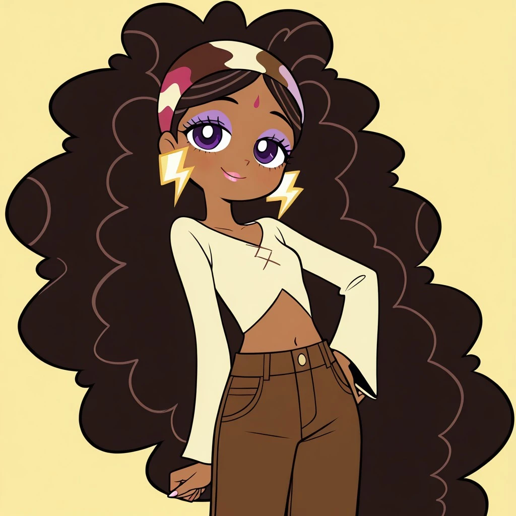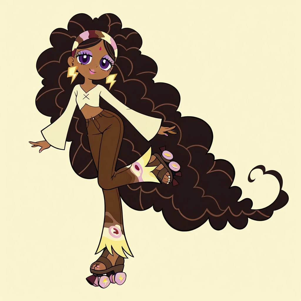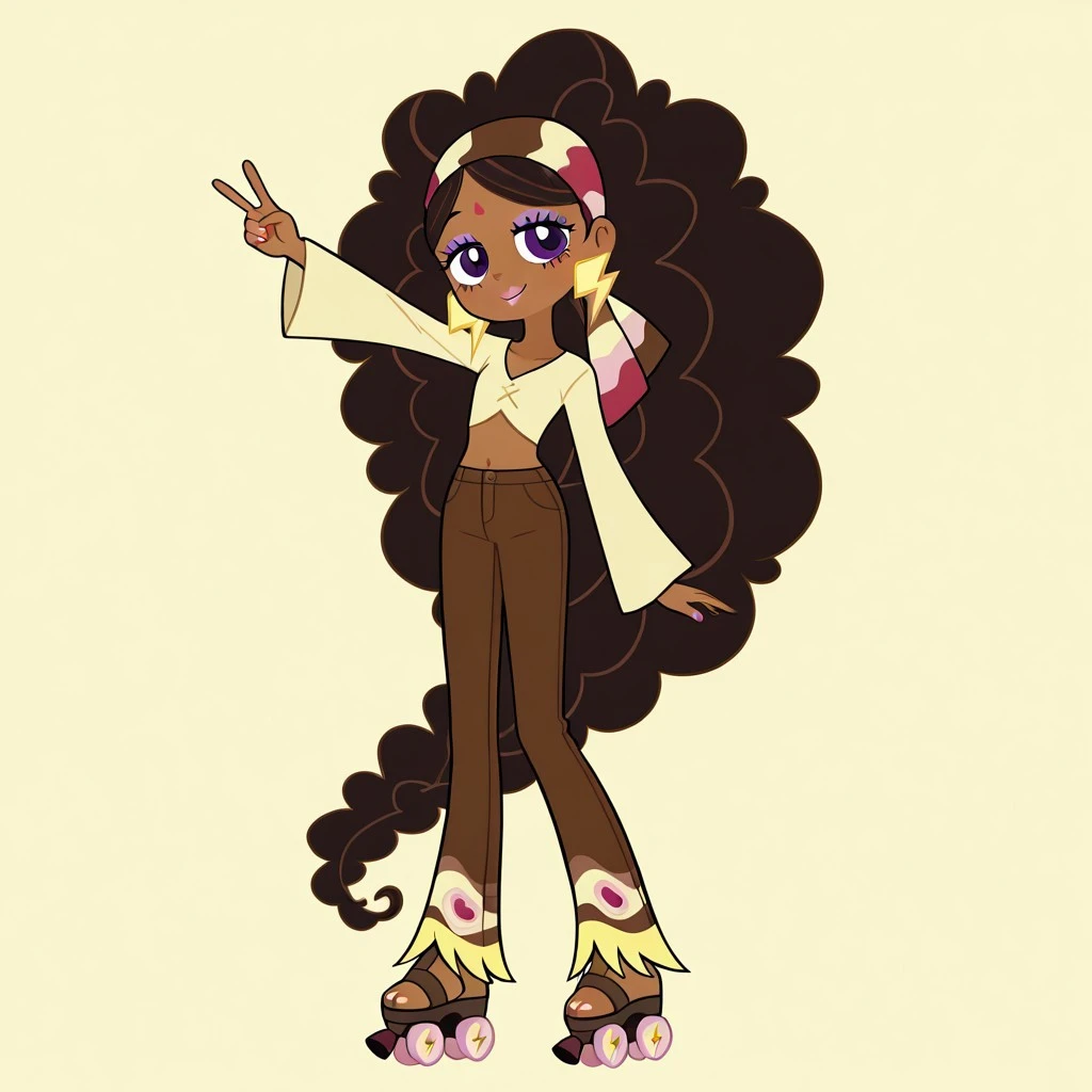 jupitermwatgg, 1girl, solo, dark skin, dark brown hair, long hair, absurdly long hair, afro hair, hair bandana, forehead marking, purple eyes, purple eyeshadow, pink lipstick, lightning earrings, light yellow crop top, long sleeves, brown pants, pink toenail polish, open toed shoes, brown roller skates