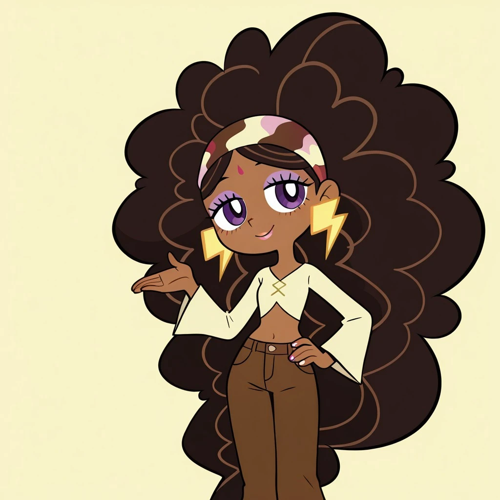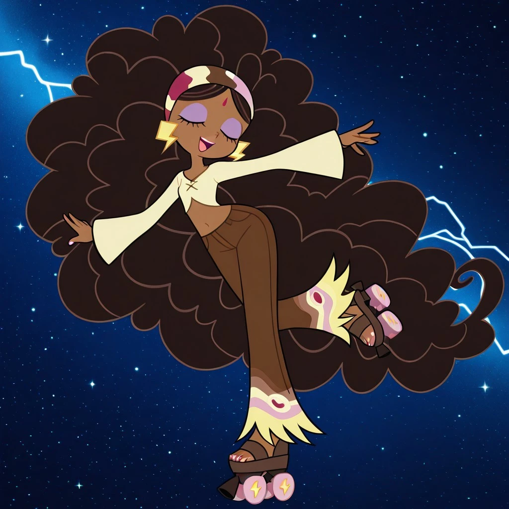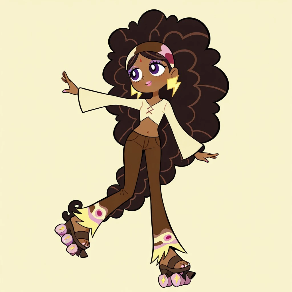 jupitermwatgg, 1girl, solo, dark skin, dark brown hair, long hair, absurdly long hair, afro hair, hair bandana, forehead marking, purple eyes, purple eyeshadow, pink lipstick, lightning earrings, light yellow crop top, long sleeves, brown pants, pink toenail polish, open toed shoes, brown roller skates