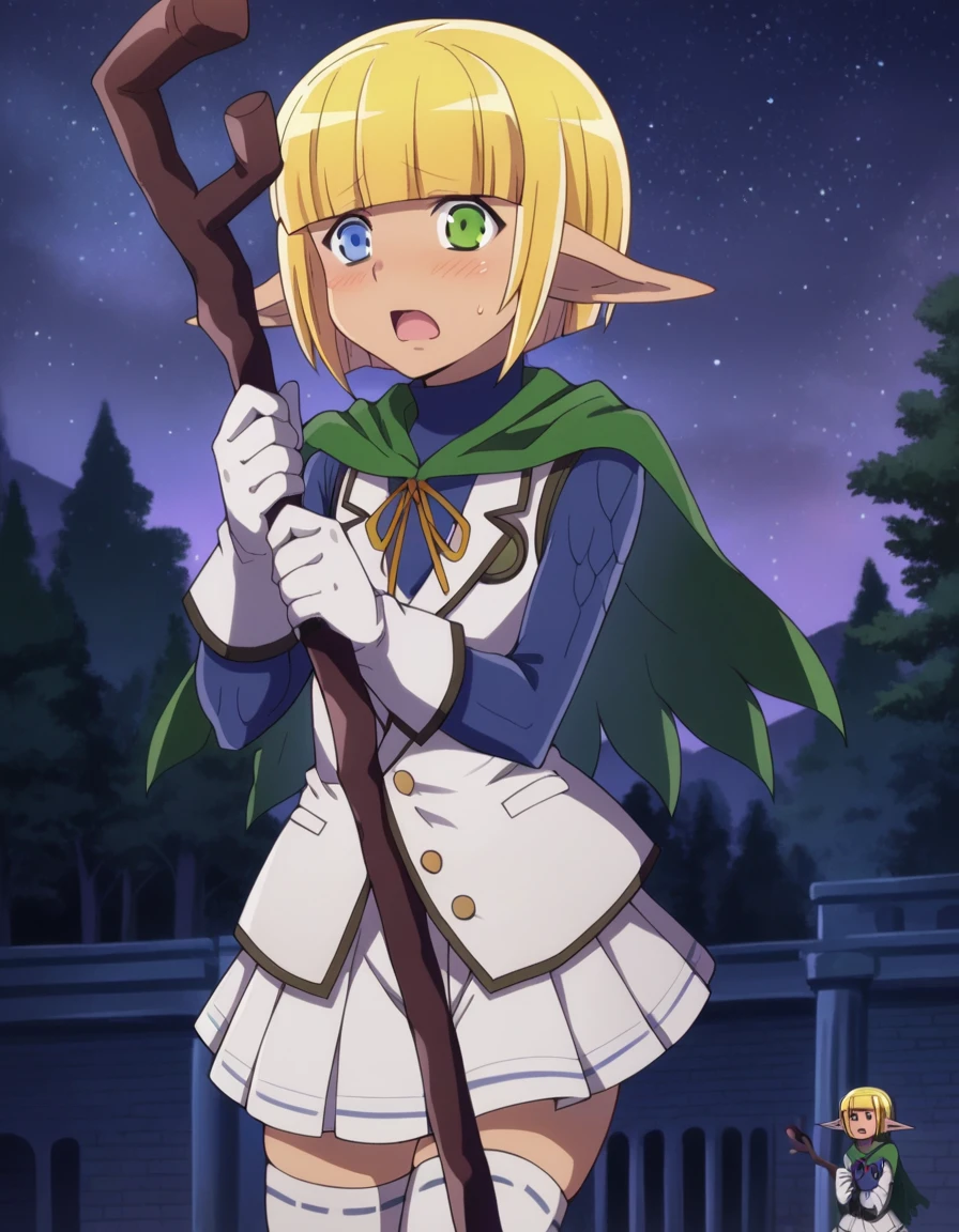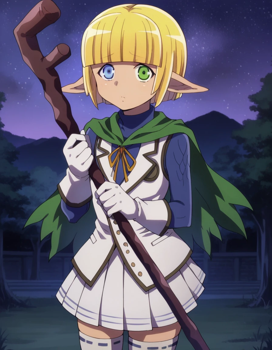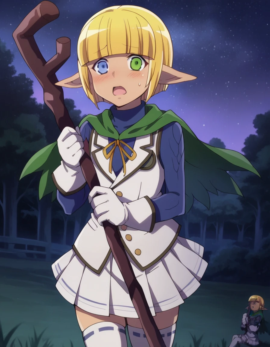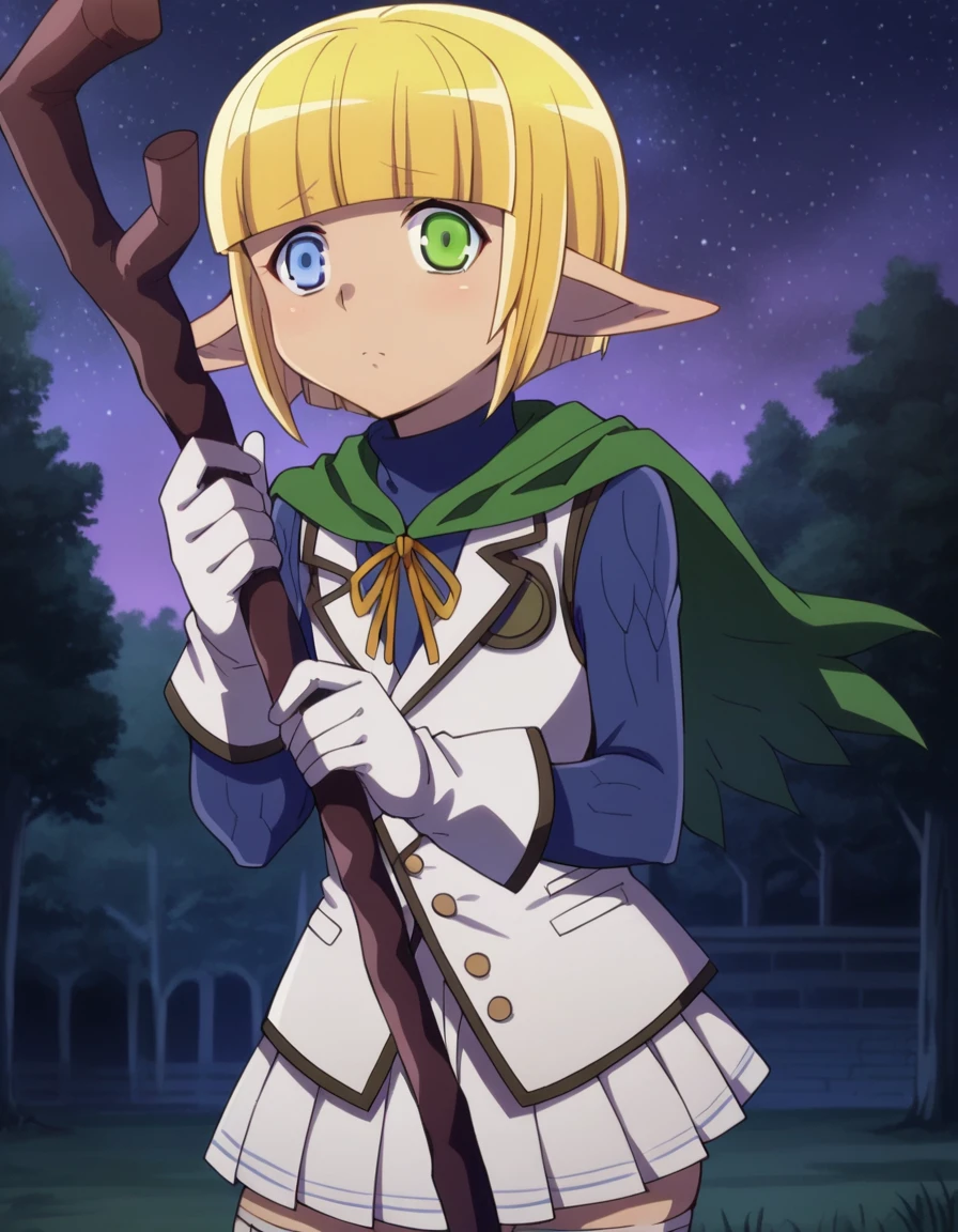 mare bello fiore, short hair, bangs, blue eyes, blonde hair, green eyes, pointy ears, blunt bangs, heterochromia, elf, otoko no ko, dark elf,