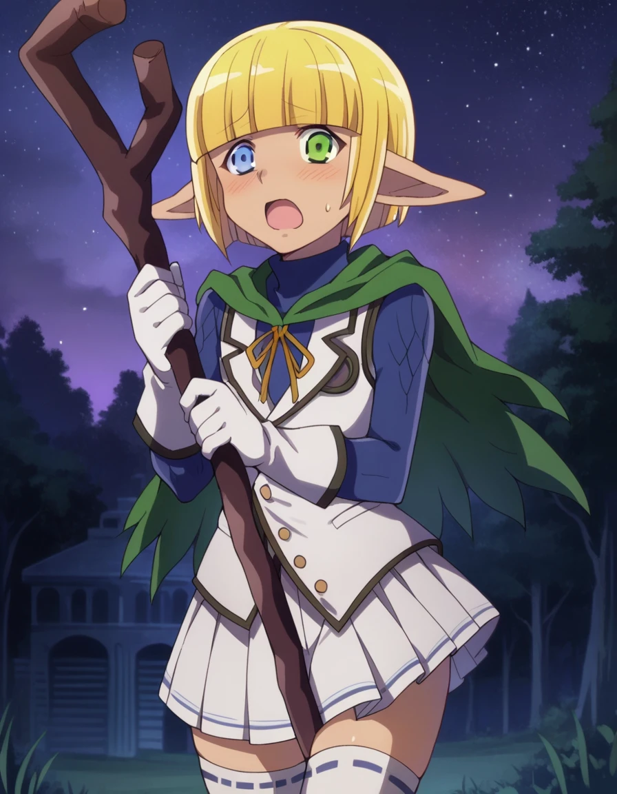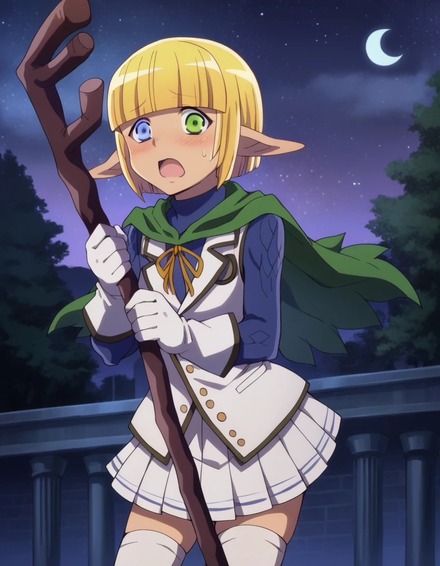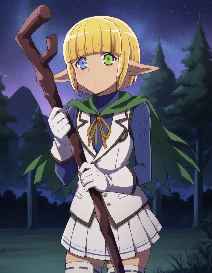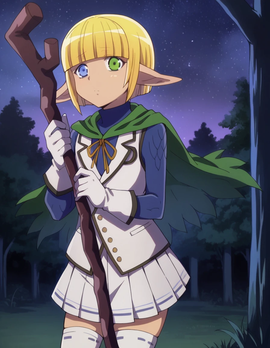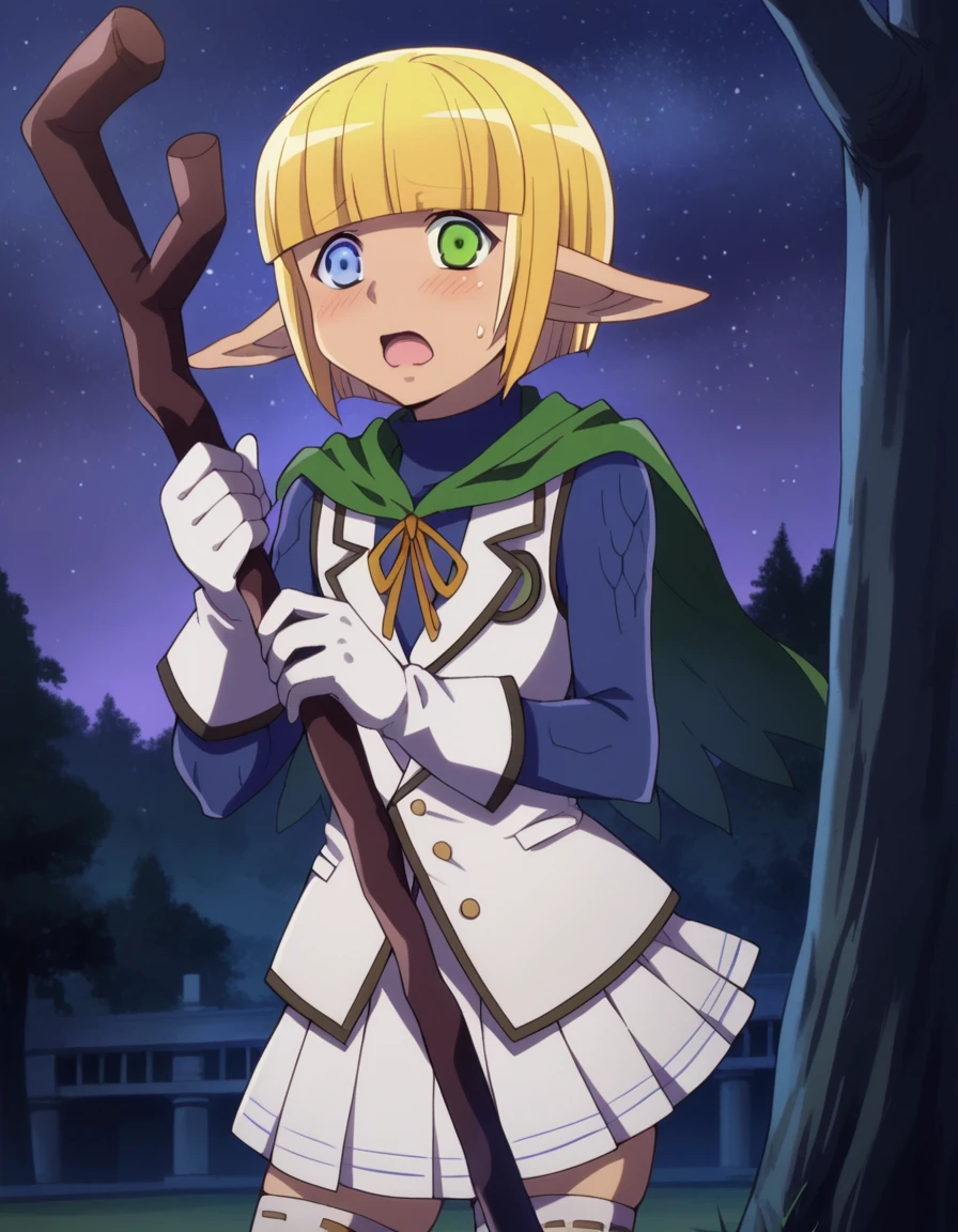 mare bello fiore, short hair, bangs, blue eyes, blonde hair, green eyes, pointy ears, blunt bangs, heterochromia, elf, otoko no ko, dark elf,