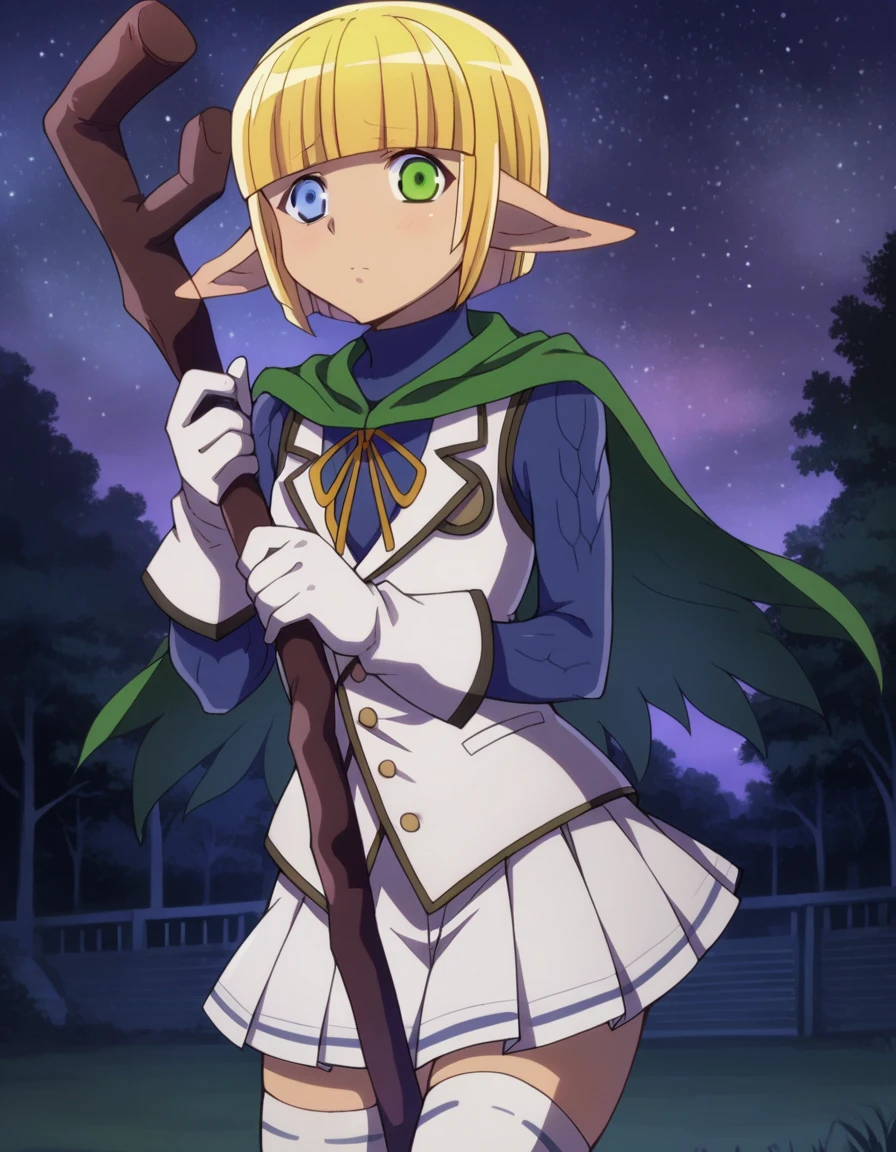 skirt, thighhighs, gloves, pleated skirt, white gloves, cape, white thighhighs, zettai ryouiki, capelet, staff, crossdressing, holding staff,