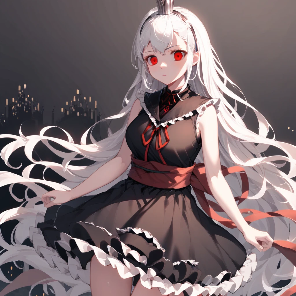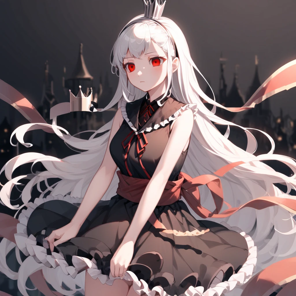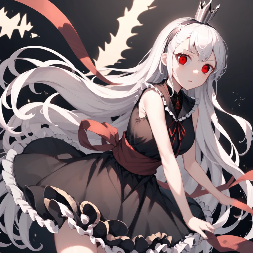 very long hair, red eyes, black dress, red ribbon, white hair, hairband, frills, sleeveless, sash, sleeveless dress, short dress, crown