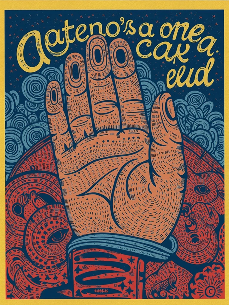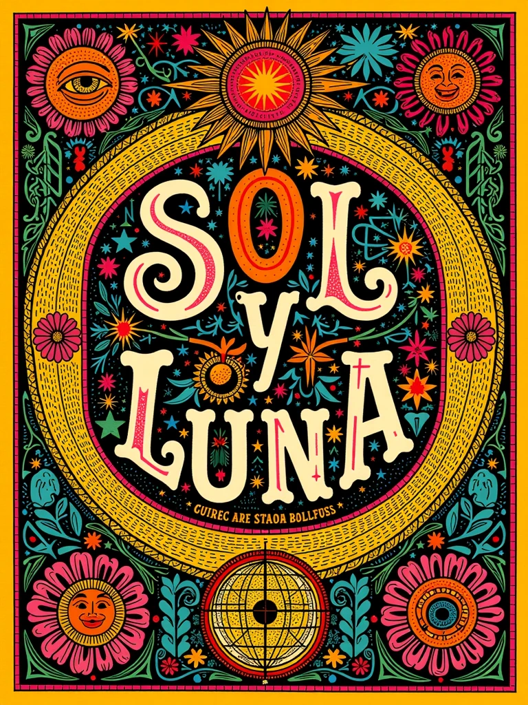 Prompt inspiration: Poster art, hand-lettering, calavera, folk-art, floral decoration, papel picado, intricate flourishes, sun and moon