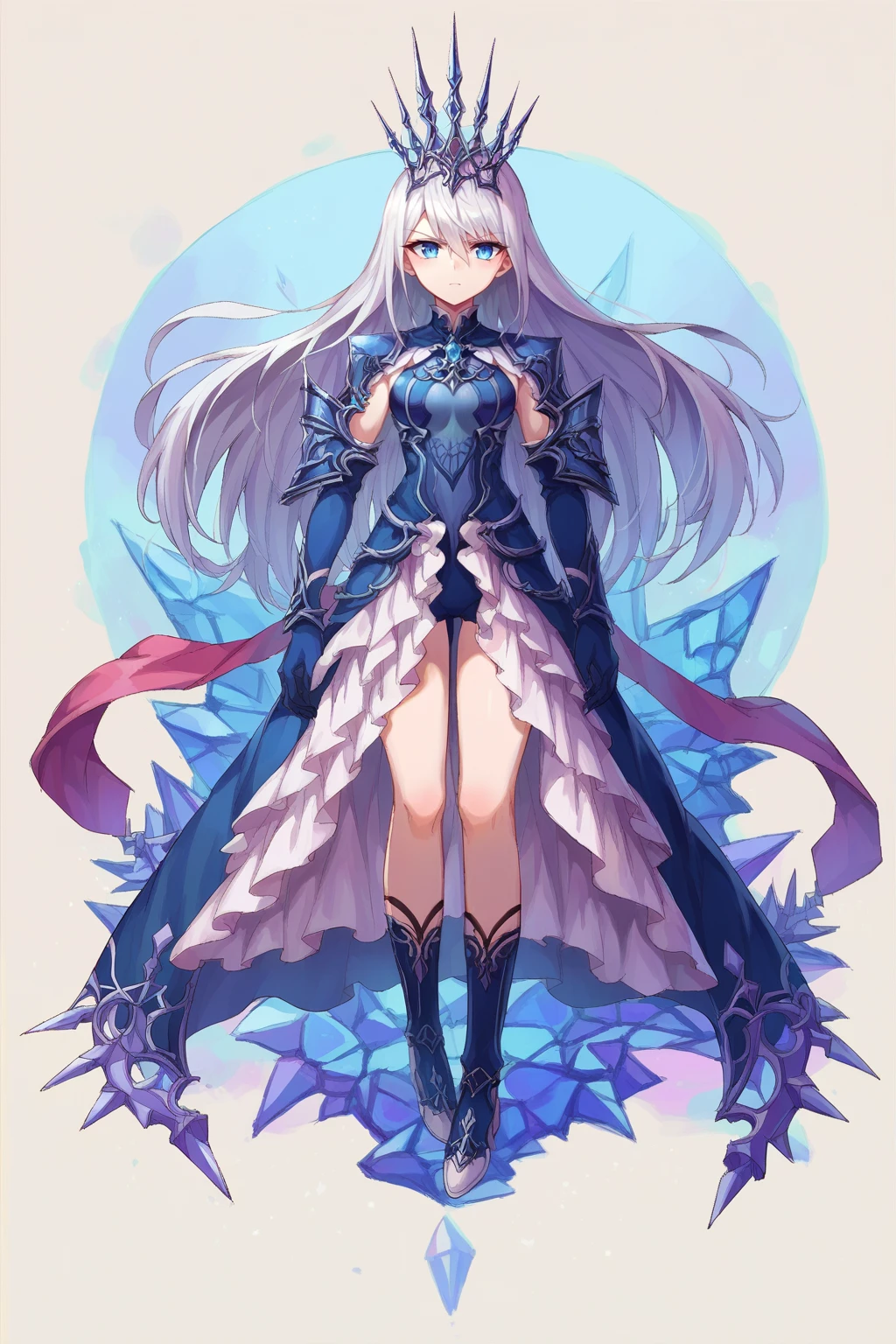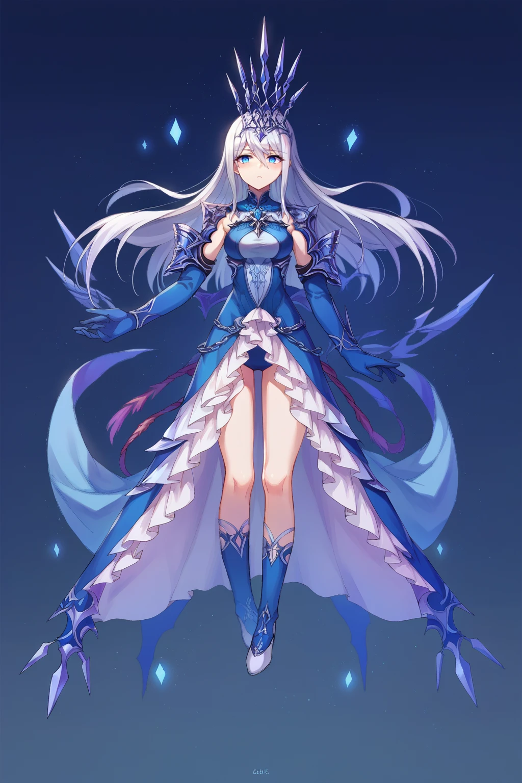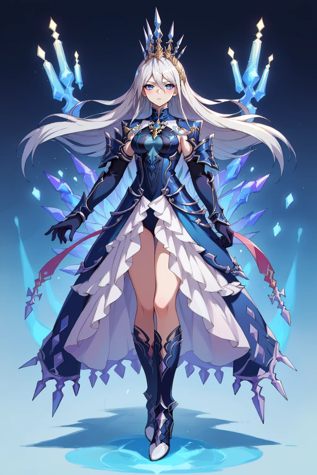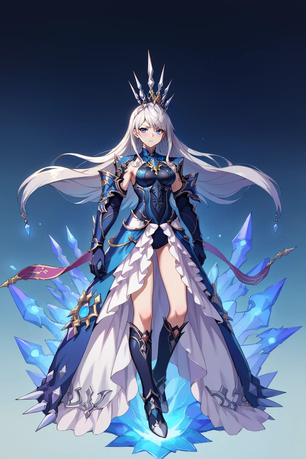 edgShiva,white hair,crown of ice,dress,armor blue eyes, gloves