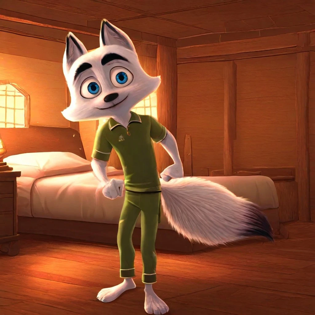 Swifty, fox boy, fox ears, blue eyes, thick black eyebrows, tail, white fur, fox nose, arctic fox, green jacket with fur trim, blue jeans, brown boots, purple undershirt, zipper, fur trim on sleeves, long sleeves,
