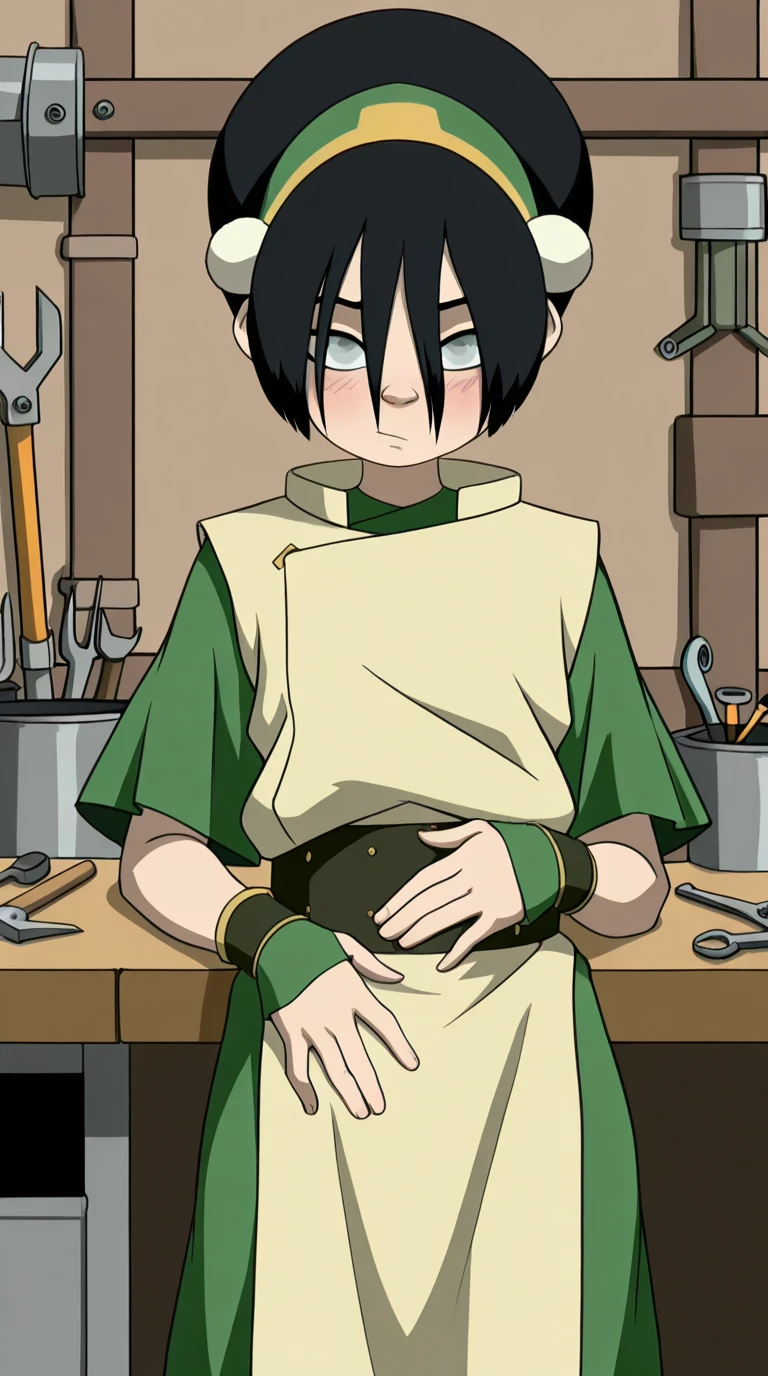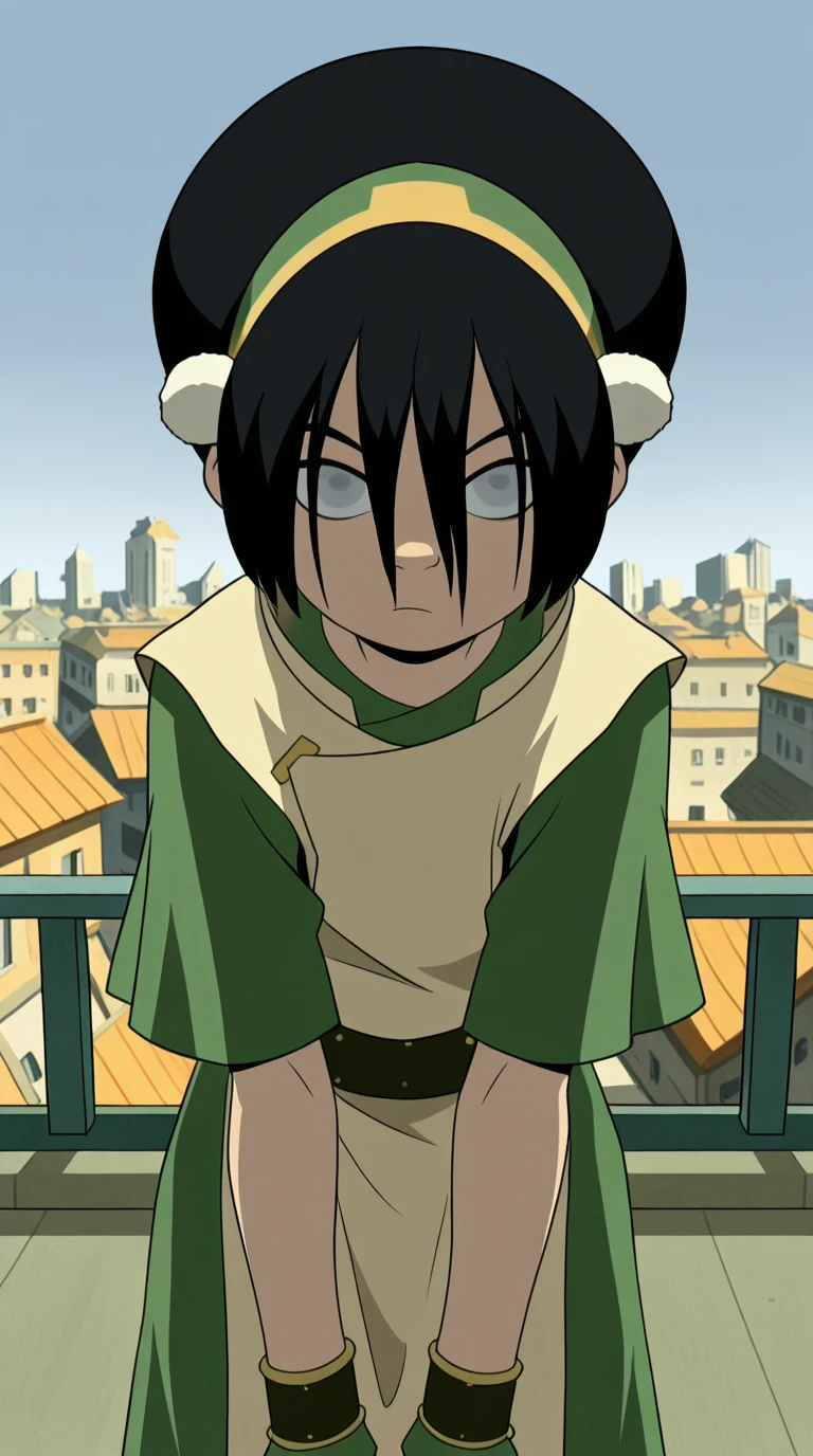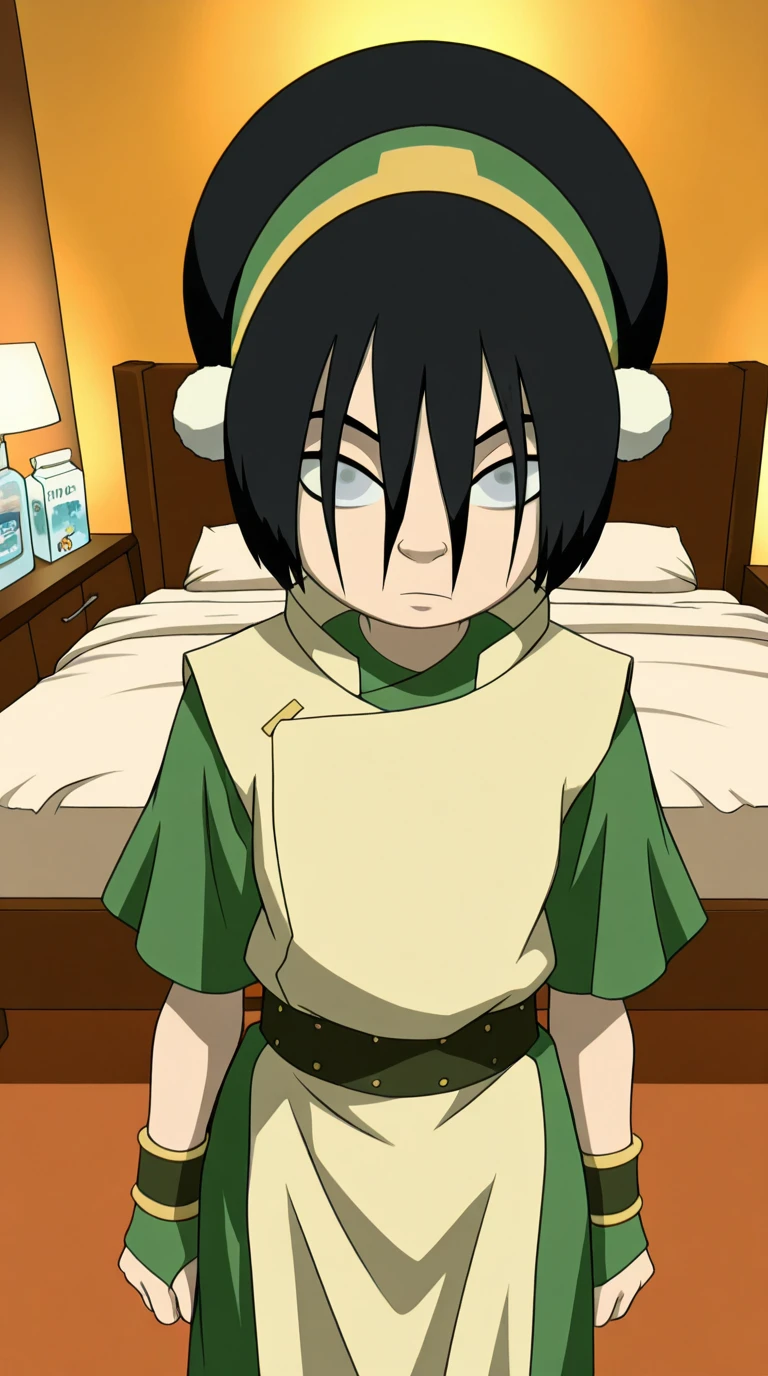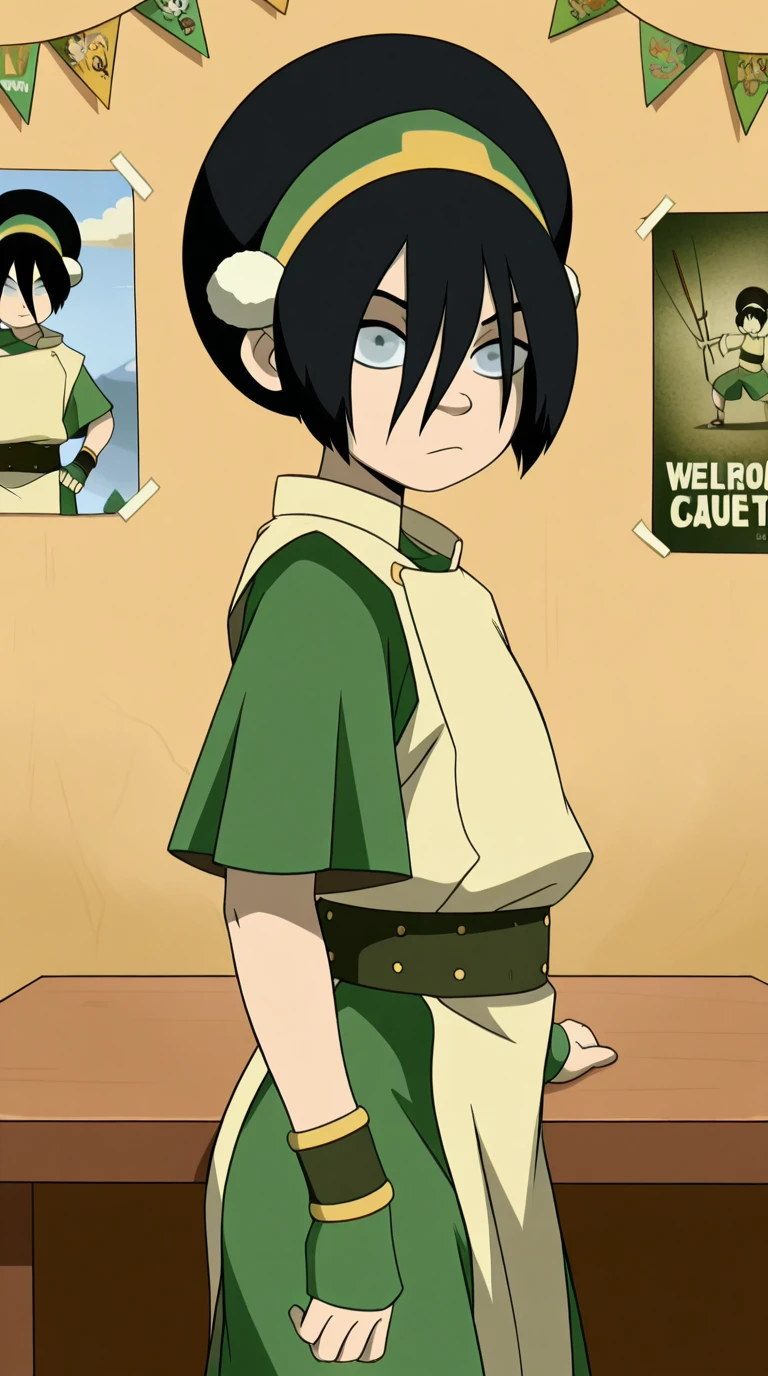 toph beifong, black hair, hairband, blind, grey eyes, hair between eyes, short hair, toon (style)