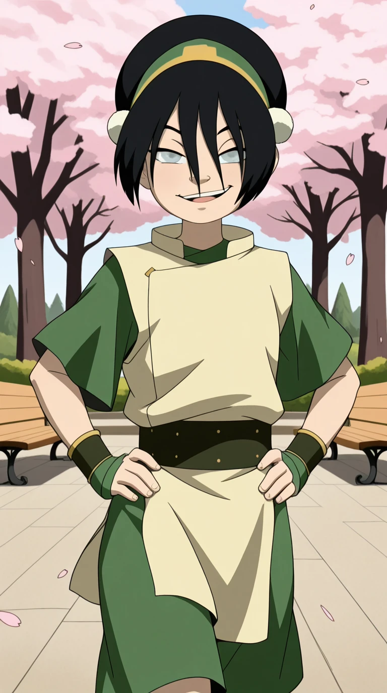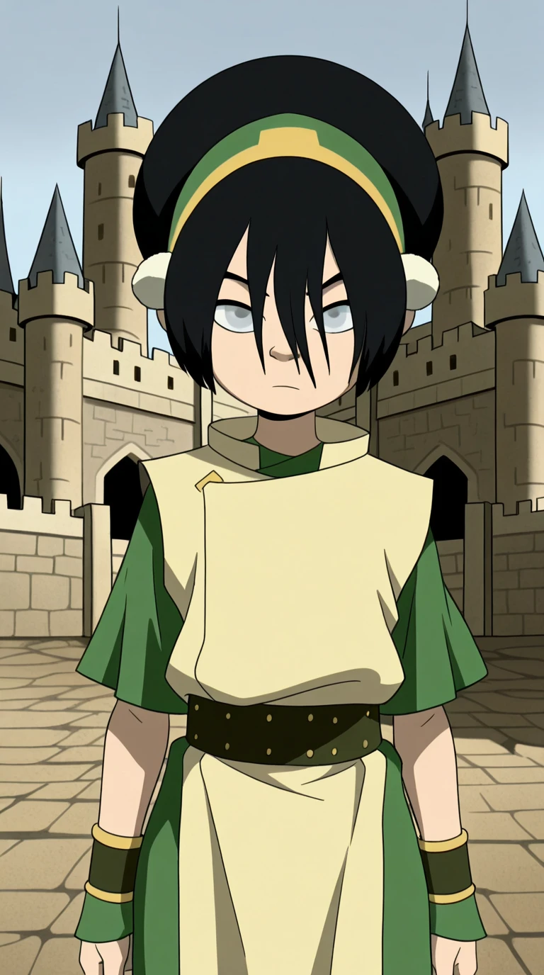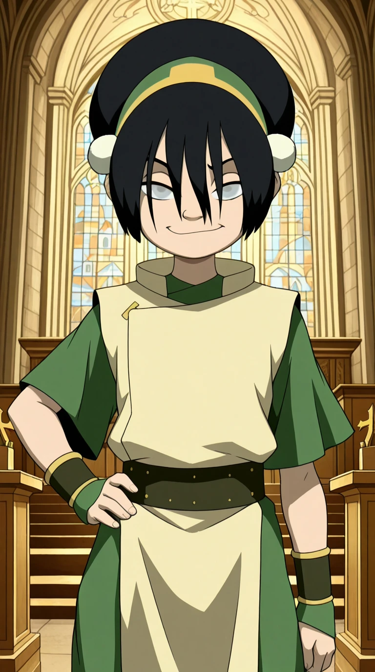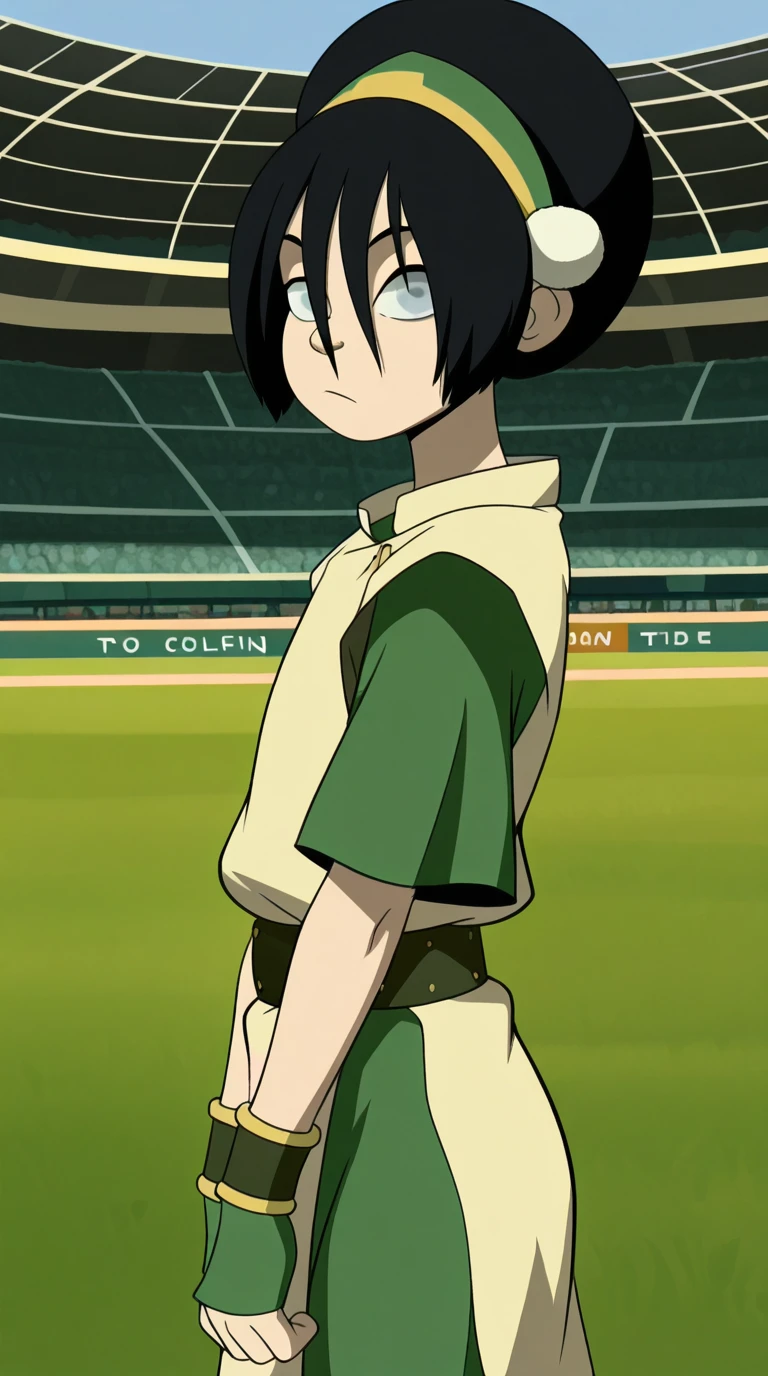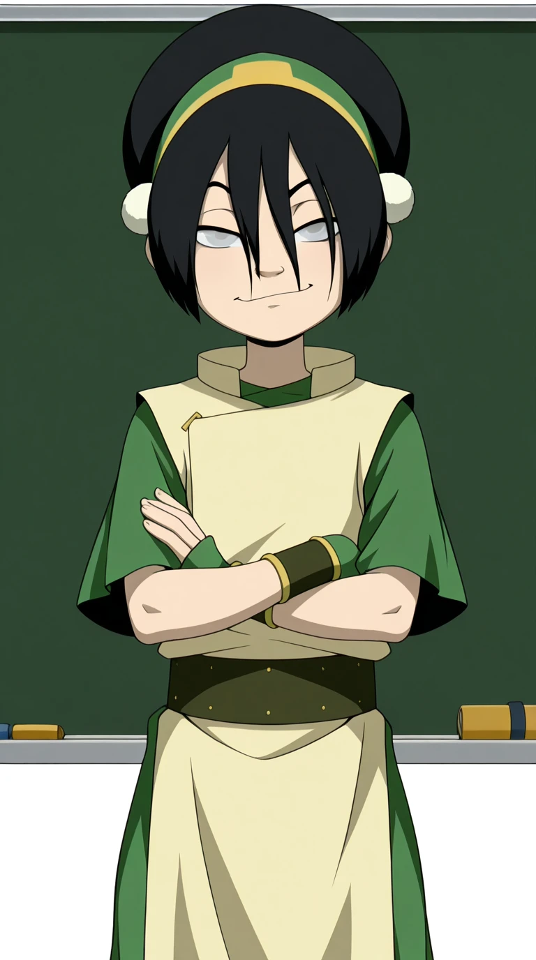 toph beifong, black hair, hairband, blind, grey eyes, hair between eyes, short hair, toon (style)