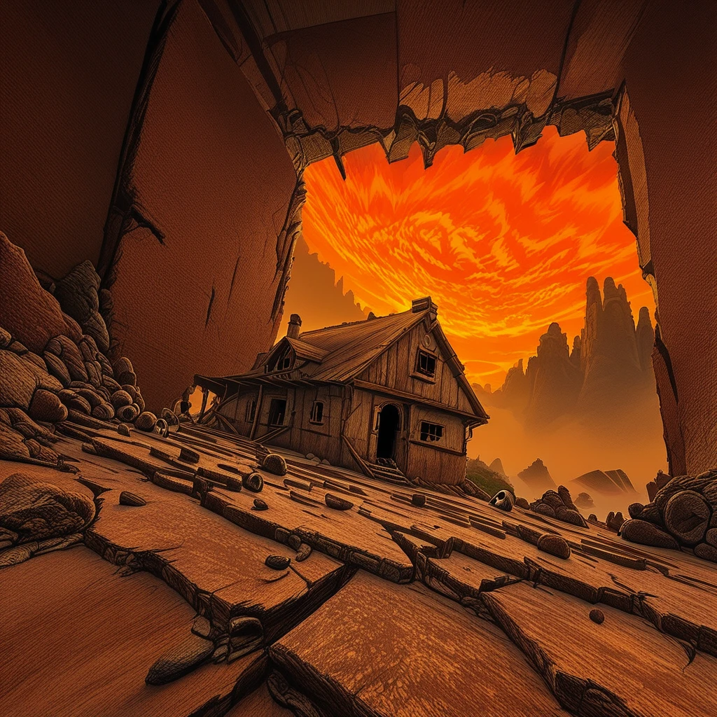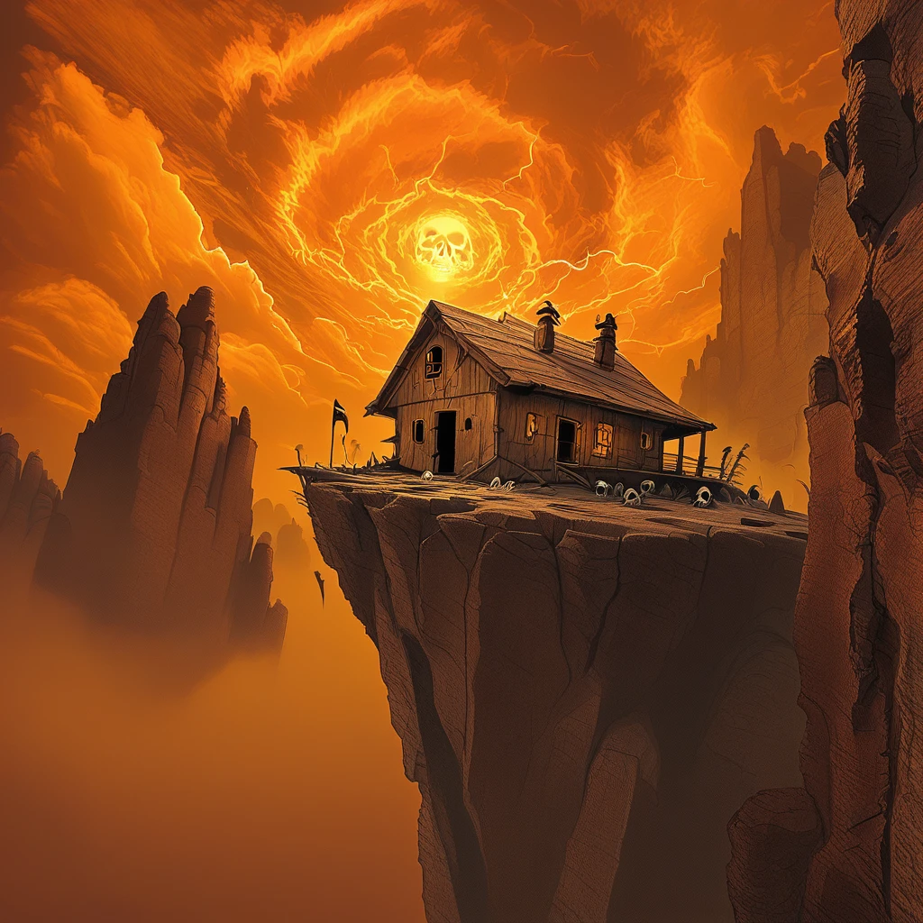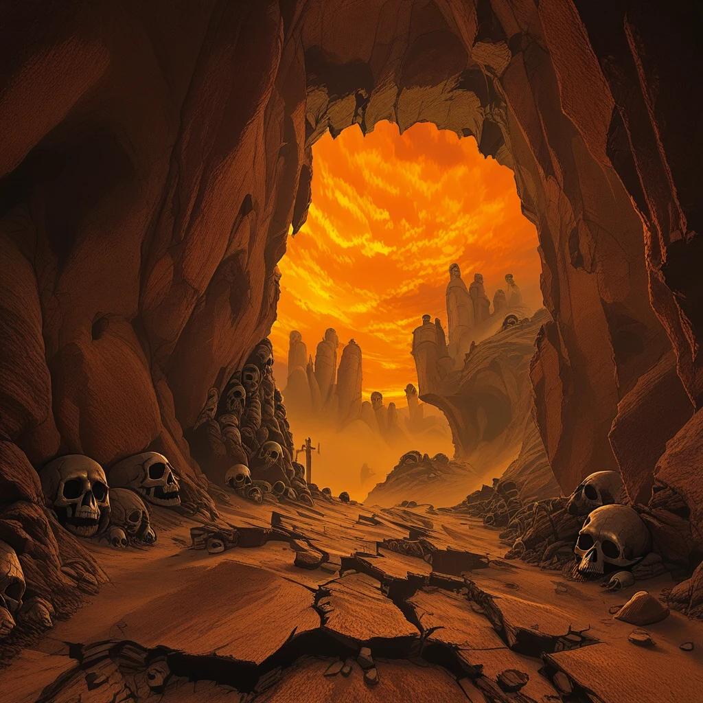 cursed dimension, surreal landscape, floating stone formations, rust-colored rocks, bone-like textures, skeletal remains, distorted skulls, eerie atmosphere, orange and yellow mist, glowing orange sky, paradoxical daylight, ancient ruins, cracked stone surfaces, ghostly shadows, haunting environment, abandoned world, terrifying beauty, alien terrain, warm dusty lighting, jagged cliffs, rotting structures, eerie floating islands, rusted metal details, weathered wood, decayed architecture, otherworldly canyon, ominous cave entrances, burning skull eyes, surreal horror, endless loneliness