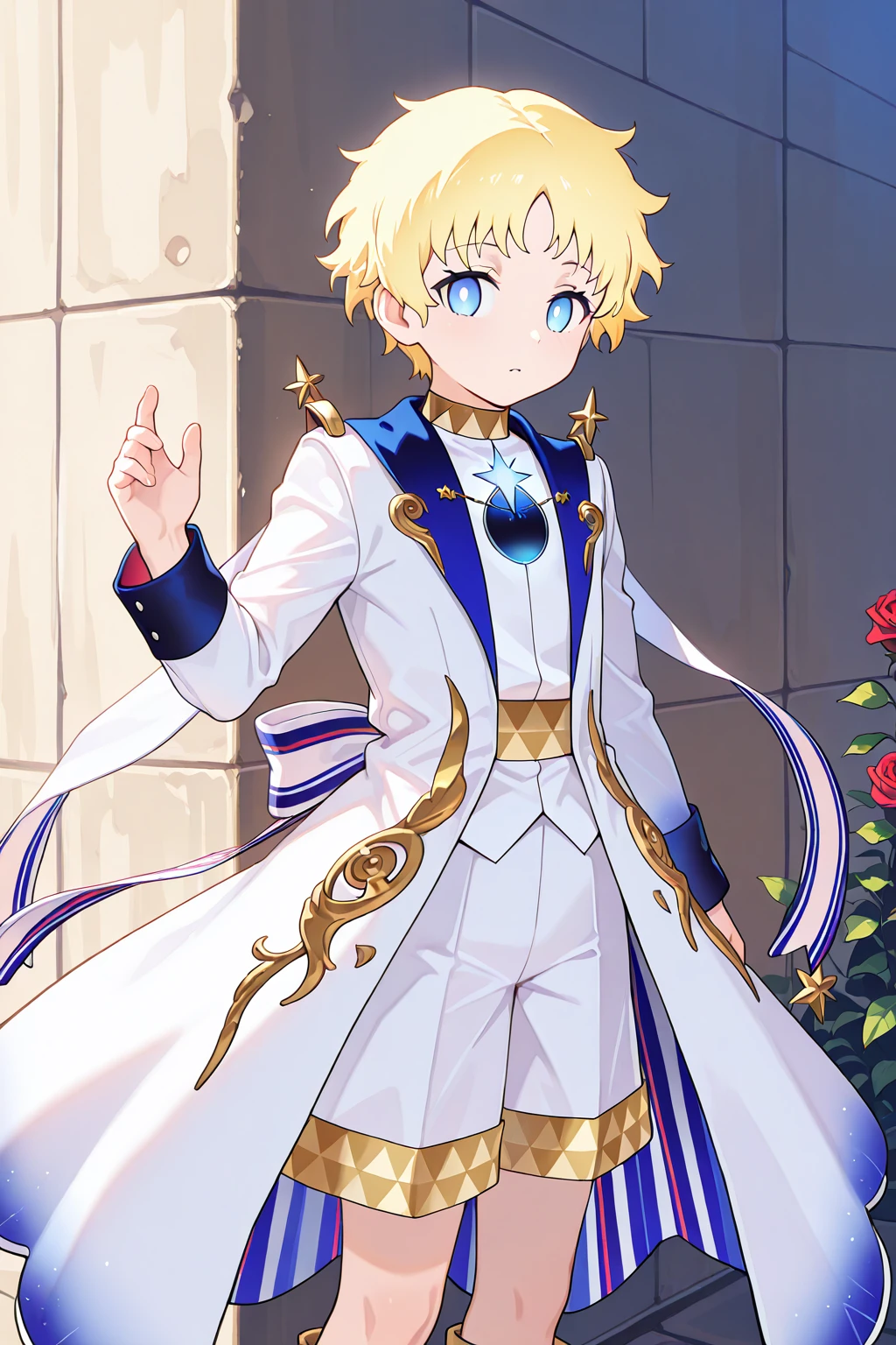 voyager, blonde hair, blue eyes, skin2, bright pupils, white pupils, belt, boots, purple_footwear, white_coat, white_shirt, white shorts, rose,