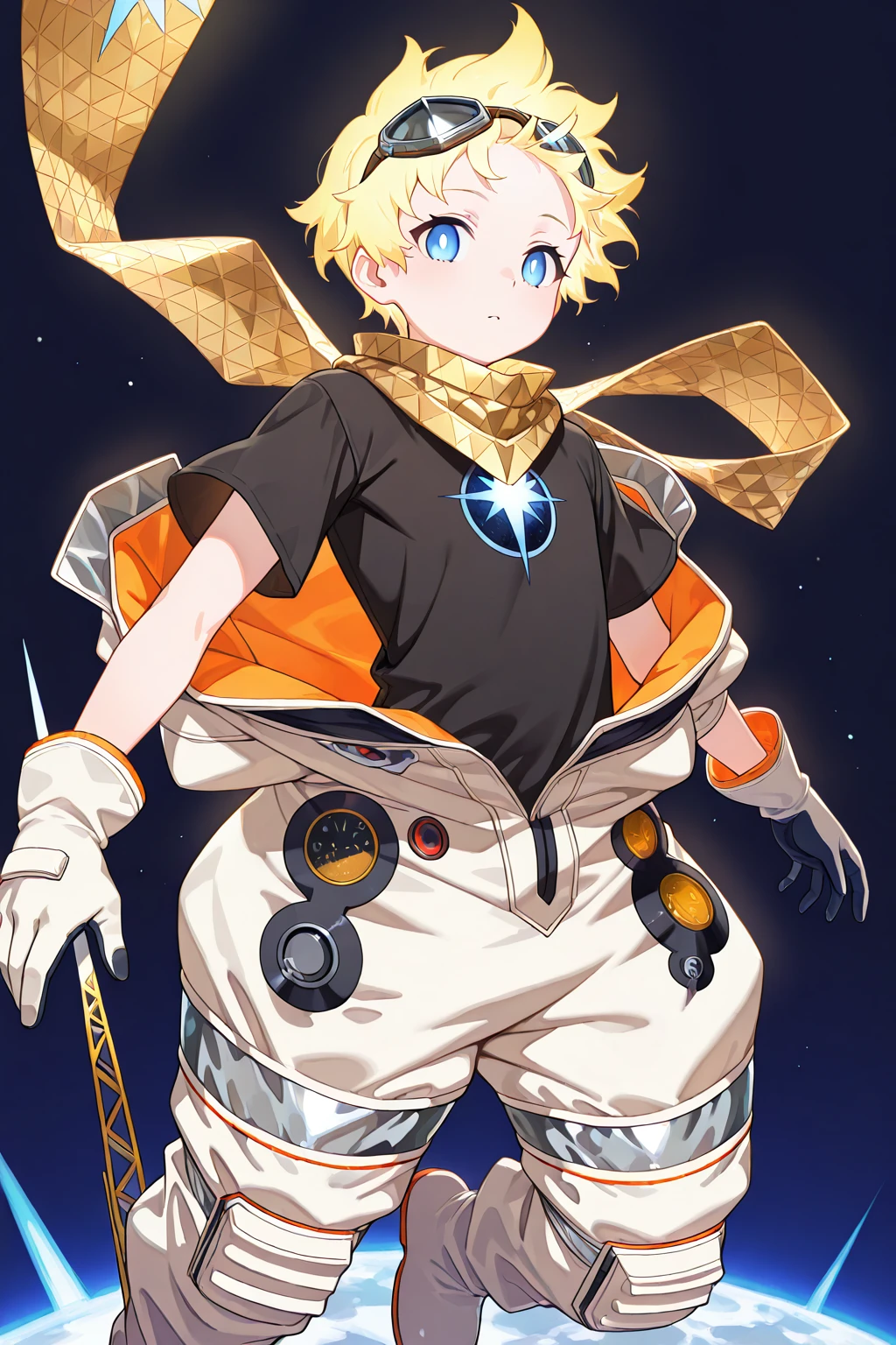 voyager, blonde hair, blue eyes, skin3, bright pupils, white pupils, goggles, spacesuit, scarf, yellow_scarf, gloves, full_body, open_clothes, bodysuit, (black_shirt:1.3), short_sleeves, floating, baggy_clothes,