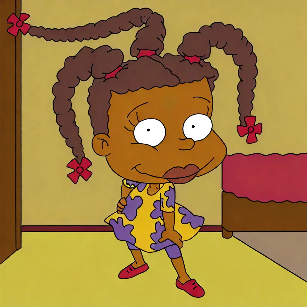 Susie,dark skin,triple braids,braid,brown hair,hair ornament,yellow and purple short-sleeved dress,purple leggings,red ballet flats