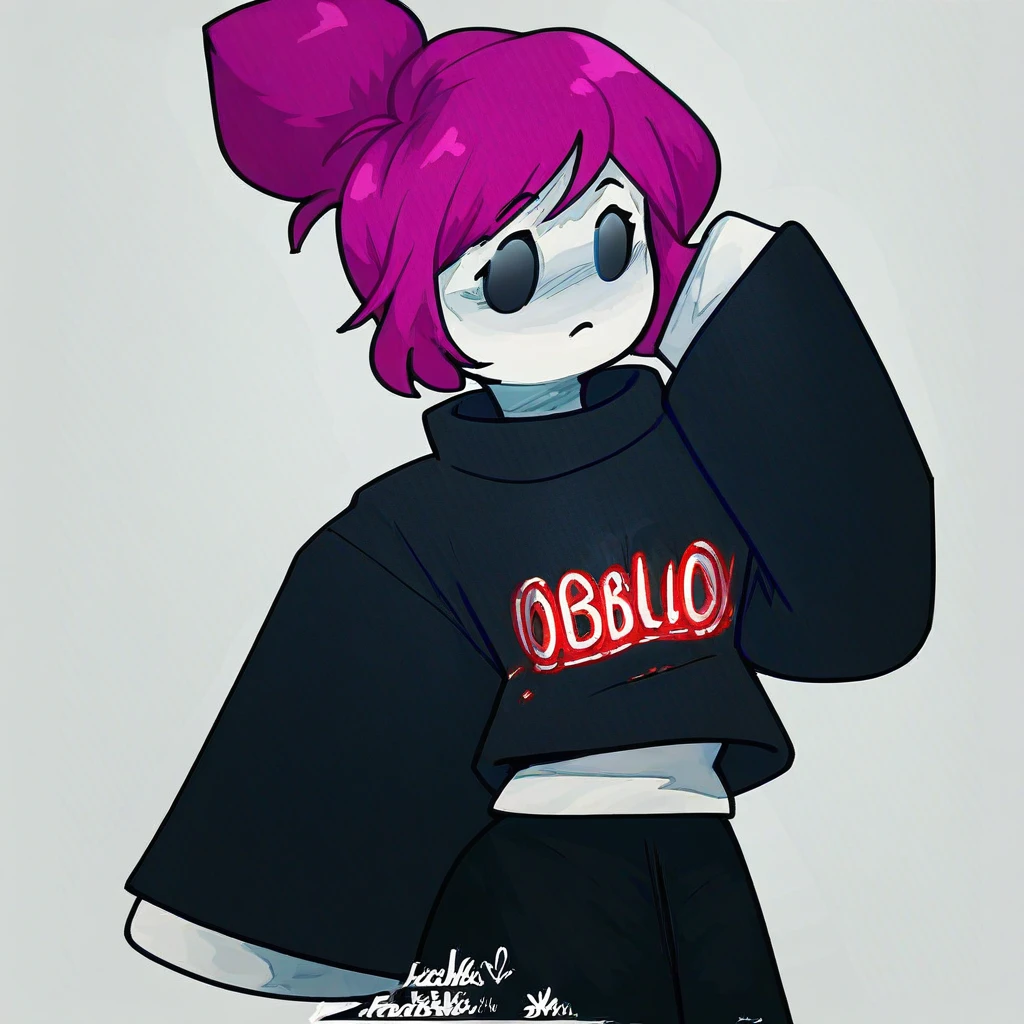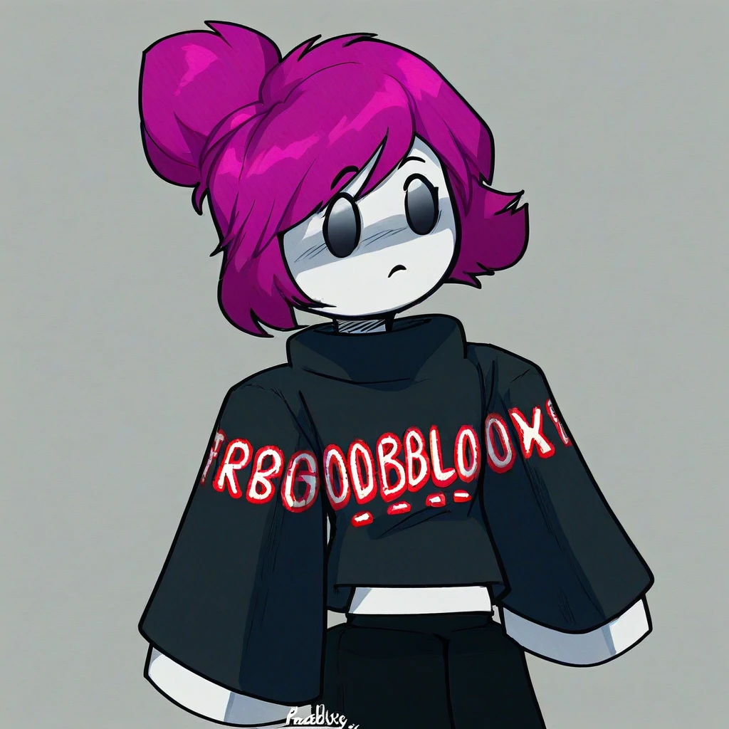 white face, black eyes, purple-pink short hair, black cropped jacket, blocky body, Roblox logo jacket, anthro, cartoony