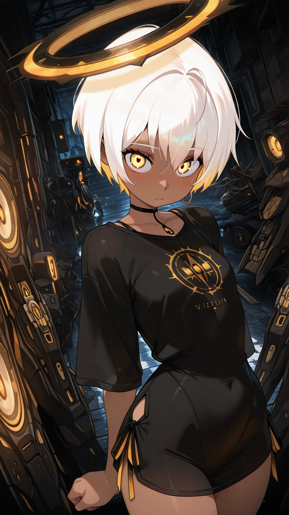 Example prompt : 1girl, solo, breasts, short hair, bangs,, thighhighs, gloves, navel, hair between eyes, bare shoulders, jewelry, underwear, panties, yellow eyes, white hair, earrings, small breasts, wings, black gloves, elbow gloves, white gloves, dark skin, fingerless gloves, stomach, white panties, white thighhighs, dark-skinned female, crop top, highleg, highleg panties, halo, mechanical wings