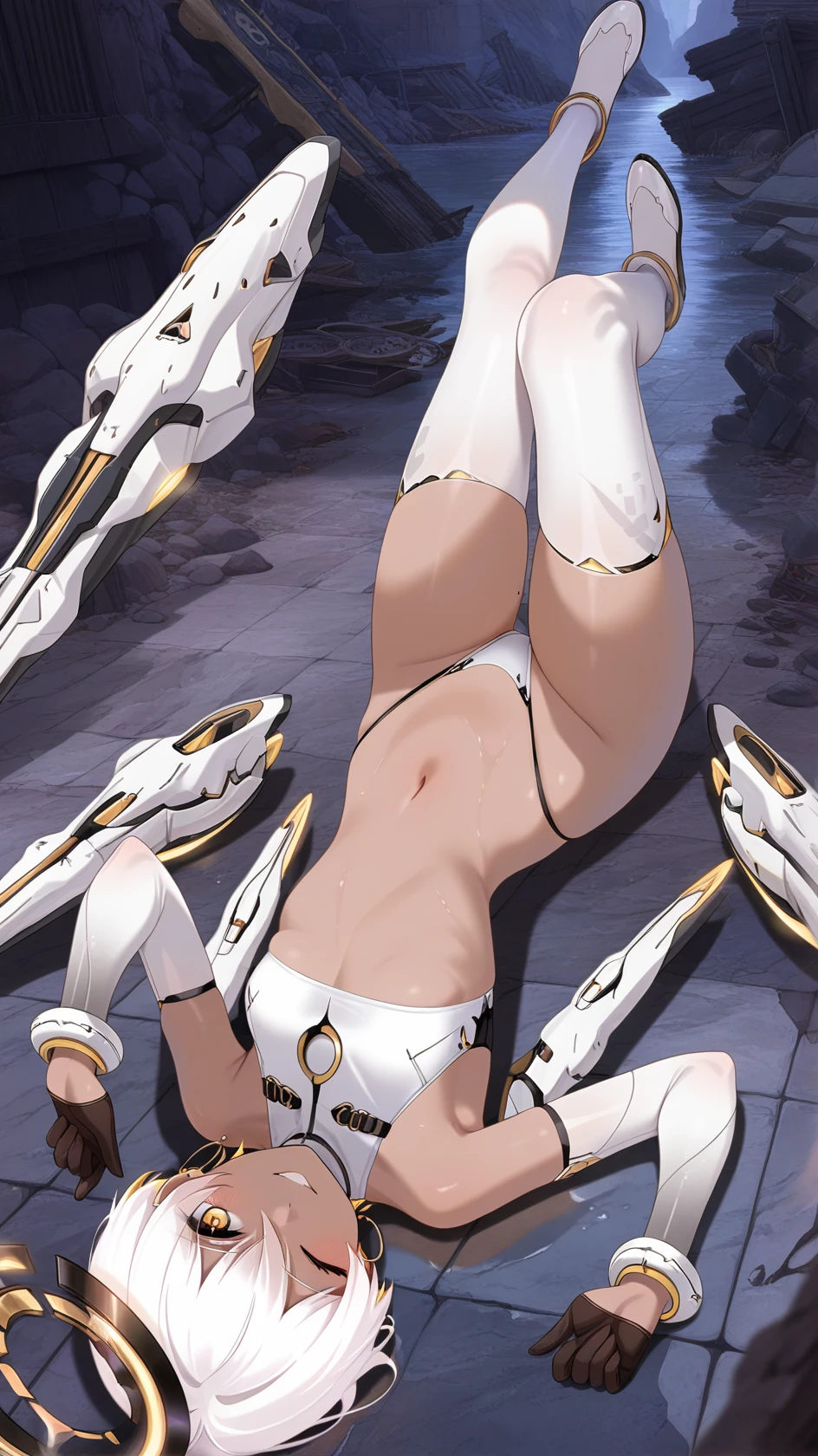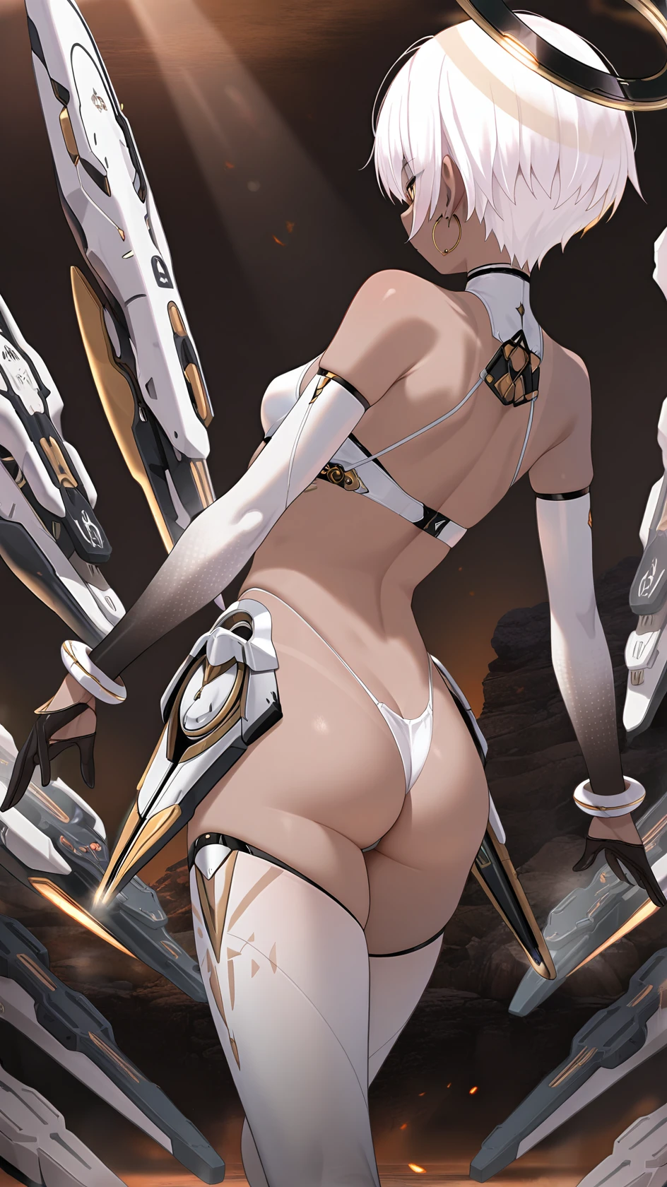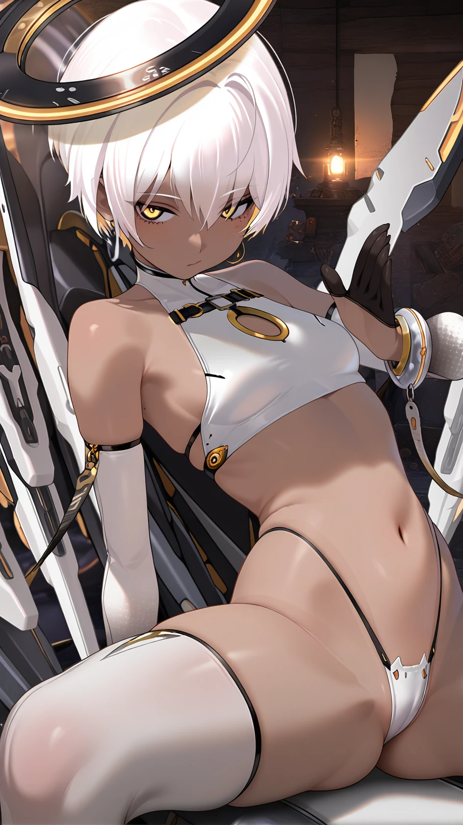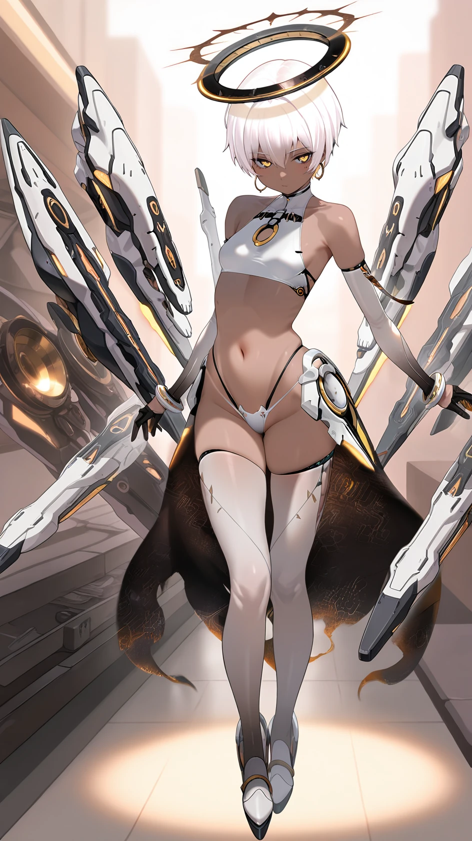 1girl, solo, breasts, short hair, bangs,, thighhighs, gloves, navel, hair between eyes, bare shoulders, jewelry, underwear, panties, yellow eyes, white hair, earrings, small breasts, wings, black gloves, elbow gloves, white gloves, dark skin, fingerless gloves, stomach, white panties, white thighhighs, dark-skinned female, crop top, highleg, highleg panties, halo, mechanical wings