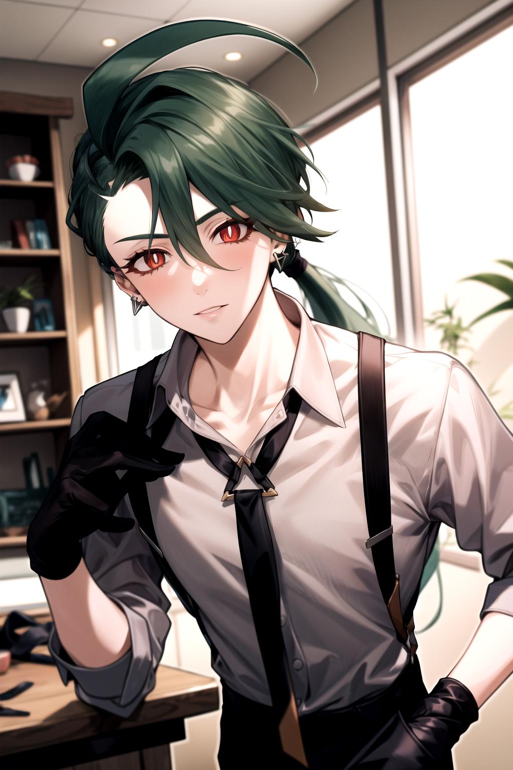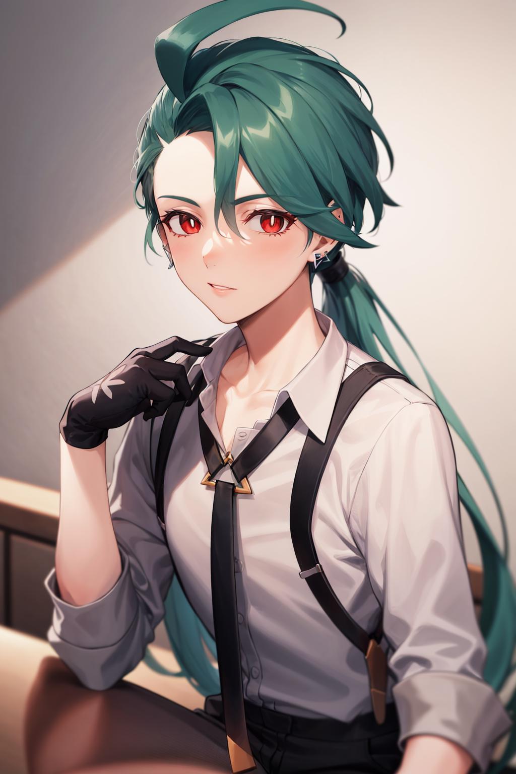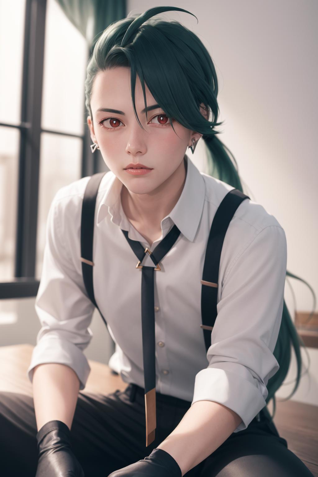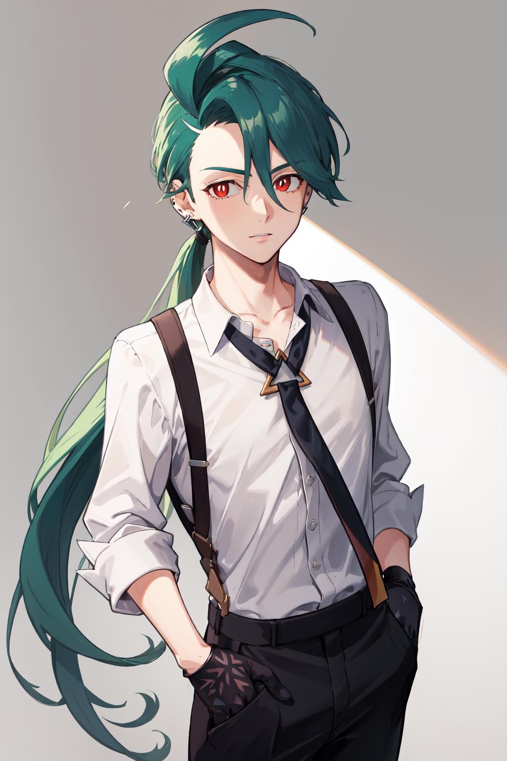 Default Outfit: grey collared shirt, necktie, suspenders, black pants, gloves, earrings