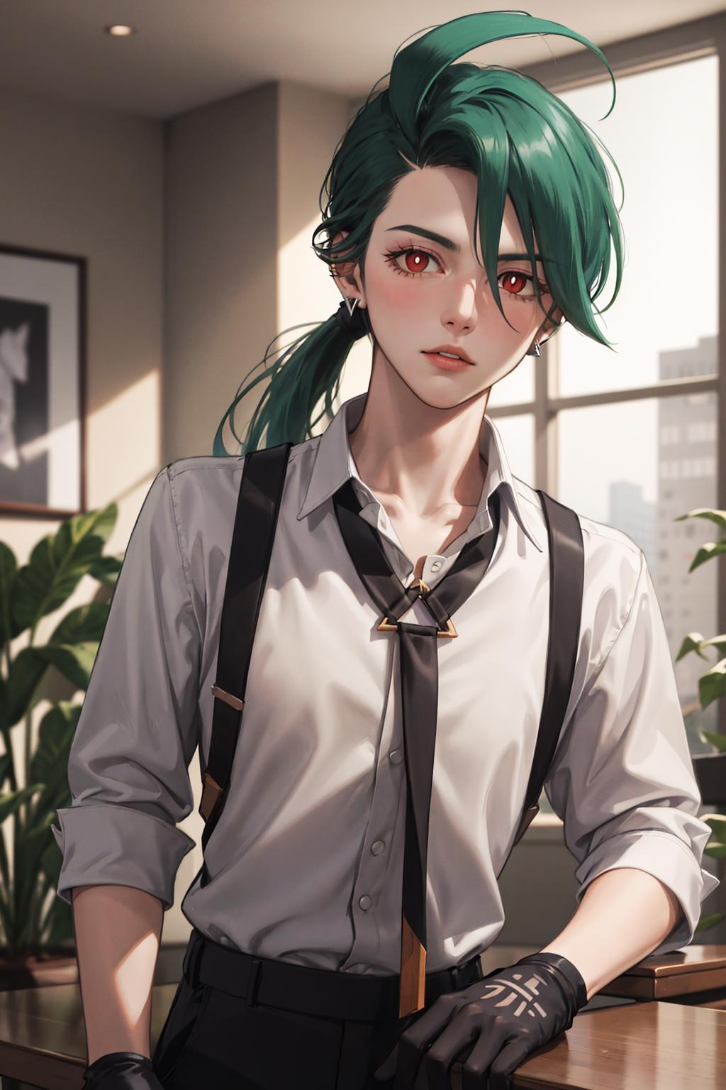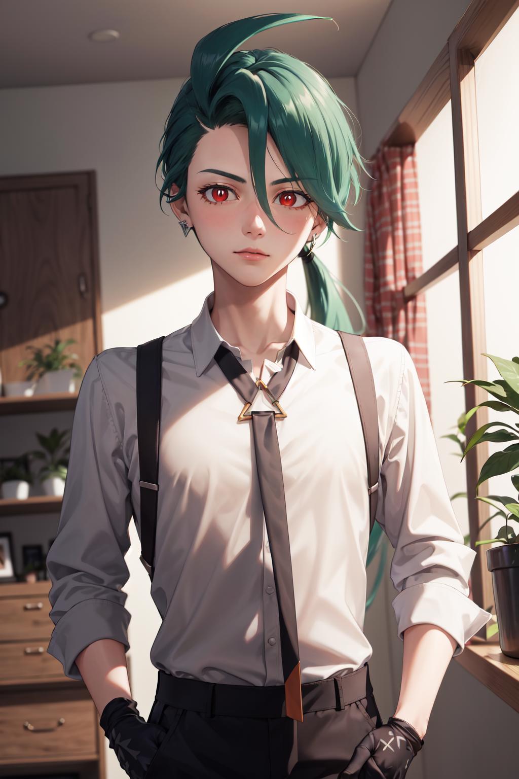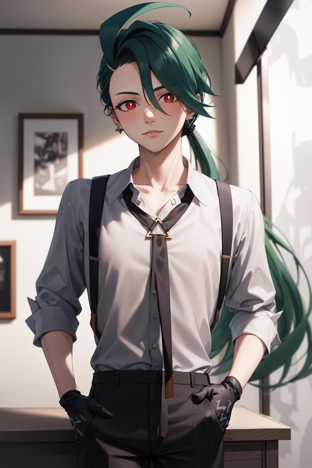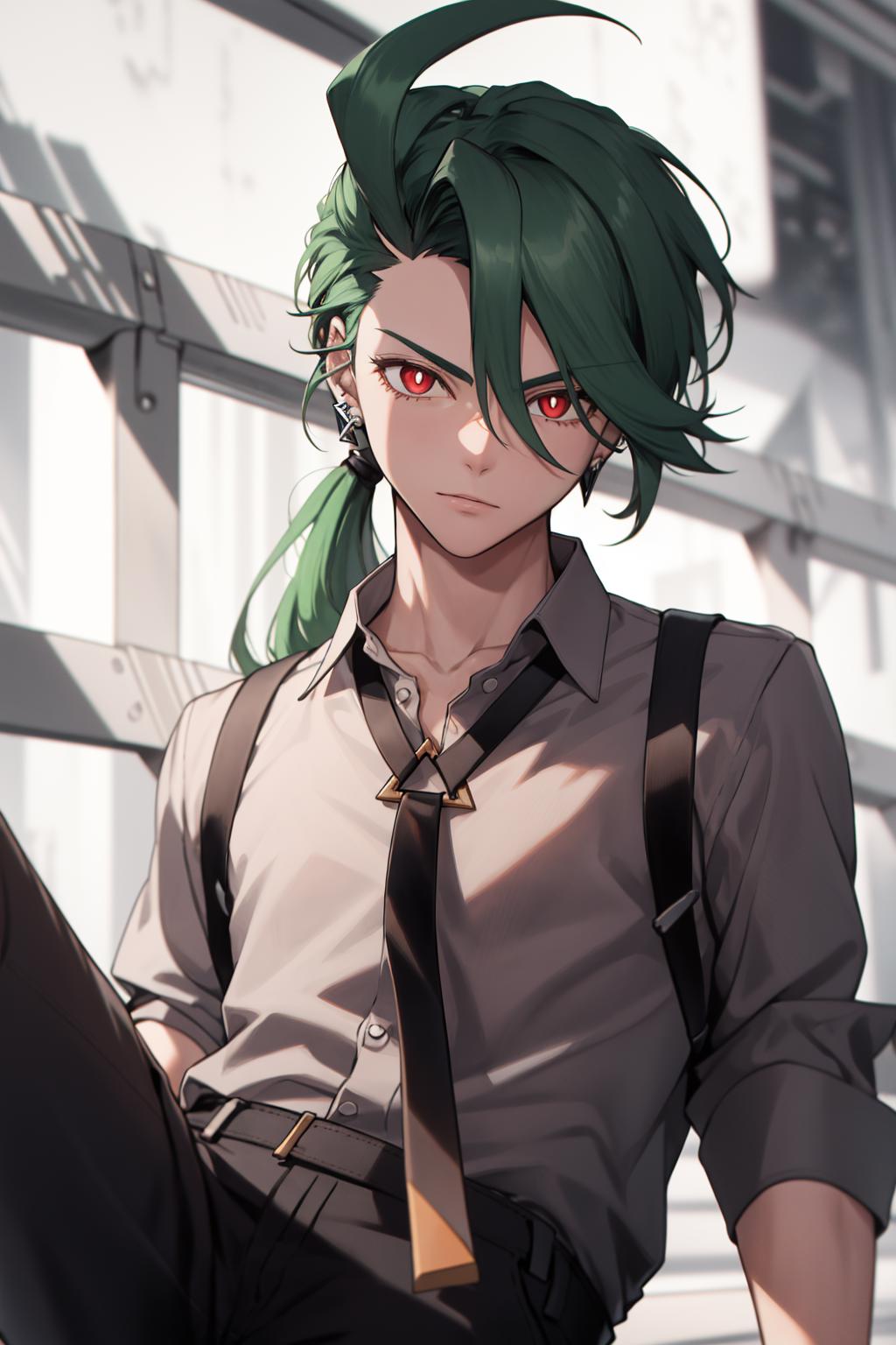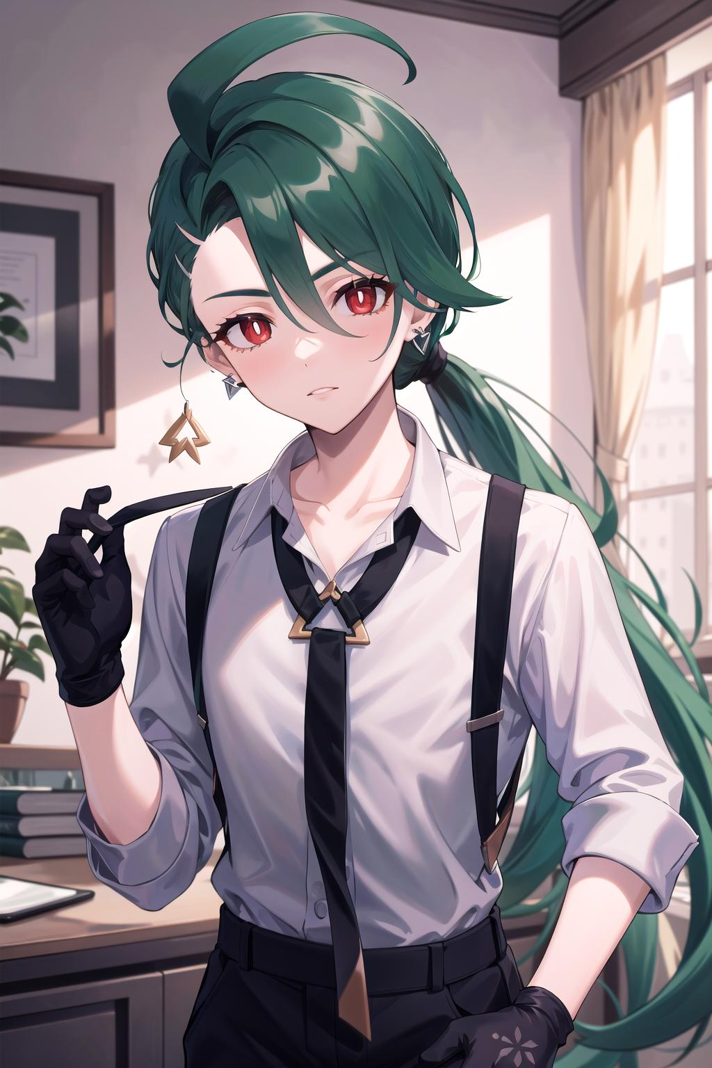 Default Outfit: grey collared shirt, necktie, suspenders, black pants, gloves, earrings