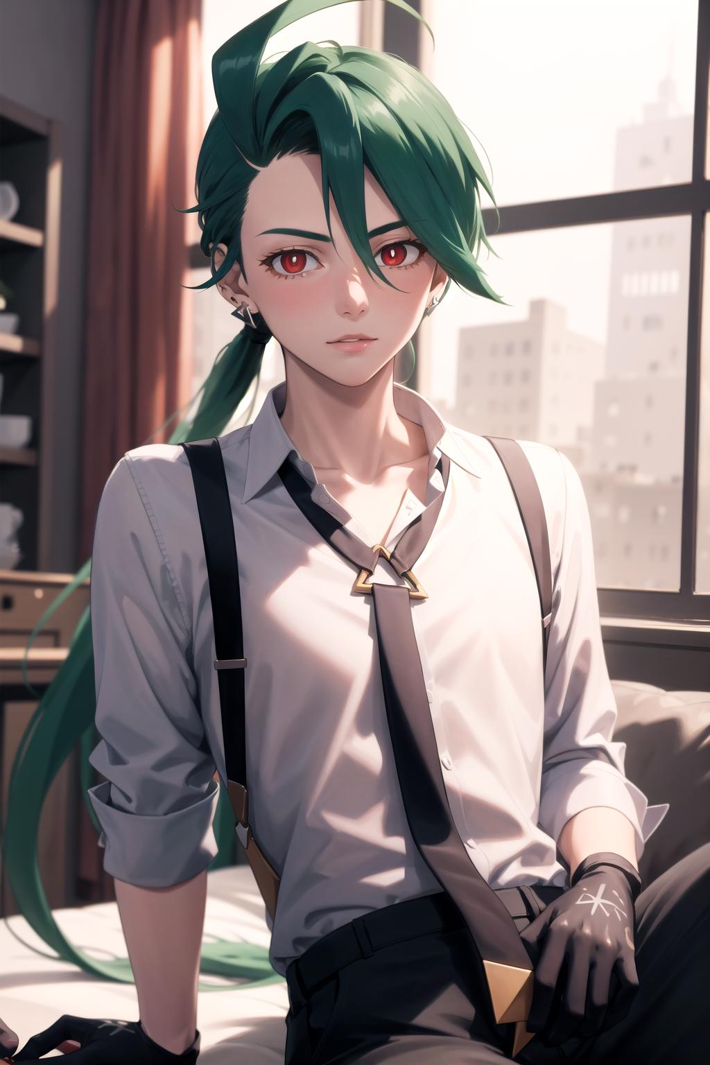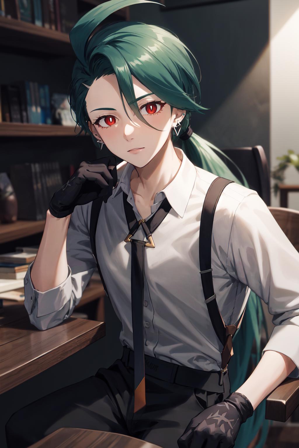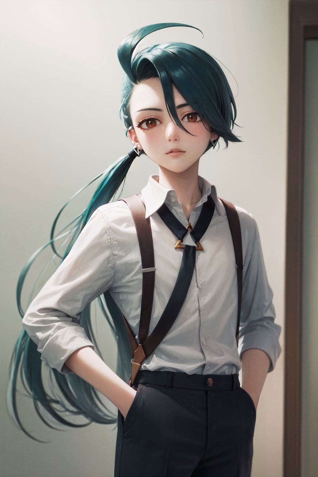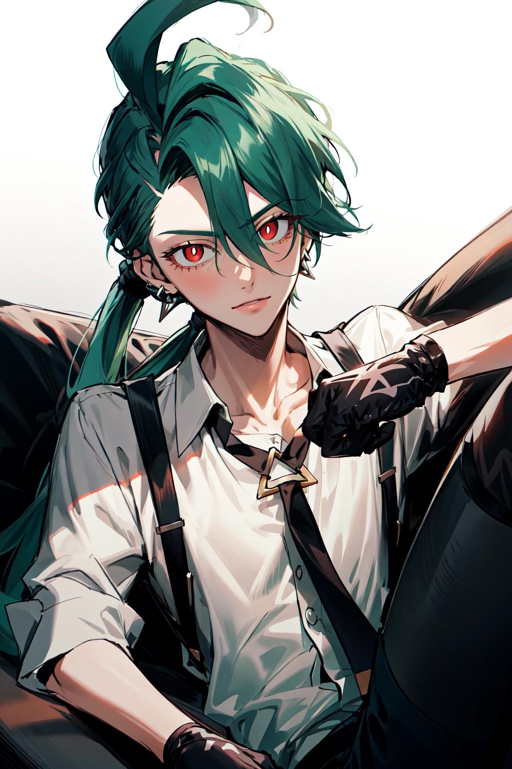 Default Outfit: grey collared shirt, necktie, suspenders, black pants, gloves, earrings